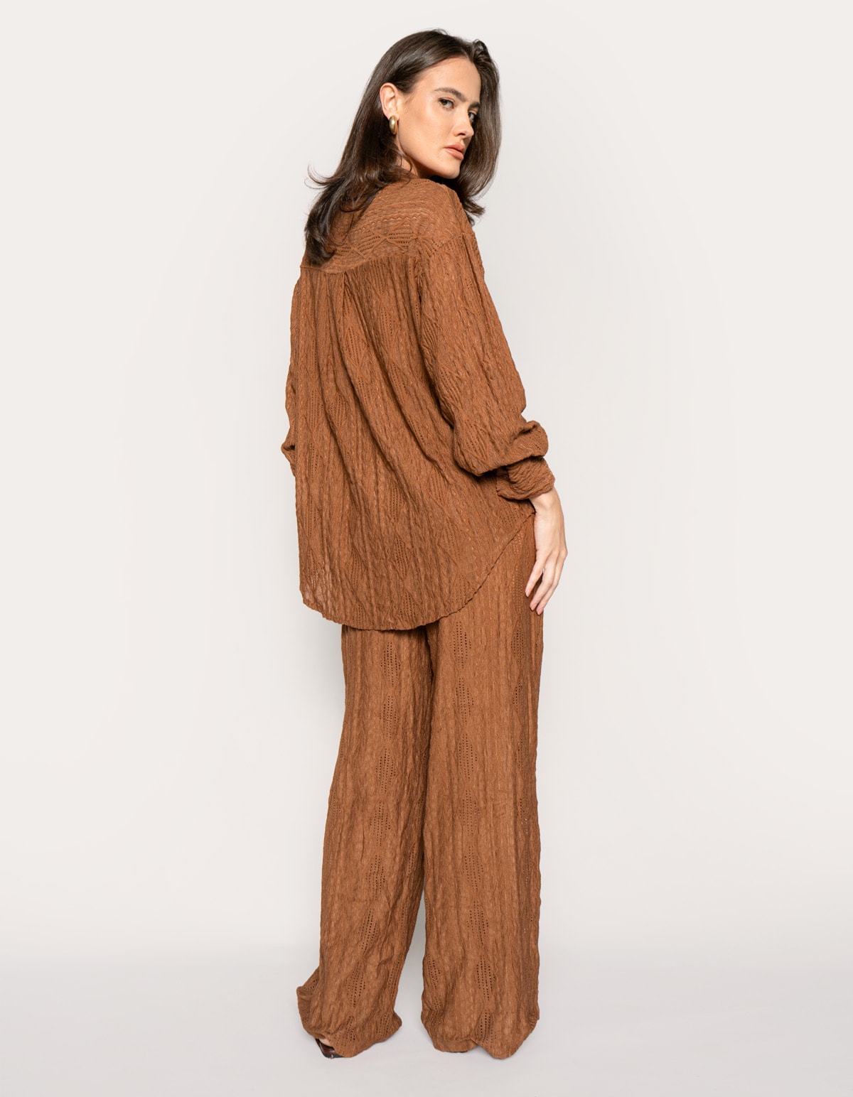 A união perfeita entre conforto absoluto e design arrojado. Confeccionado em tecido com textura exclusiva de efeito "cut-out" horizontal, este conjunto traz uma estética moderna e orgânica que não passa despercebida. A camisa possui modelagem solta com caimento impecável, enquanto a calça wide leg proporciona alongamento e liberdade de movimento. É a escolha ideal para quem busca um visual monocromático impactante, seja para um evento especial ou para um dia de trabalho com muita personalidade.