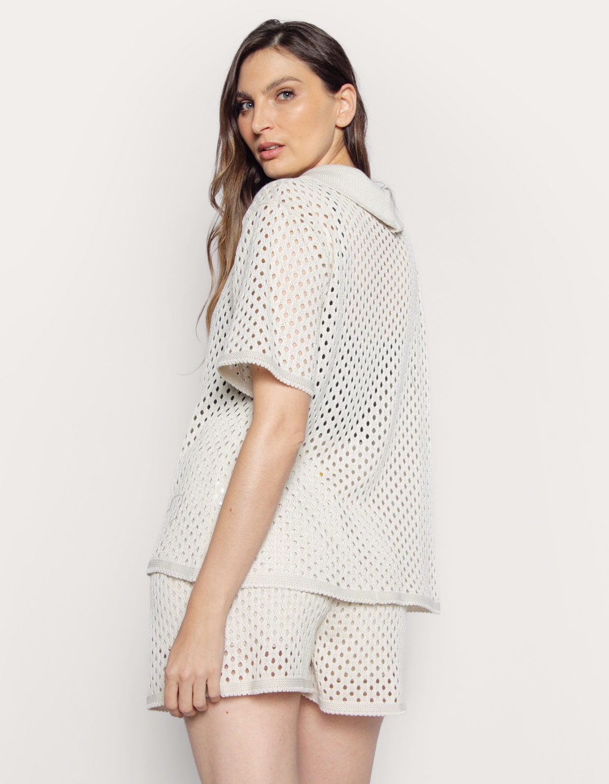 É um co-ord de duas peças, composto por camisa de manga curta e um shorts de tricot de ponto aberto rendadom que confere um visual leve e arejado, ideal para climas quentes. A camisa tem uma gola de ponta, possui mangas curtas, é abotoada na frente, o caimento é solto e reto. O short tem comprimento curto, a modelagem é confortável e mais solta na perna. Evocando uma estética vintage ou moda praia/resort, sendo uma peça artesanal e charmosa.