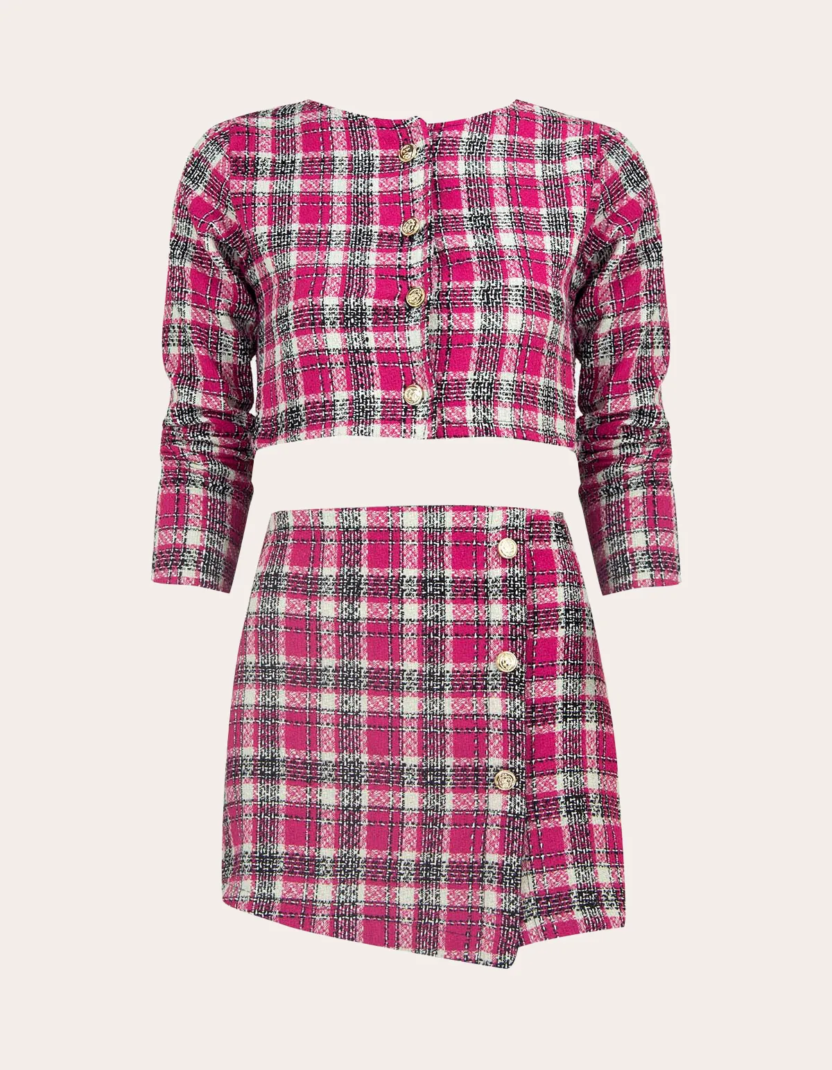 Apresentamos um conjunto em tweed que une elegância e estilo. o casaco cropped possui um acabamento em botões, proporcionando um toque sofisticado ao visual. a saia complementa o conjunto com detalhes de botões e fechamento em zíper, adicionando um toque refinado. essa combinação é ideal para criar um look elegante e moderno, perfeito para diversas ocasiões.