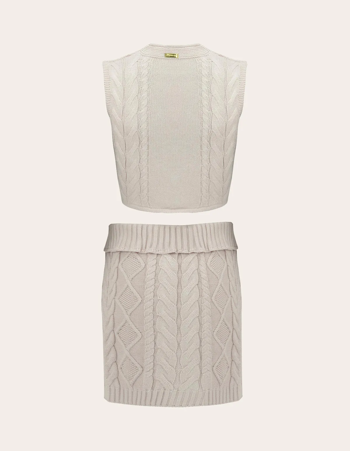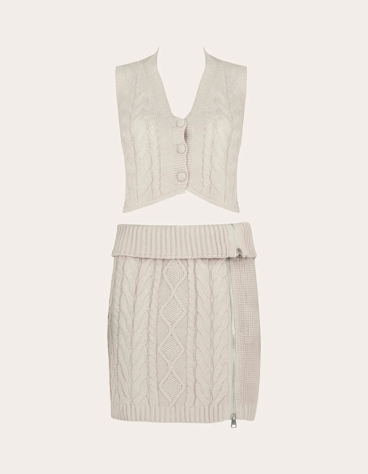 Apresentamos um conjunto em tricot que combina estilo e conforto, composto por um colete com botões e uma saia curta. o colete adiciona um toque elegante com seus botões, enquanto a saia curta possui um detalhe de zíper na frente e um cós alto que pode ser usado dobrado para variar o visual. essa combinação é perfeita para criar um look moderno e versátil, adequado para diversas ocasiões.