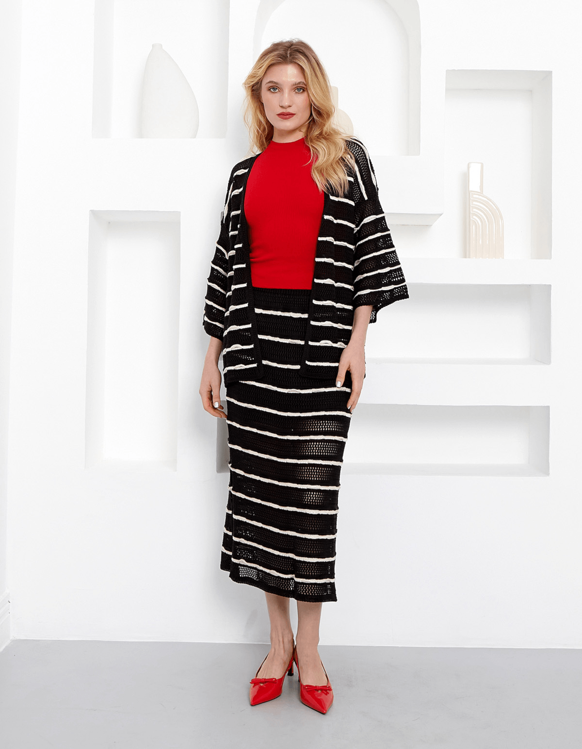 Conj kimono+saia midi tricot listrado
