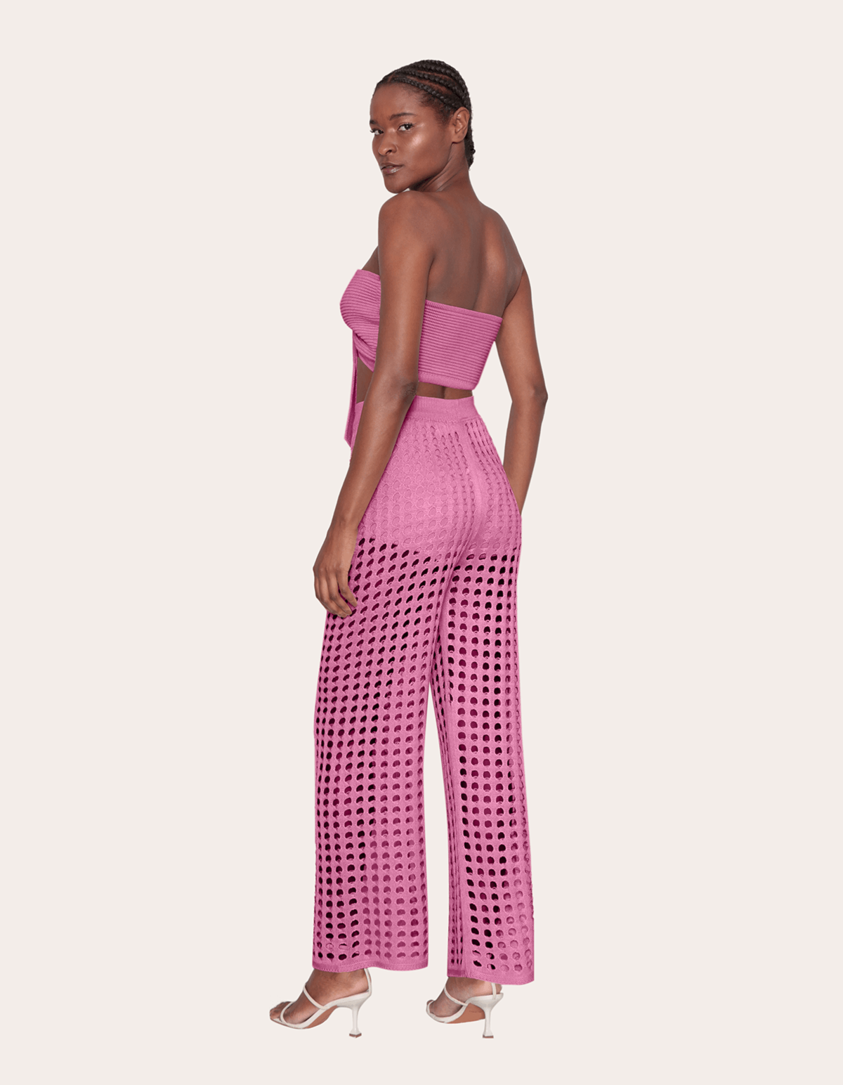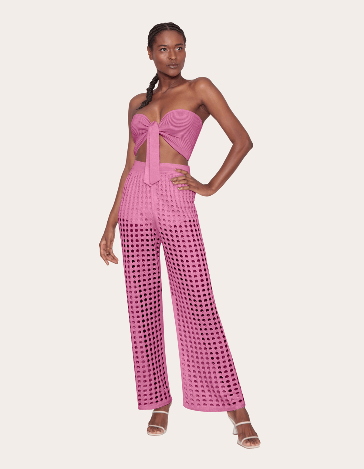 Conjunto trio composto por top tricot canelado com detalhe para amarração + calcinha hot pants+ calça pantalona tela. casualidade ganha uma dose extra de glamour neste conjunto! de busto em tomara que caia e uma calça ampla, o look remete à um visual super fresh, que é a cara do verão.