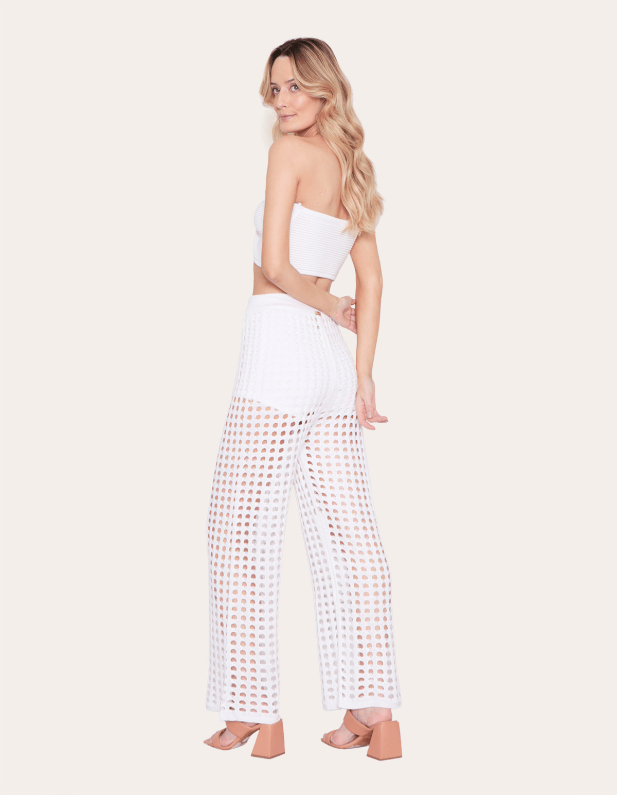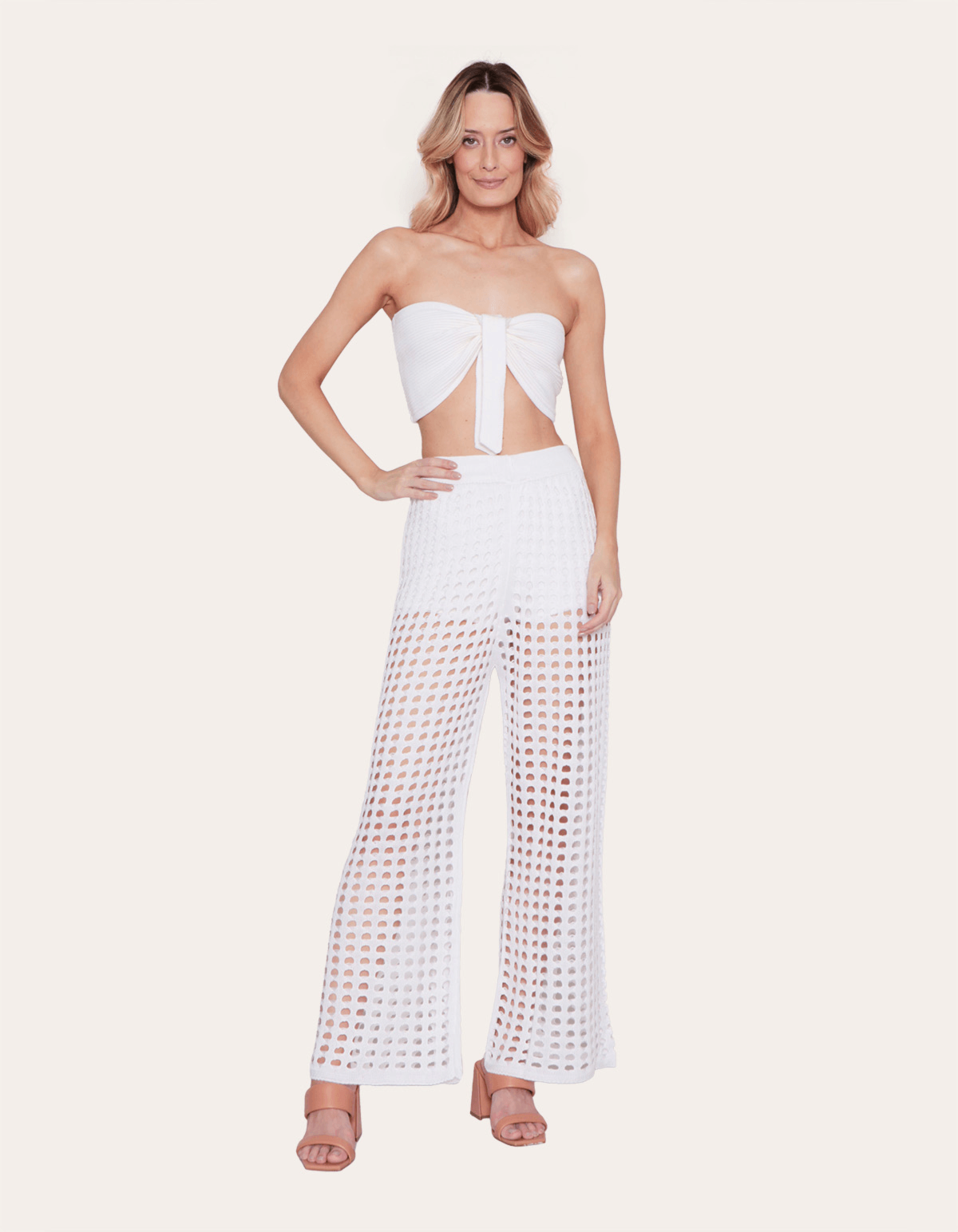 Conjunto trio composto por top tricot canelado com detalhe para amarração + calcinha hot pants+ calça pantalona tela. casualidade ganha uma dose extra de glamour neste conjunto! de busto em tomara que caia e uma calça ampla, o look remete à um visual super fresh, que é a cara do verão.