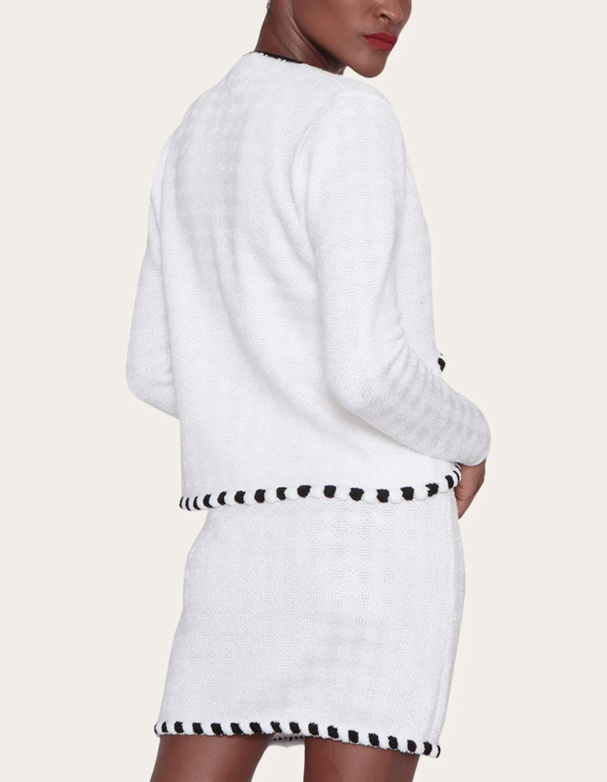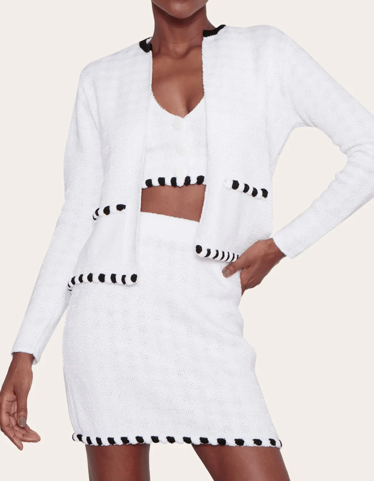 Conjunto confeccionado em tricot mousse, acompanha 3 peças: colete cropped com botões, casaquinho e saia curta. é o clássico que você precisa ter no armário.