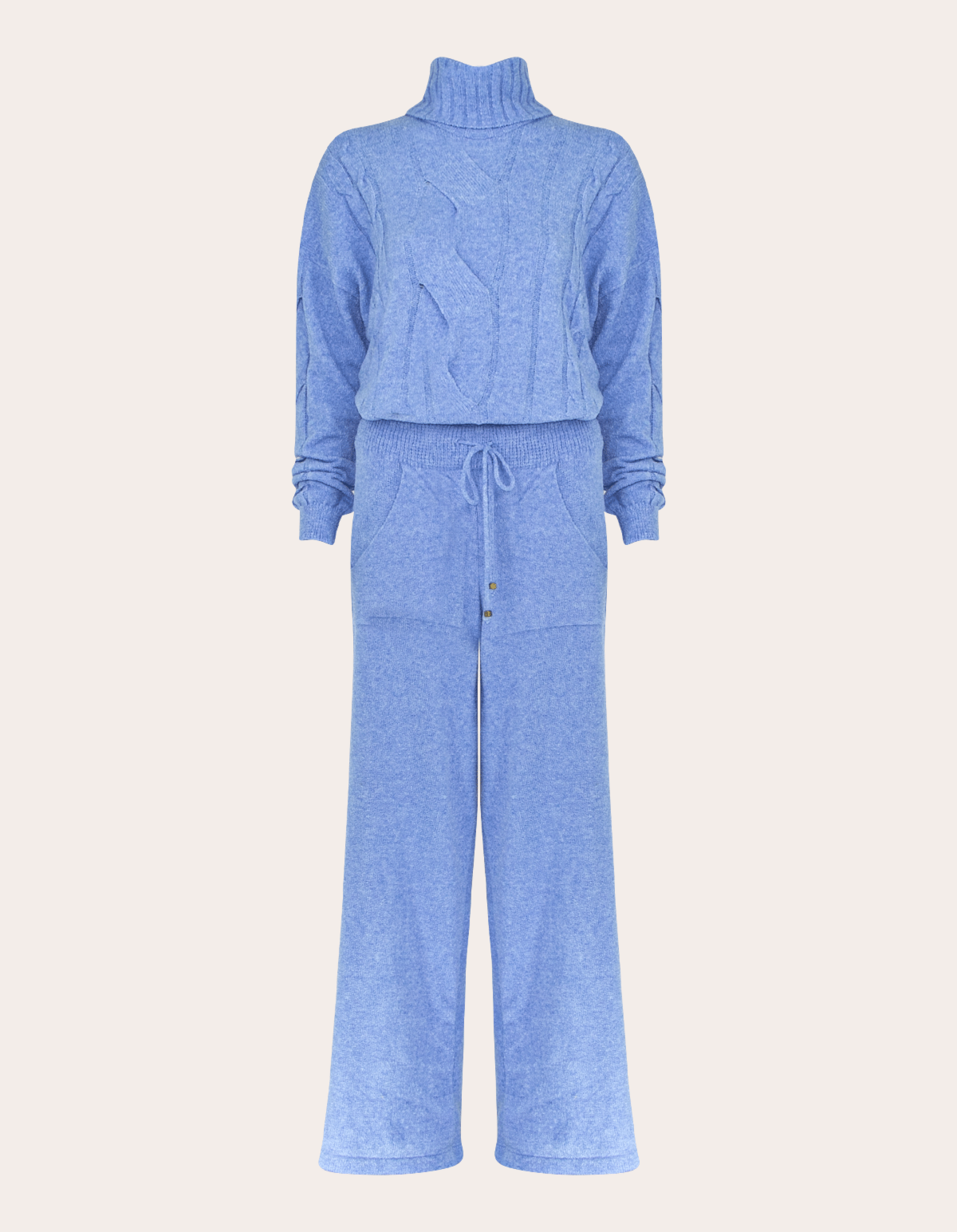 Conjunto tricot mousse com blusa gola alta com detalhe trança e calça pantalona com bolsos na frente e detalhe para ajuste e amarração no cós. modelo perfeito para quem busca conforto, estilo e praticidade.