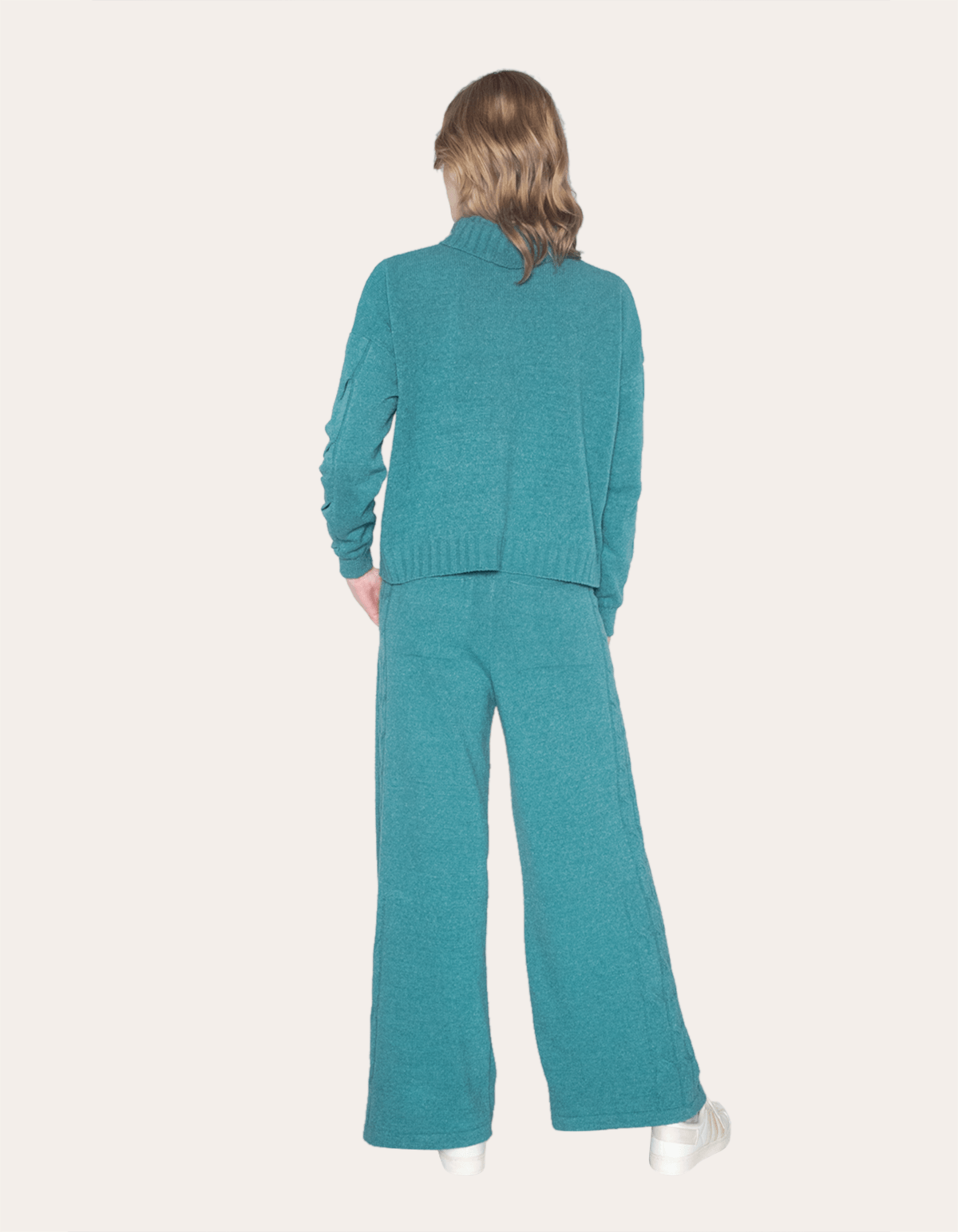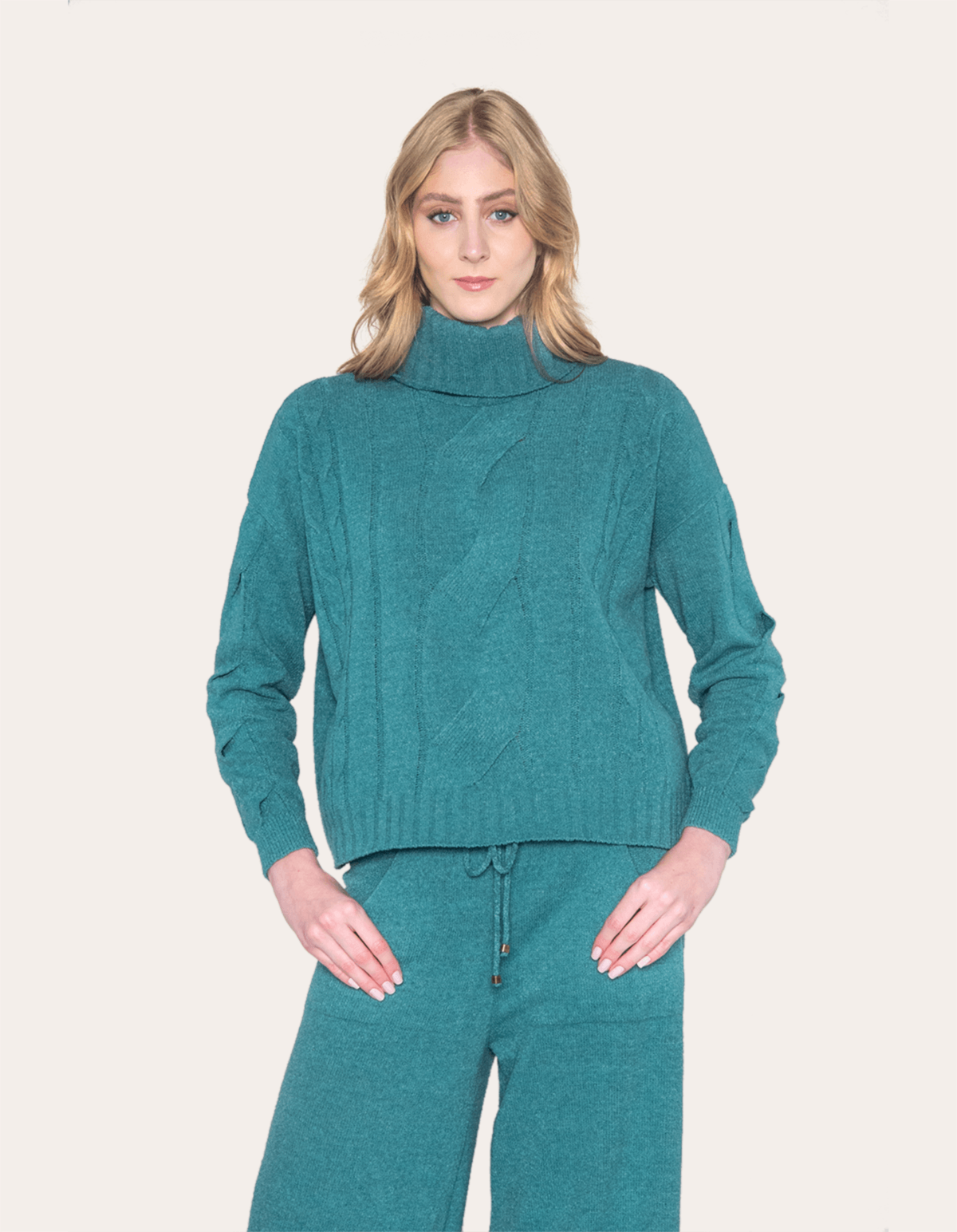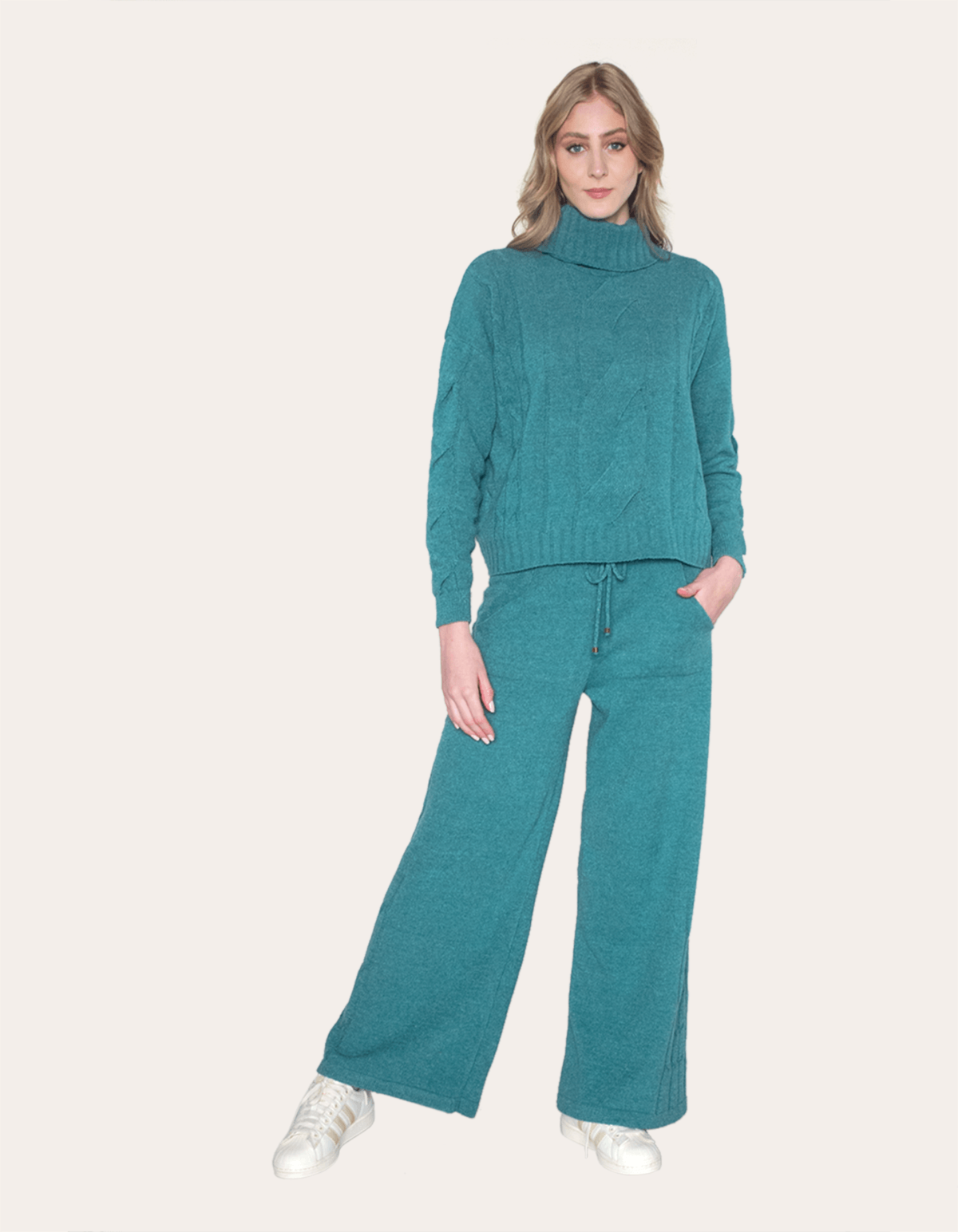 Conjunto tricot mousse com blusa gola alta com detalhe trança e calça pantalona com bolsos na frente e detalhe para ajuste e amarração no cós. modelo perfeito para quem busca conforto, estilo e praticidade.