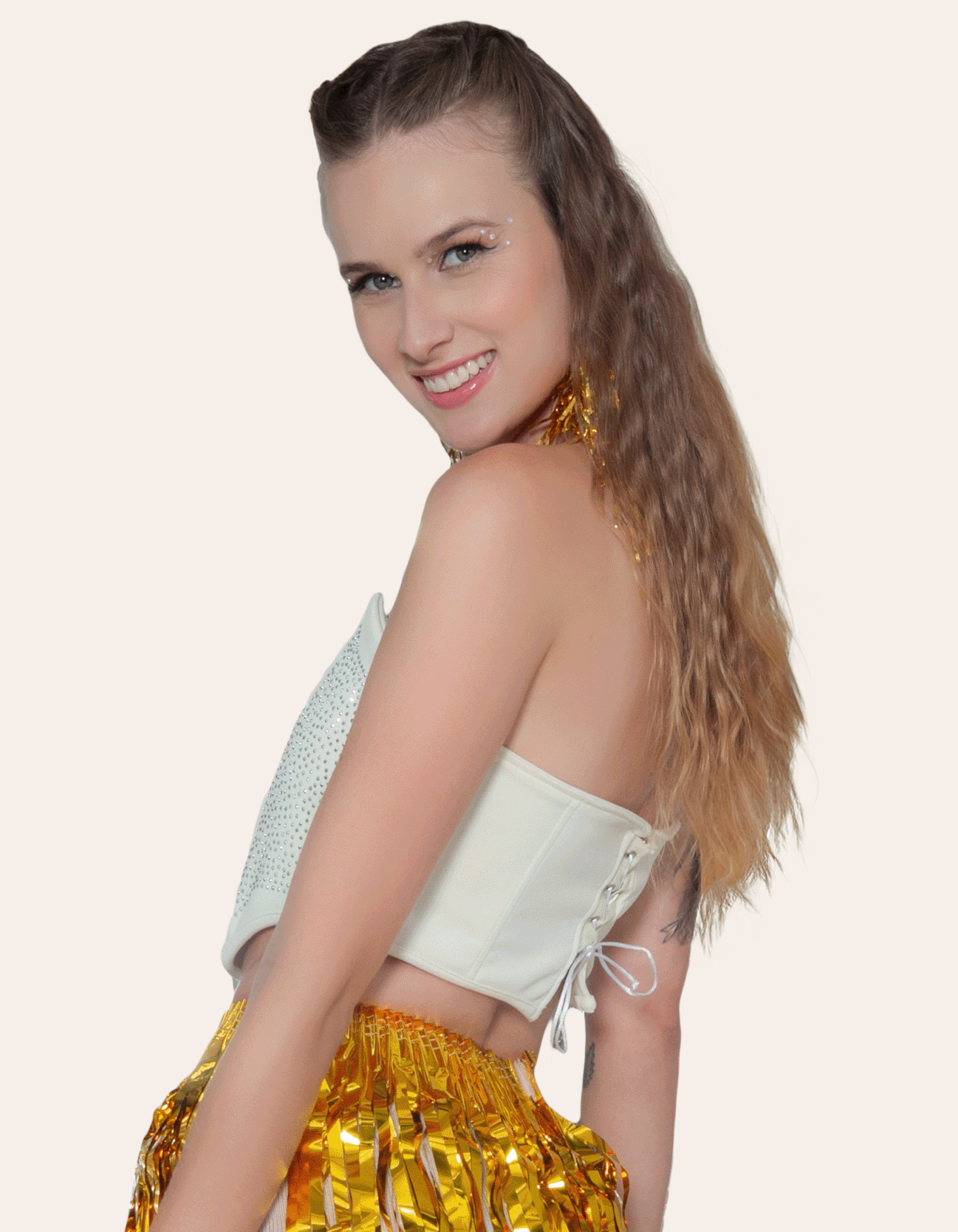 Nosso cropped corselete com pedraria strass tomara que caia é a escolha perfeita para mulheres que desejam se destacar em ocasiões especiais.