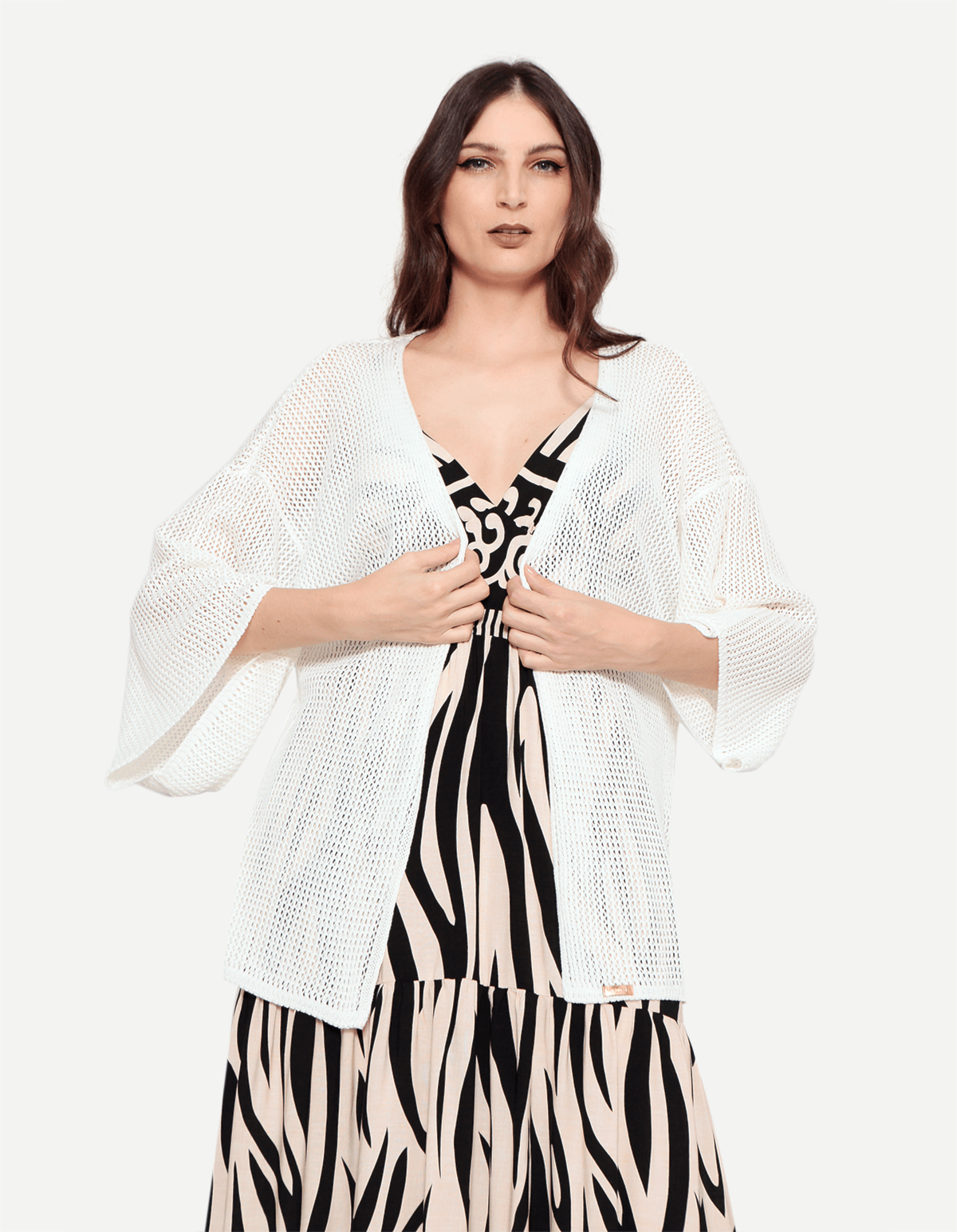 Apresentamos o kimono de tricot com manga 3/4, uma peça que une conforto e estilo de forma excepcional. com mangas 3/4, proporciona um visual leve e versátil, perfeito para diferentes ocasiões.