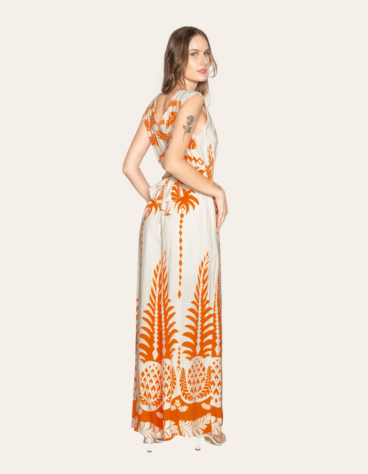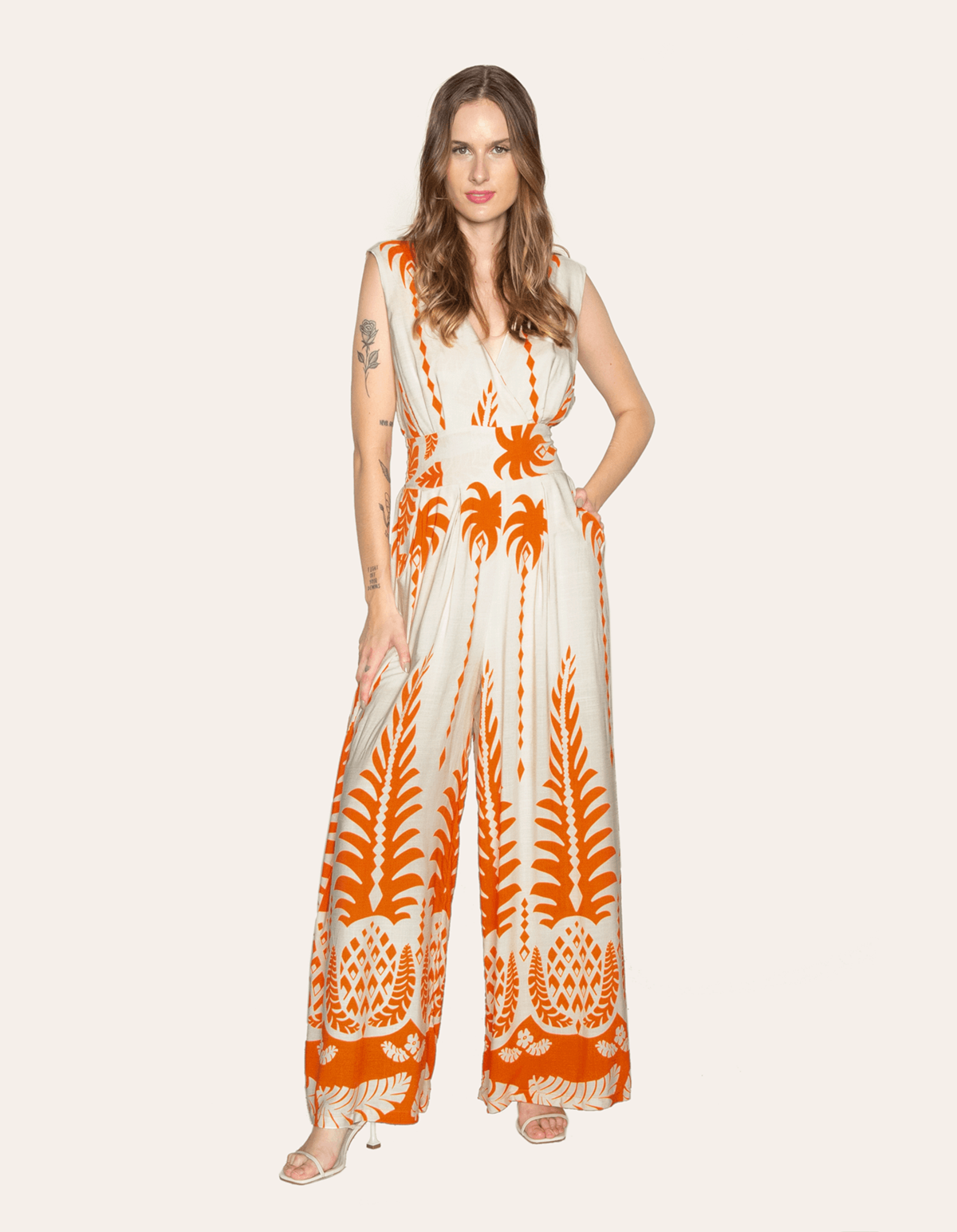 Macacão estampado, decote v transpassado, calça pantalona, possui lastex nas costas e faixa embutida. perfeito para um look casual e sair com as amigas.