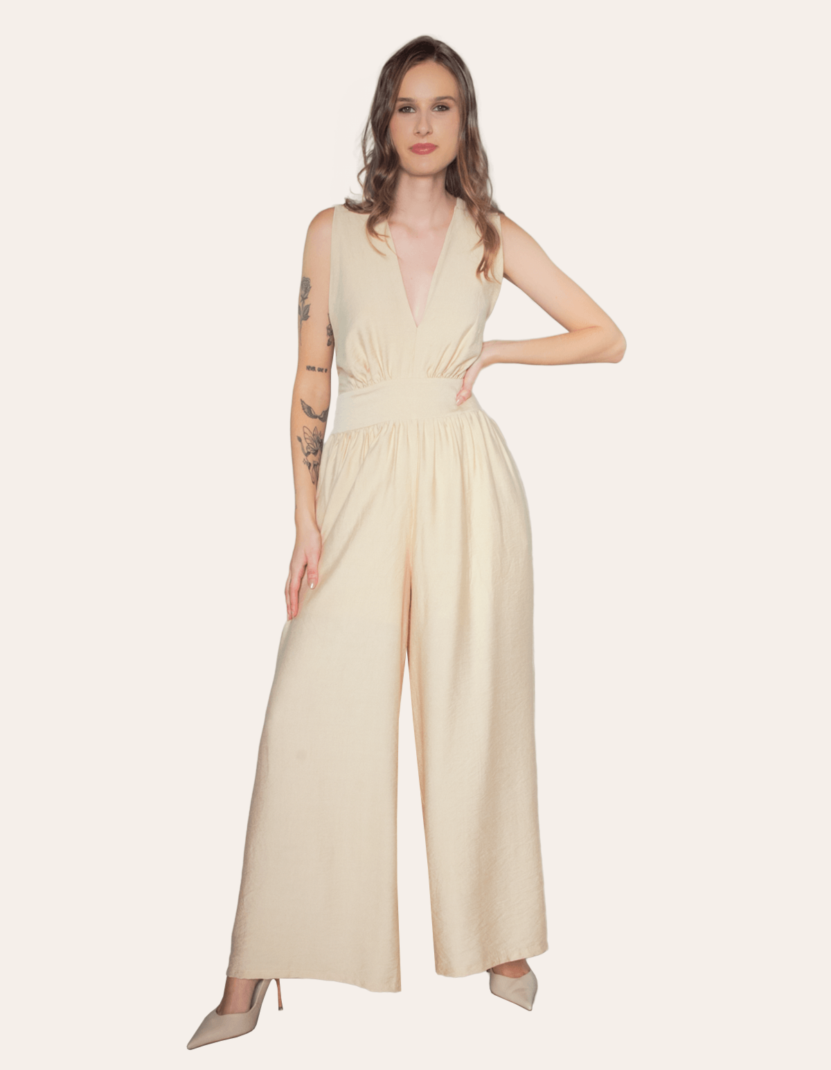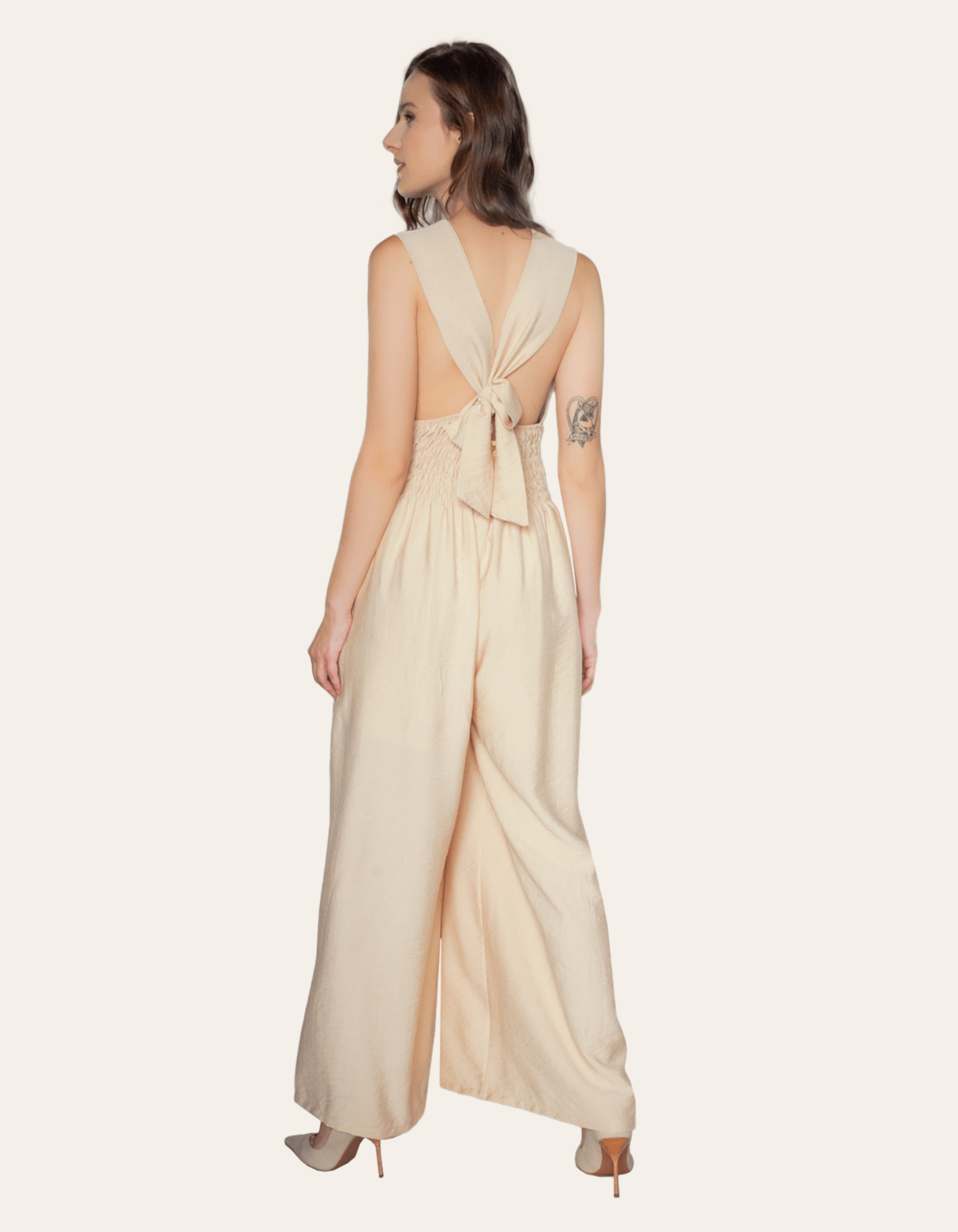Macacão com decote v e faixa para amarração nas costas, possui lastex somente atrás na cintura. é a escolha perfeita para mulheres modernas e elegantes. feito de materiais de alta qualidade, que garante conforto e durabilidade.