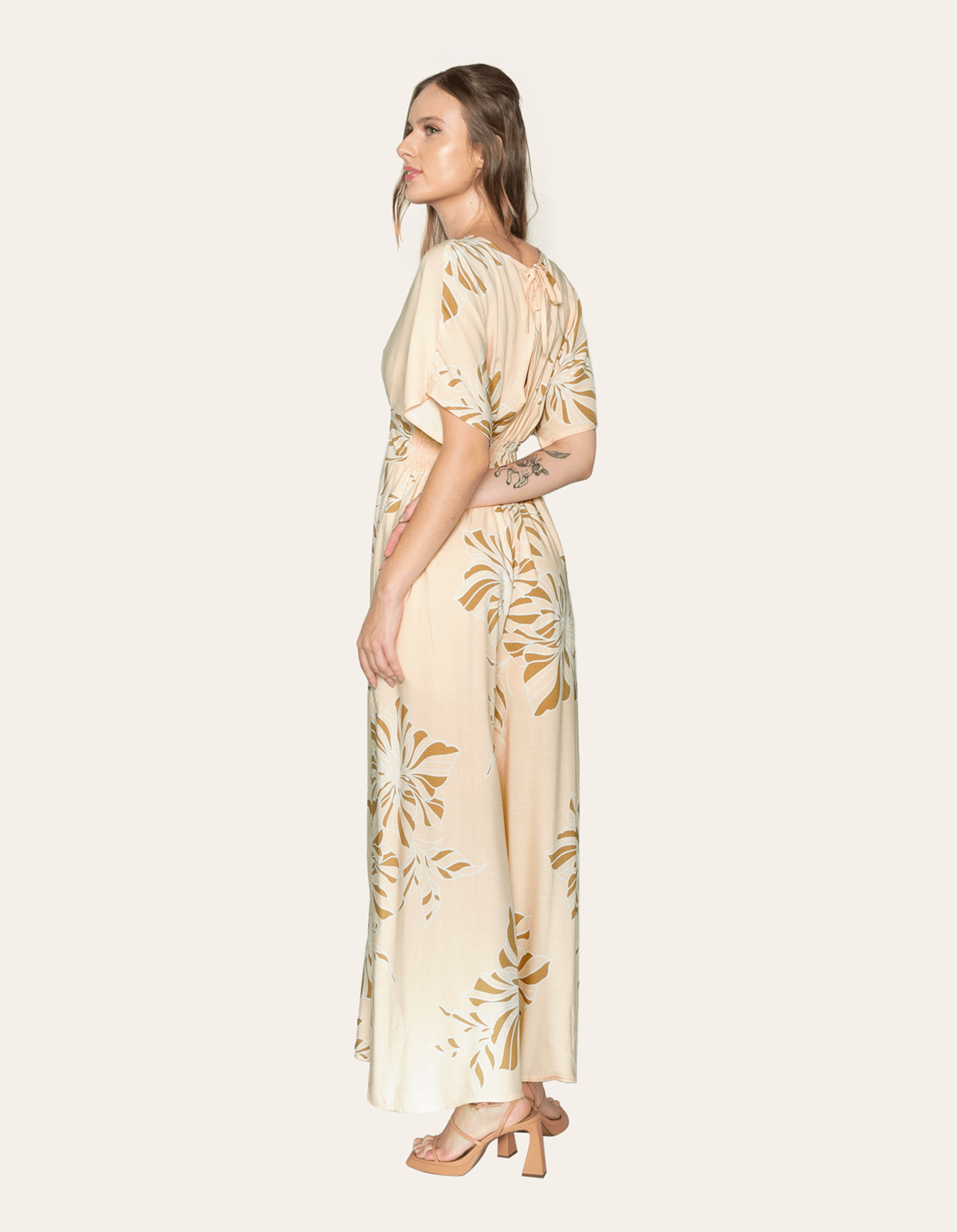 Macacão estampado manga curta morcego, decote v, detalhe viés nas costas para amarrar. possui lastex na cintura, parte de trás. sofisticado e confortável, aquela peça que colocou e já está pronta para qualquer ocasião!