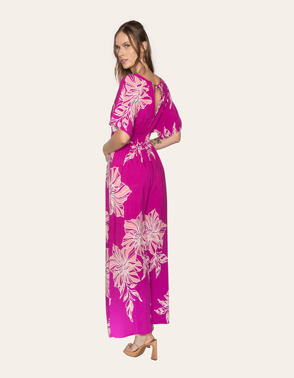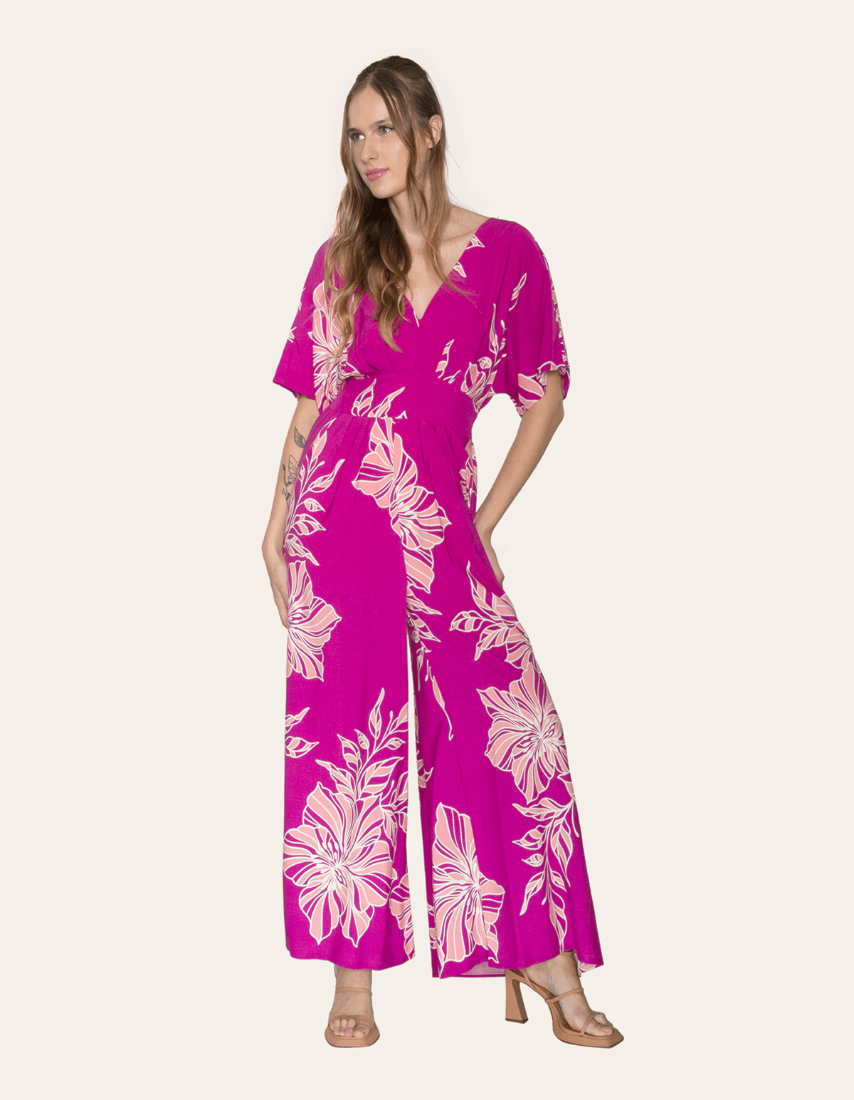 Macacão estampado manga curta morcego, decote v, detalhe viés nas costas para amarrar. possui lastex na cintura, parte de trás. sofisticado e confortável, aquela peça que colocou e já está pronta para qualquer ocasião!