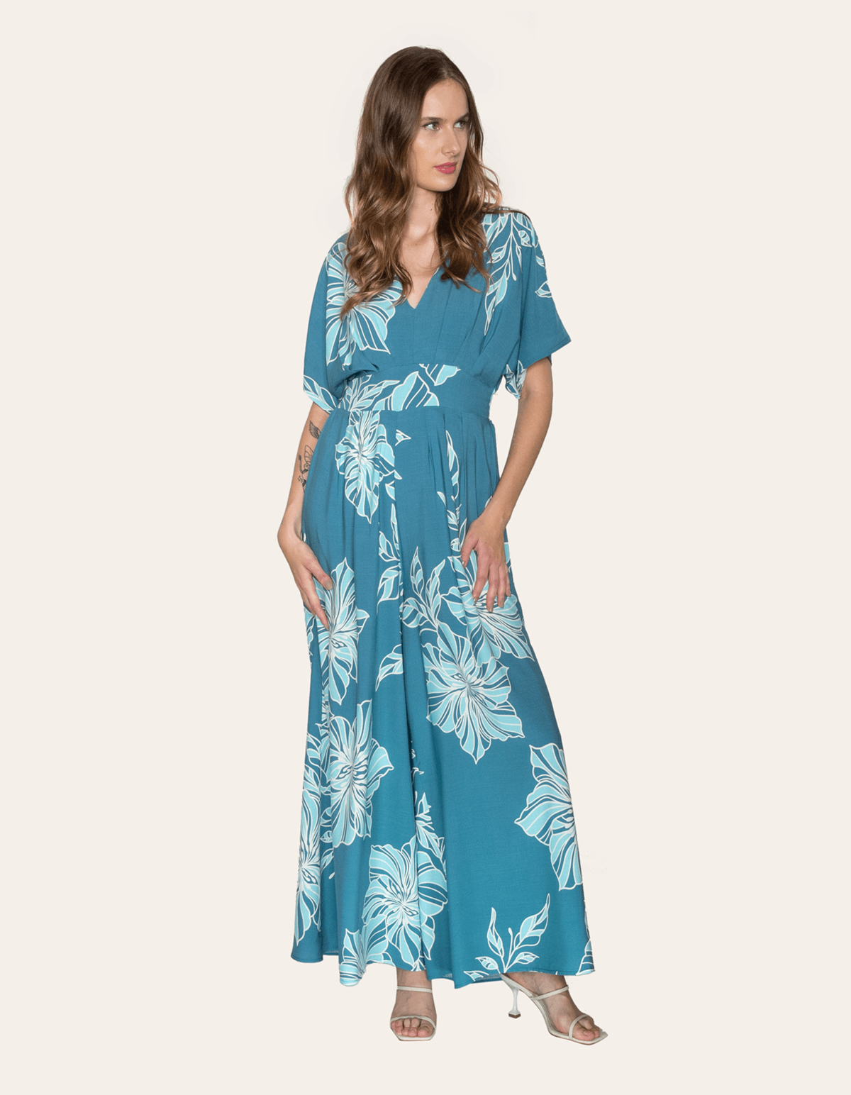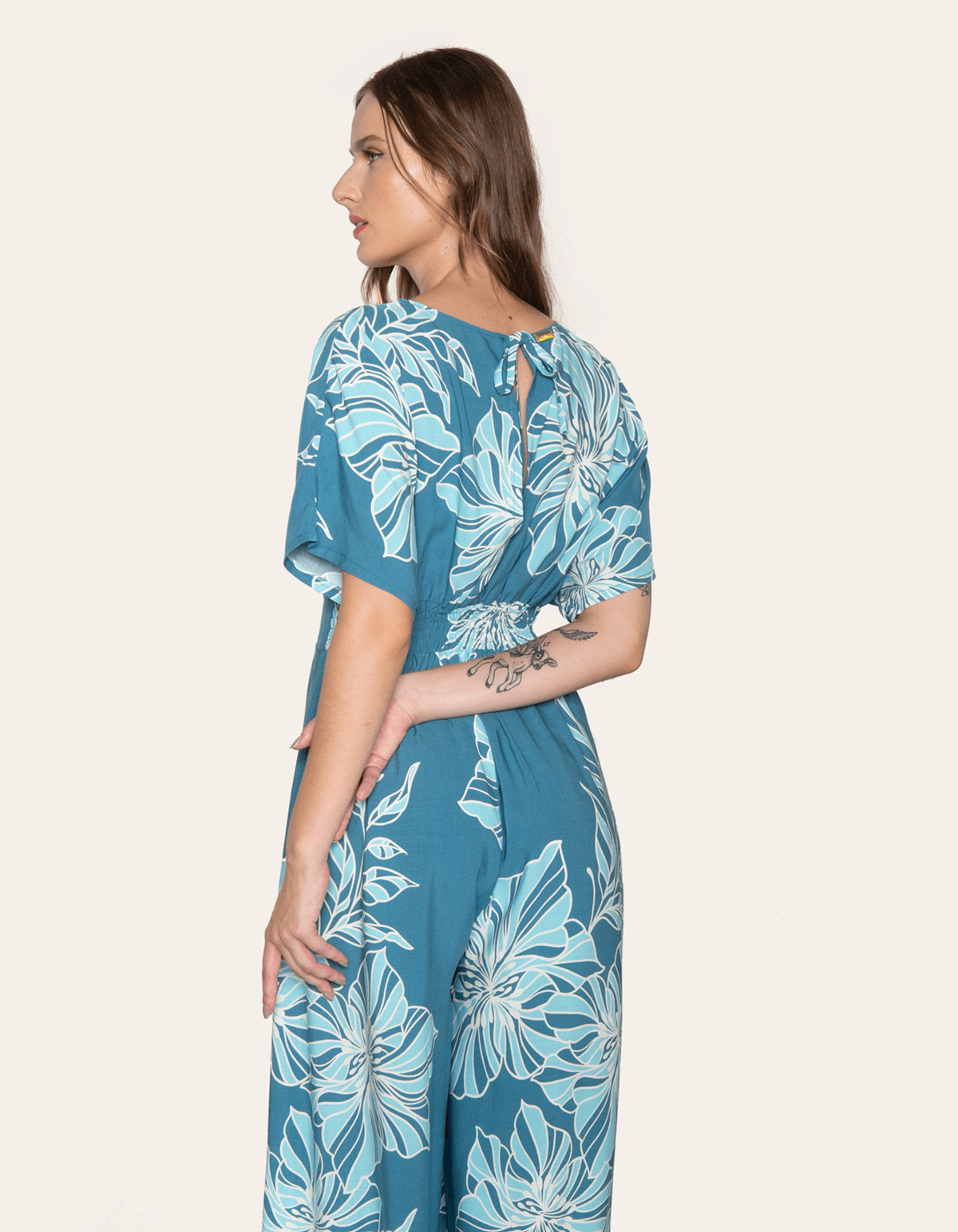 Macacão estampado manga curta morcego, decote v, detalhe viés nas costas para amarrar. possui lastex na cintura, parte de trás. sofisticado e confortável, aquela peça que colocou e já está pronta para qualquer ocasião!