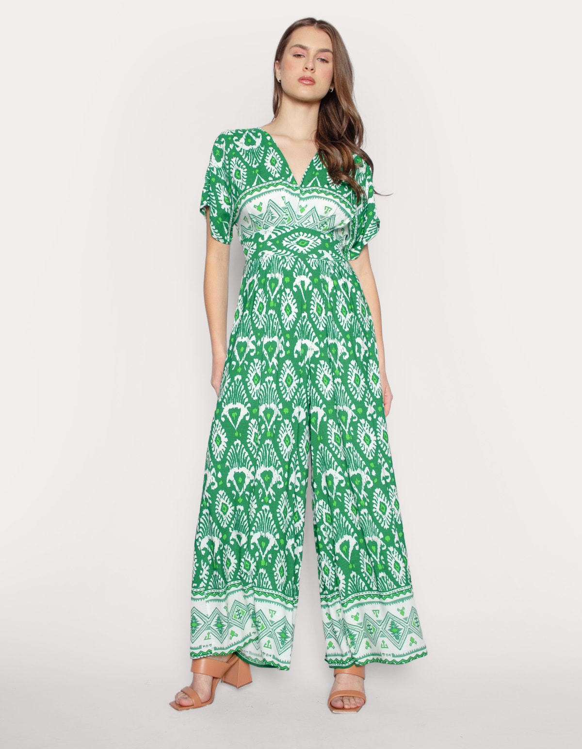 Macacão estampado manga curta morcego, decote v, detalhe viés nas costas para amarrar. possui lastex na cintura, parte de trás. sofisticado e confortável, aquela peça que colocou e já está pronta para qualquer ocasião!