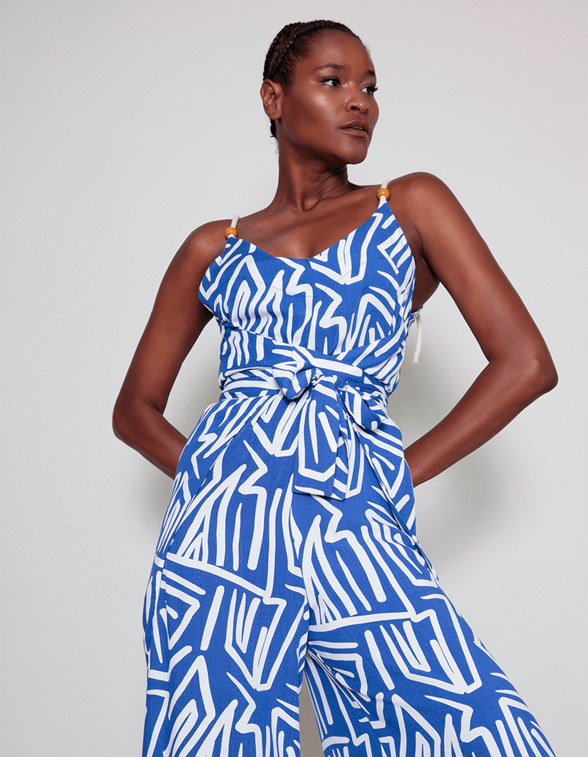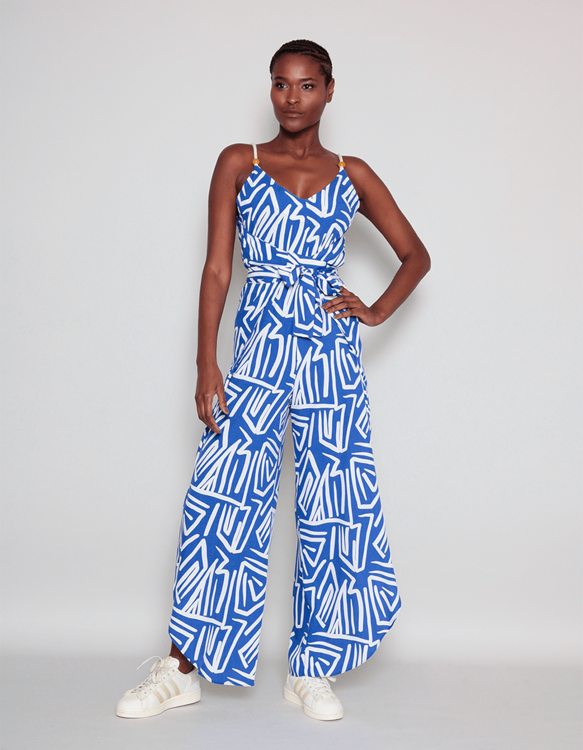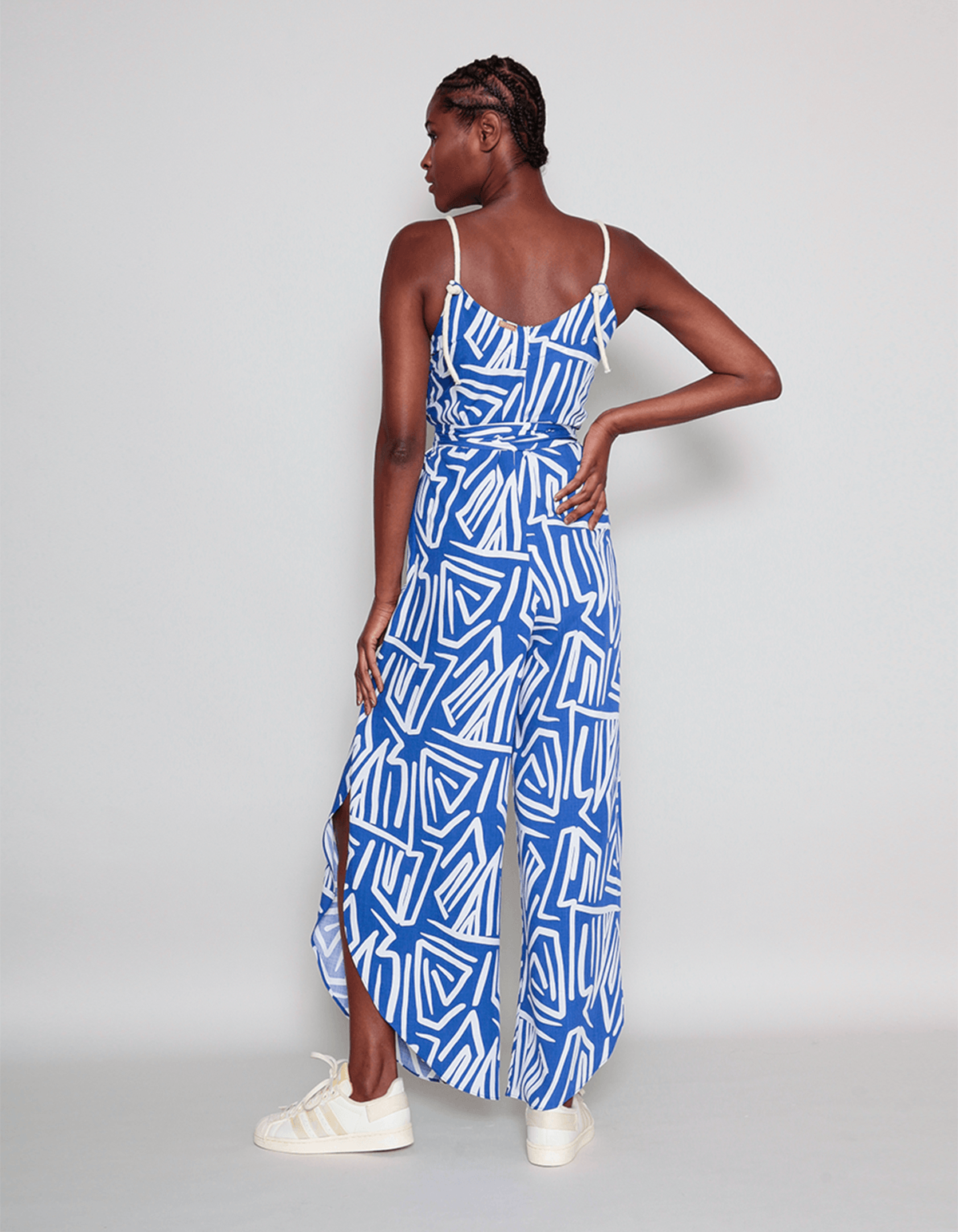 Macacão estampado decote v, alcinha cadarço com detalhe de argola amadeirada, possui fendas nas laterais da barra e um faixa embutida para amarrar atrás ou na frente dando um ajuste maior e modelando o macacão ao corpo. perfeito para várias ocasiões com versatilidade e elegância.