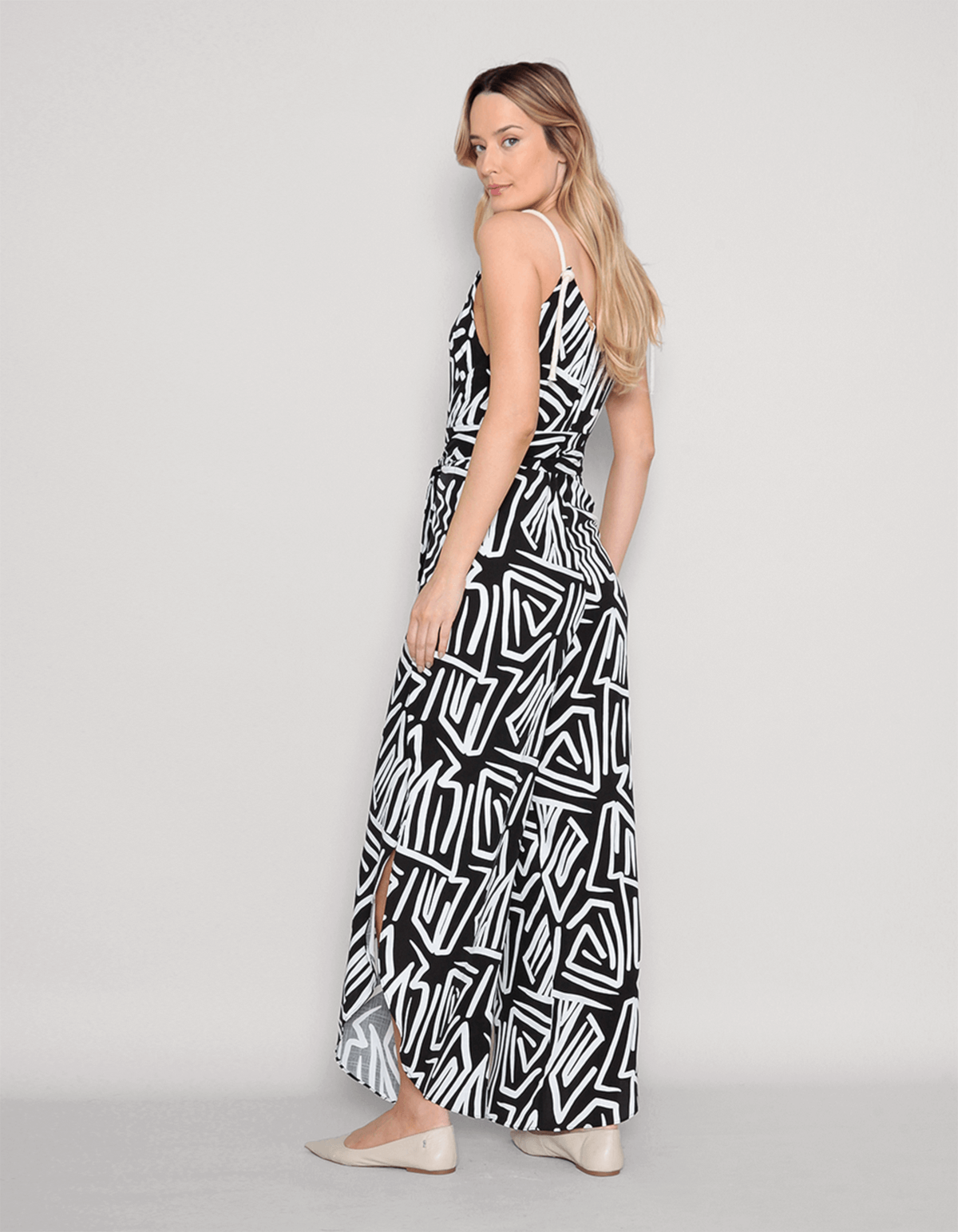 Macacão estampado decote v, alcinha cadarço com detalhe de argola amadeirada, possui fendas nas laterais da barra e um faixa embutida para amarrar atrás ou na frente dando um ajuste maior e modelando o macacão ao corpo. perfeito para várias ocasiões com versatilidade e elegância.