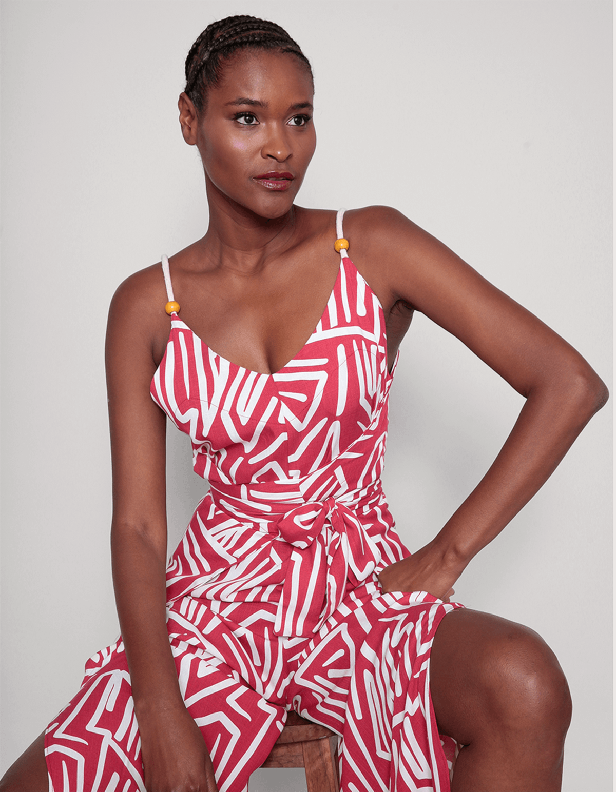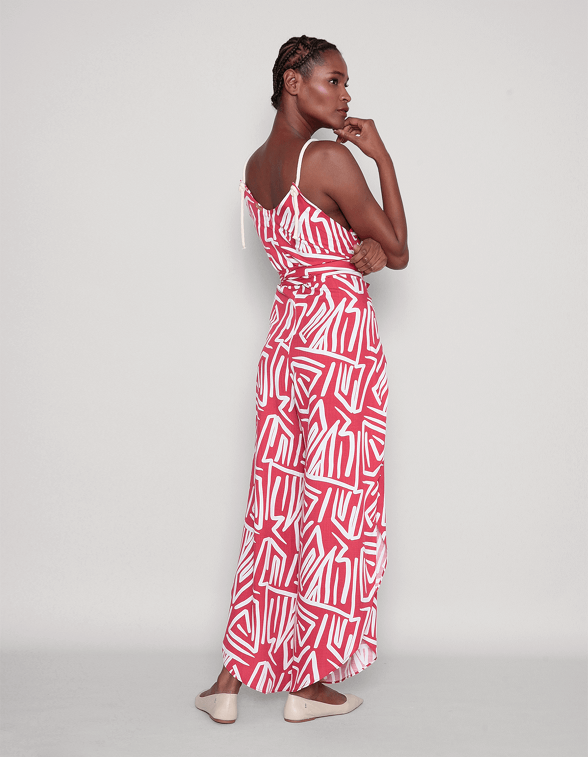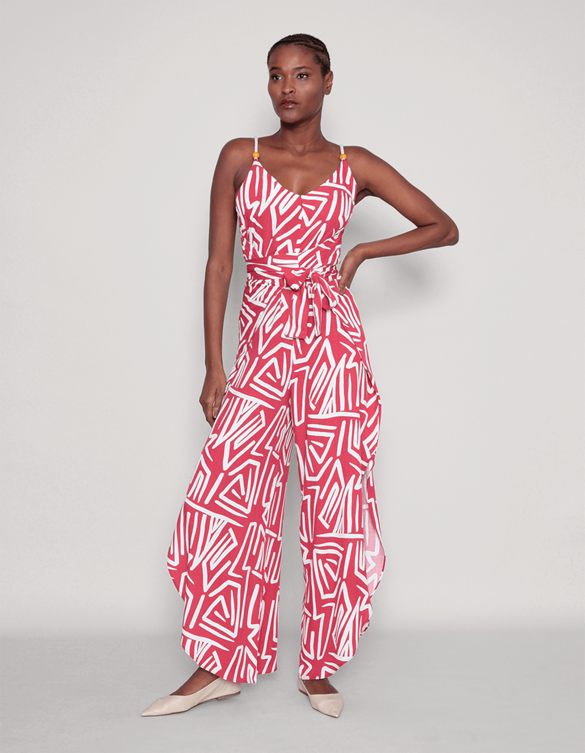 Macacão estampado decote v, alcinha cadarço com detalhe de argola amadeirada, possui fendas nas laterais da barra e um faixa embutida para amarrar atrás ou na frente dando um ajuste maior e modelando o macacão ao corpo. perfeito para várias ocasiões com versatilidade e elegância.