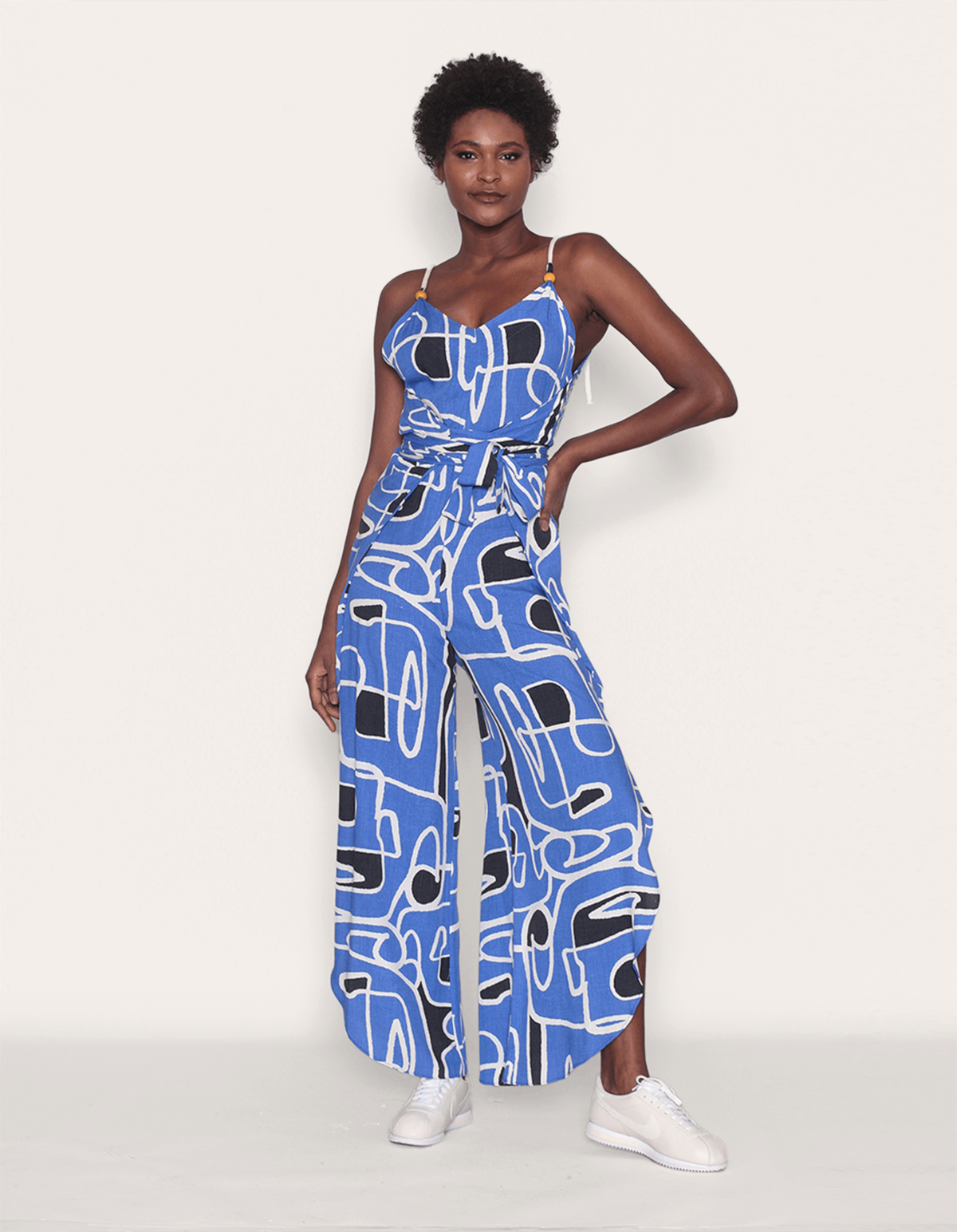 Macacão estampado decote v, alcinha cadarço com detalhe de argola amadeirada, possui fendas nas laterais da barra e um faixa embutida para amarrar atrás ou na frente dando um ajuste maior e modelando o macacão ao corpo. perfeito para várias ocasiões com versatilidade e elegância.