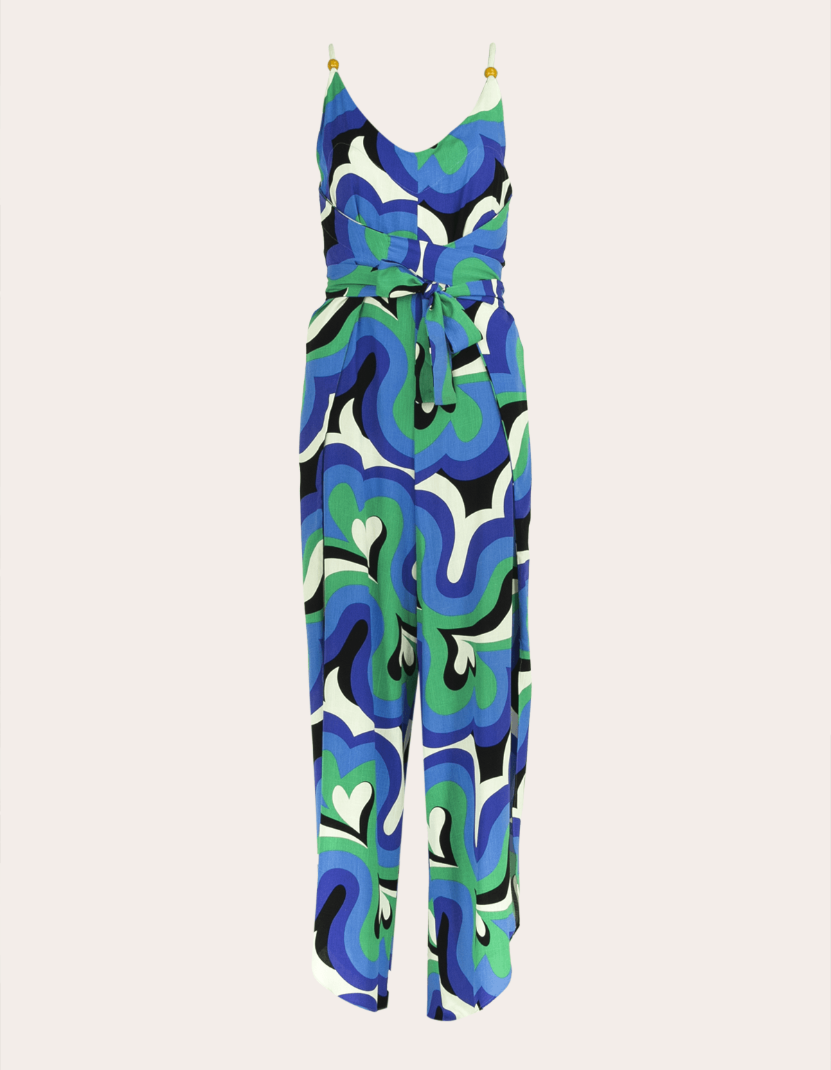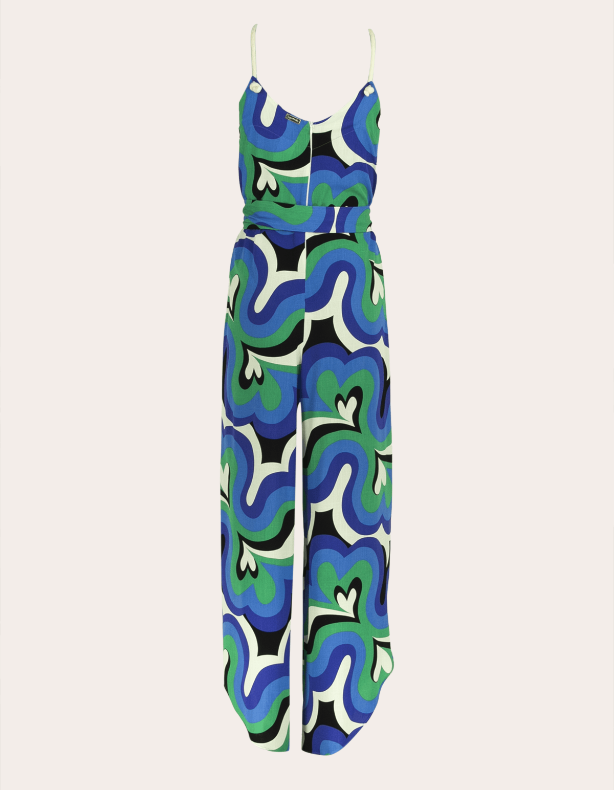 Macacão estampado decote v, alcinha cadarço com detalhe de argola amadeirada, possui fendas nas laterais da barra e um faixa embutida para amarrar atrás ou na frente dando um ajuste maior e modelando o macacão ao corpo. perfeito para várias ocasiões com versatilidade e elegância.
