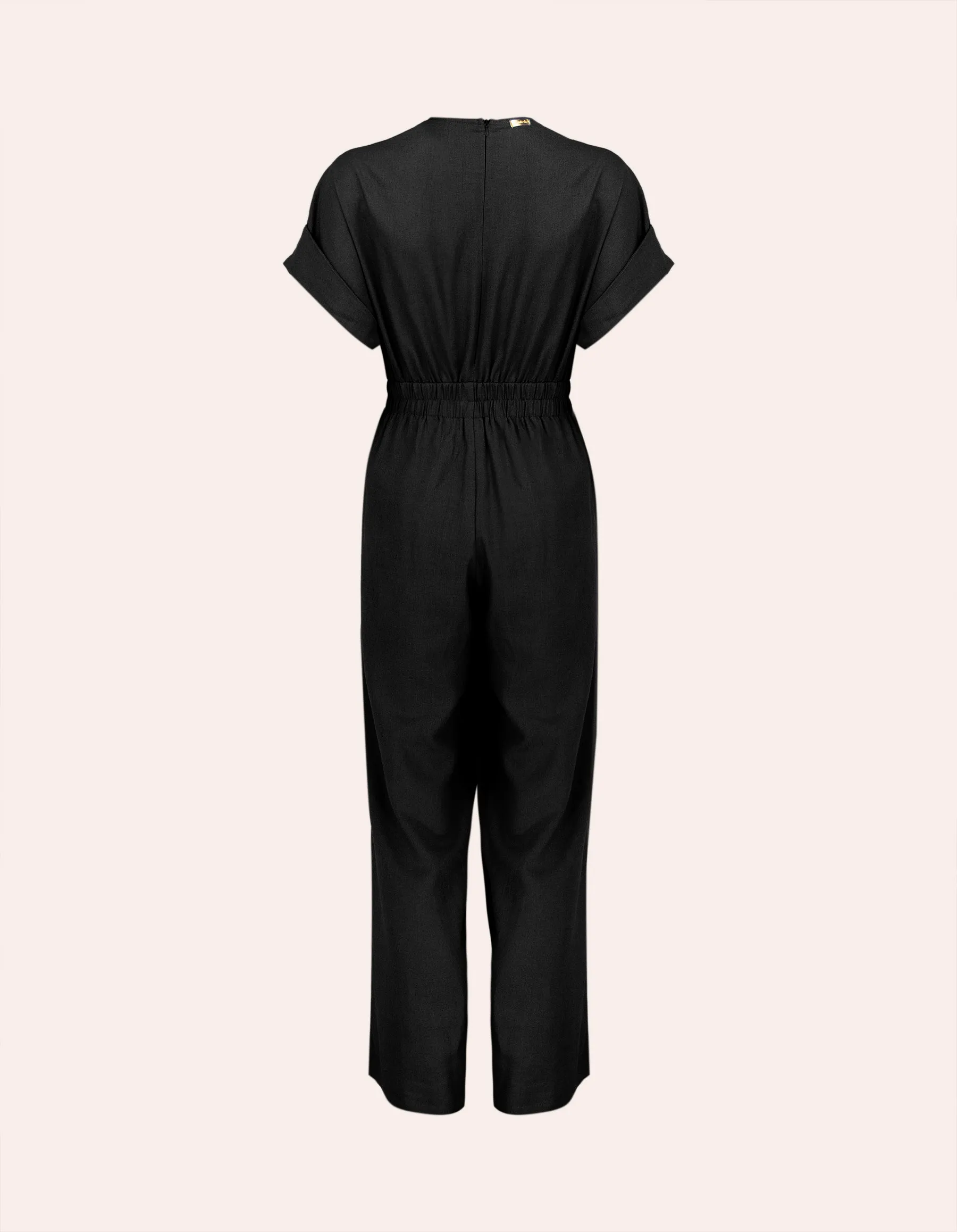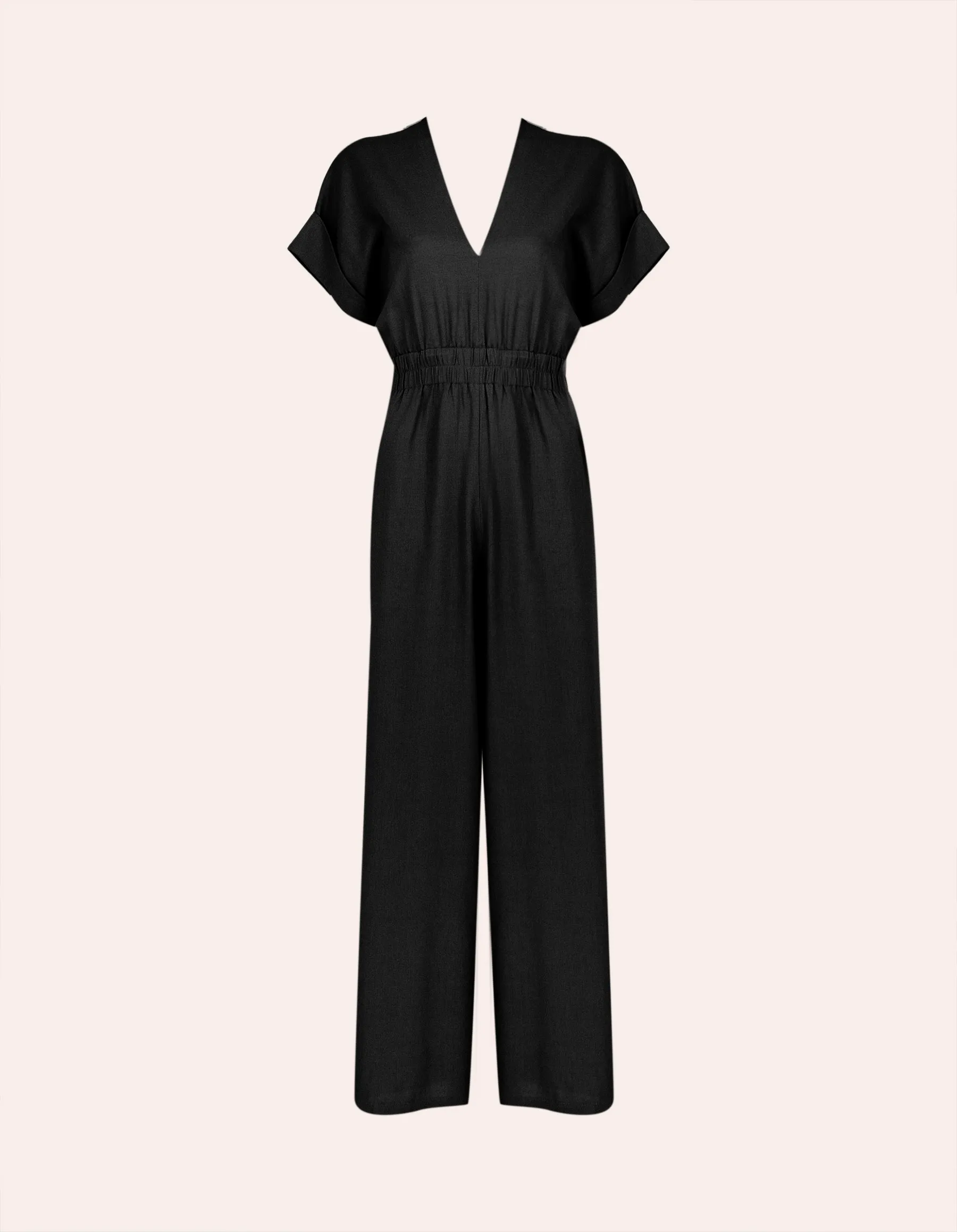Macacão com mangas curtas dobradas, decote v e cós elástico. peça confeccionada em linho, tecido moderno e muito confortável, ideal para compor seus visuais casuais, aposte neste modelo.