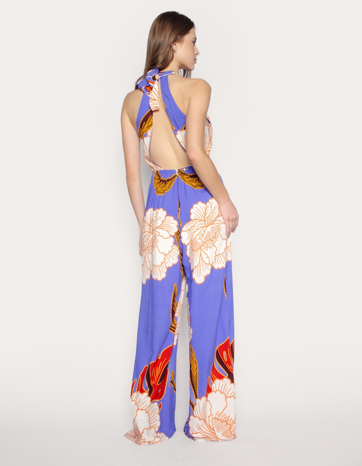 Macacão estampado alongado estilo pantalona. com uma silhueta acinturada que abraça as curvas delicadamente, a gola alta com amarração regular no pescoço adiciona um toque de sofisticação.