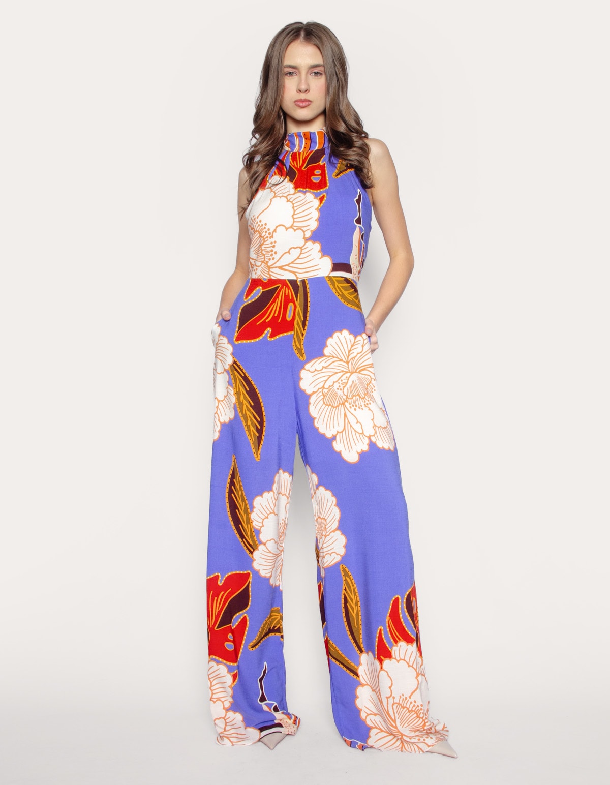 Macacão estampado alongado estilo pantalona. com uma silhueta acinturada que abraça as curvas delicadamente, a gola alta com amarração regular no pescoço adiciona um toque de sofisticação.