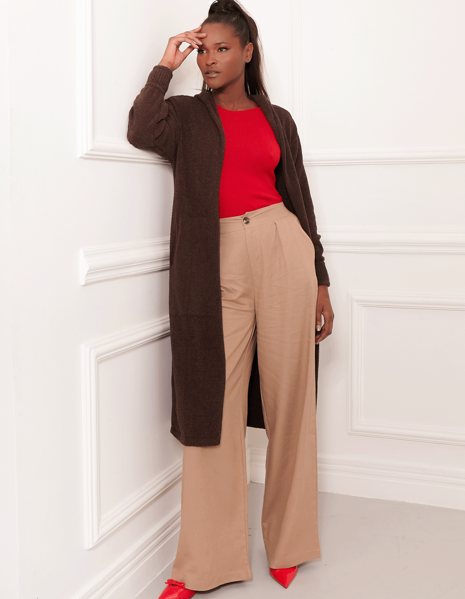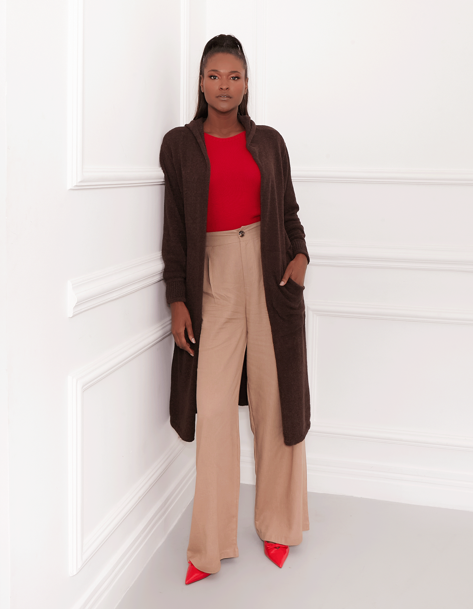 Maxi cardigan tricot com capuz e bolsos