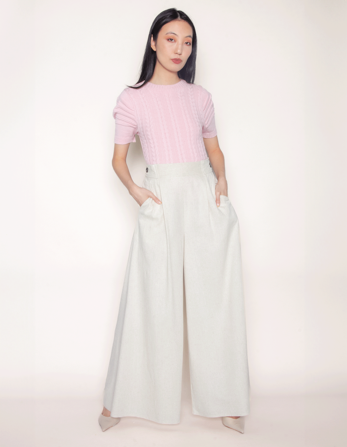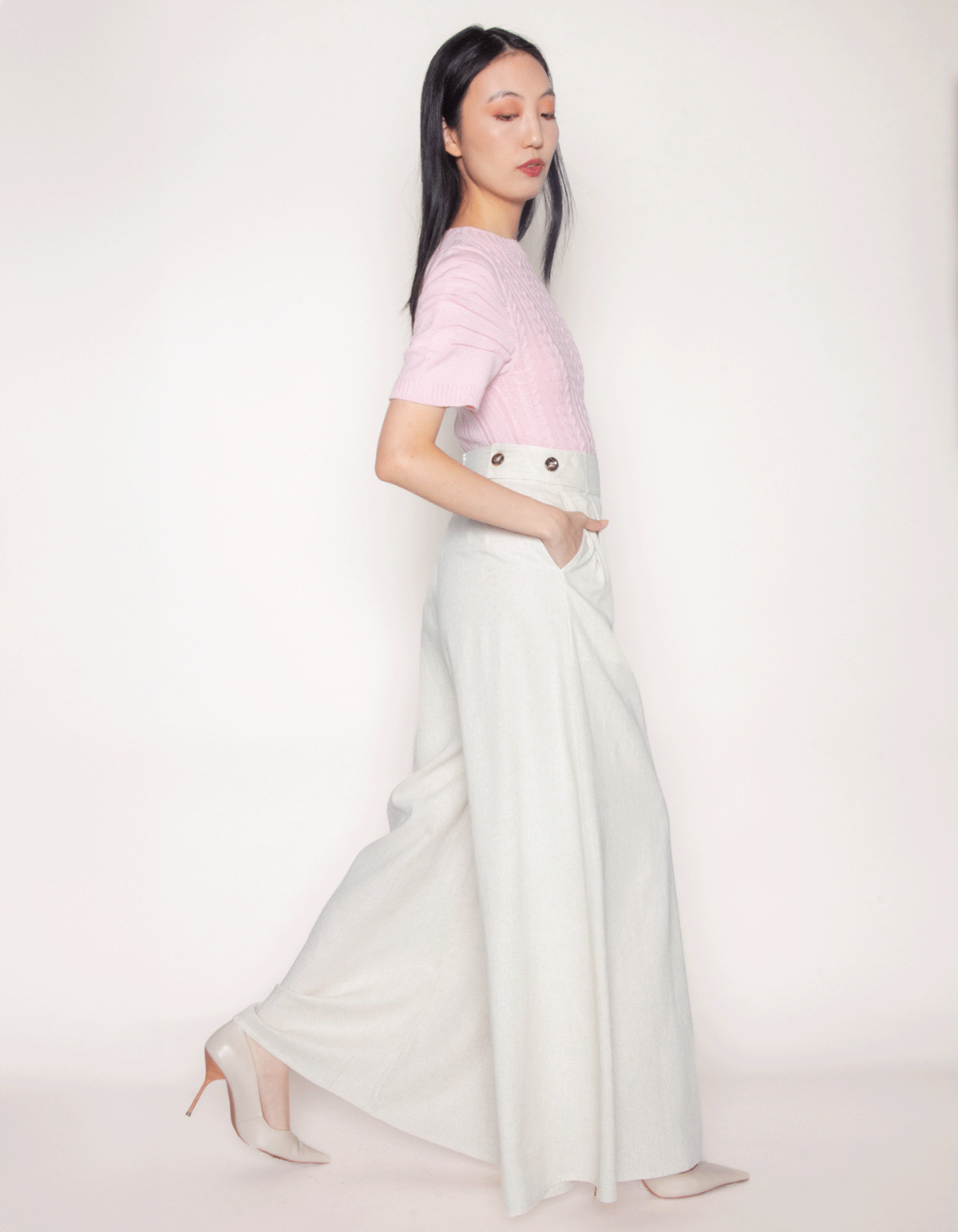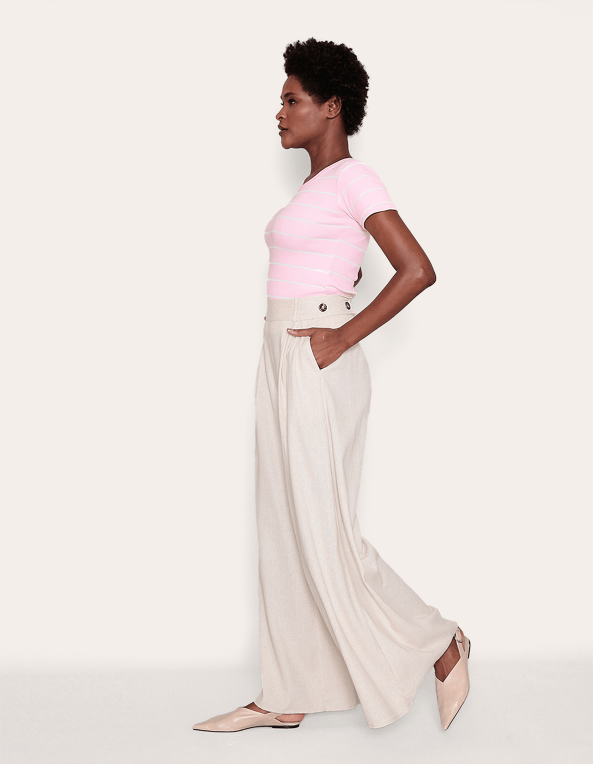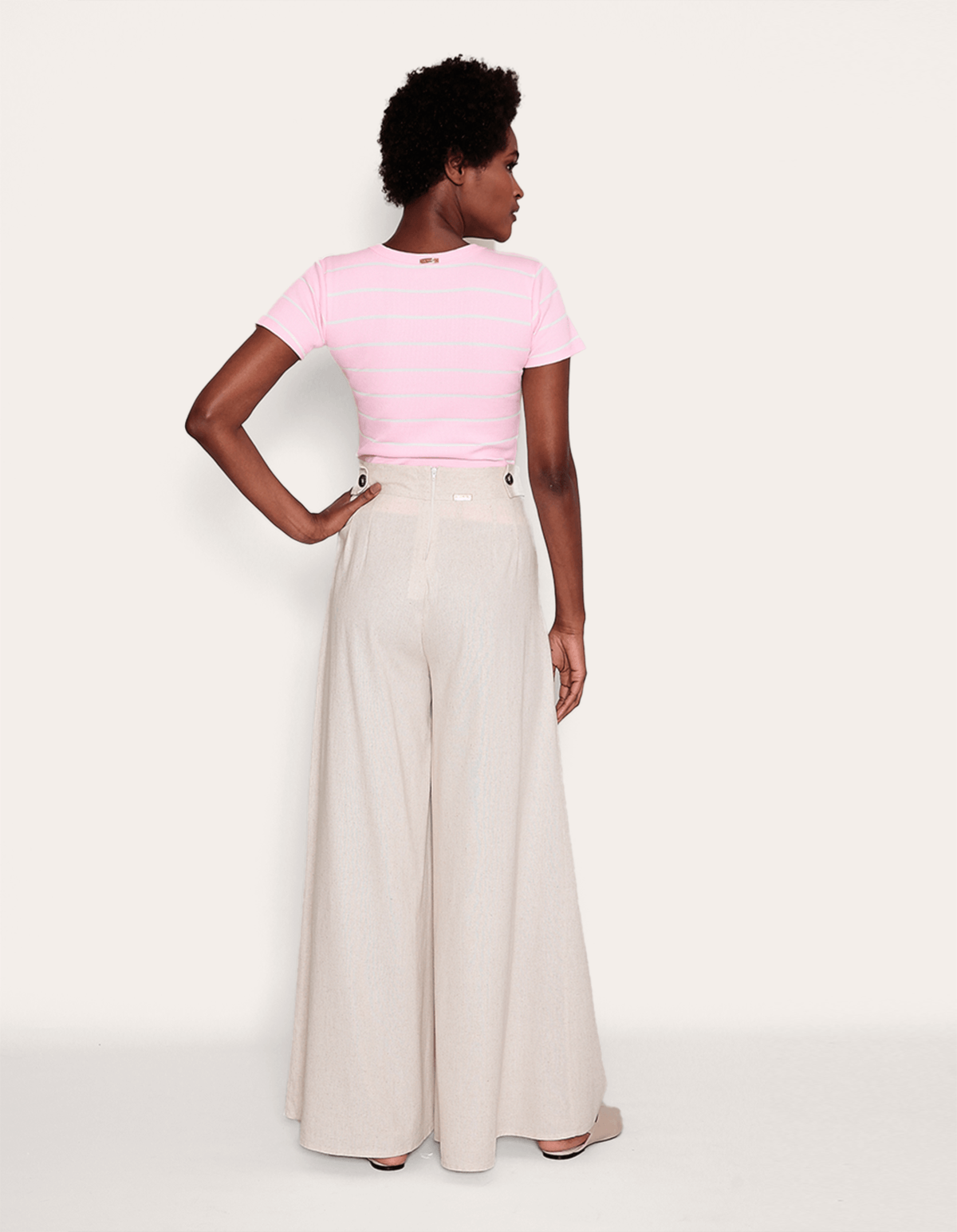 Calça maxi pantalona, detalhe na lateral do cós com botões, fechamento por zíper atrás, possui bolso faca nas laterais. esta calça exibe um design elegante, com detalhes em pregas que adicionam um toque de sofisticação. a modelagem pantalona oferece uma silhueta elegante e atemporal, garantindo conforto sem comprometer o estilo.
