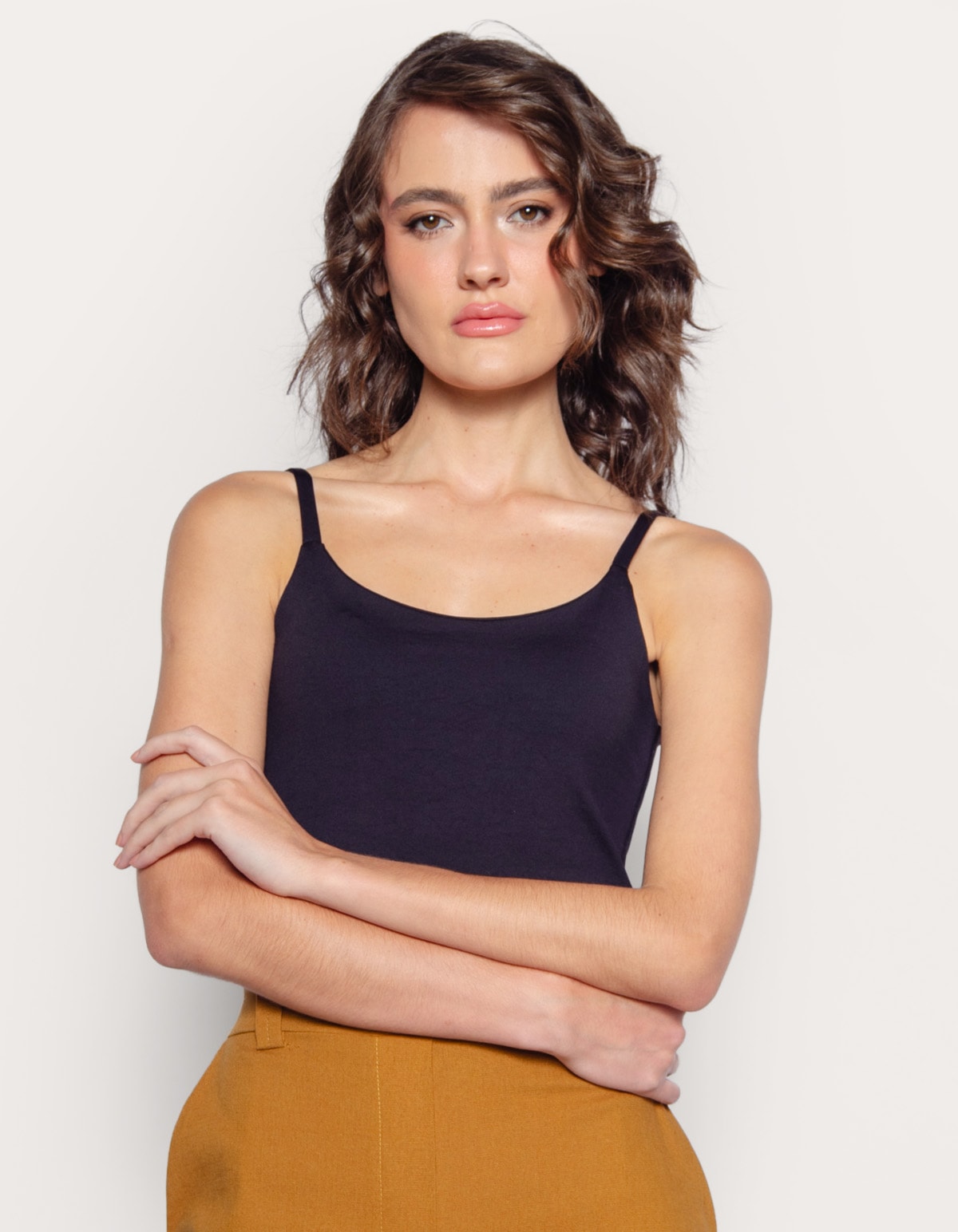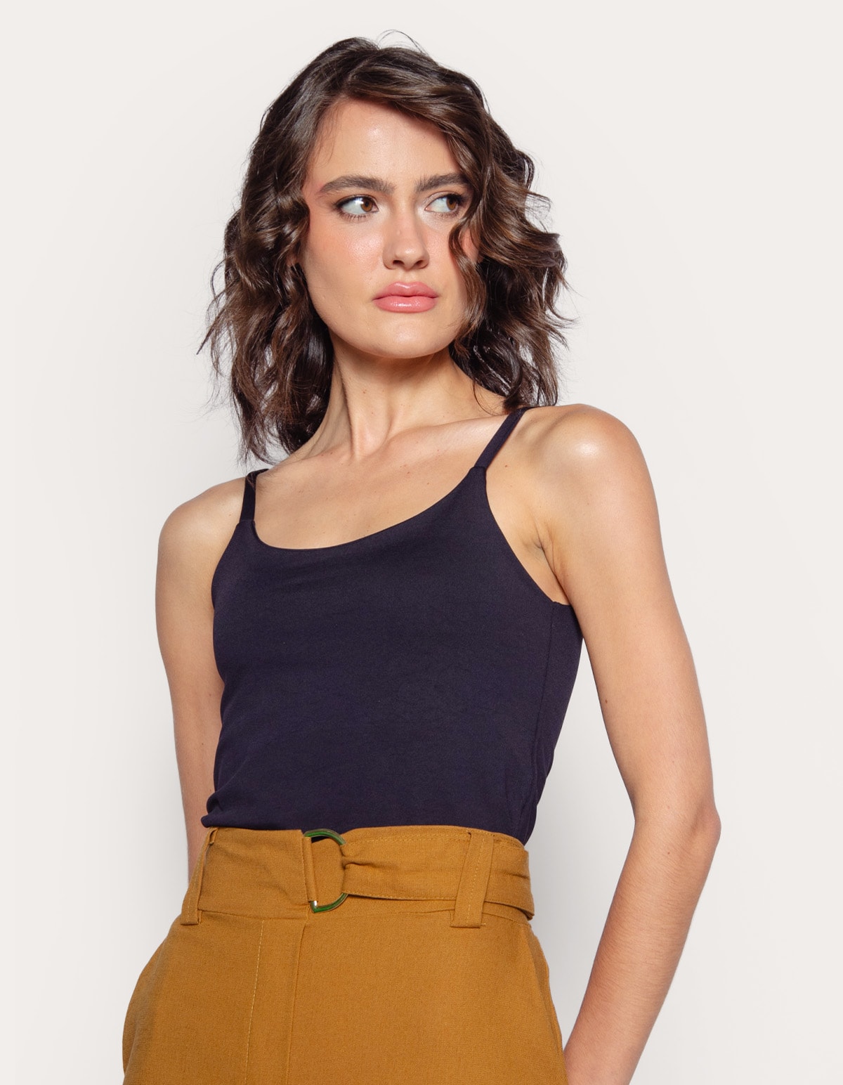 Regata alça fina, básica e minimalista. Possui decote arredondado não muito profundo, alças finas conferindo um visual leve e delicado, modelagem ajustada ao corpo, delineando a cintura e o busto. Ideal para ser usada como peça básica no dia a dia ou como base sob outras roupas.