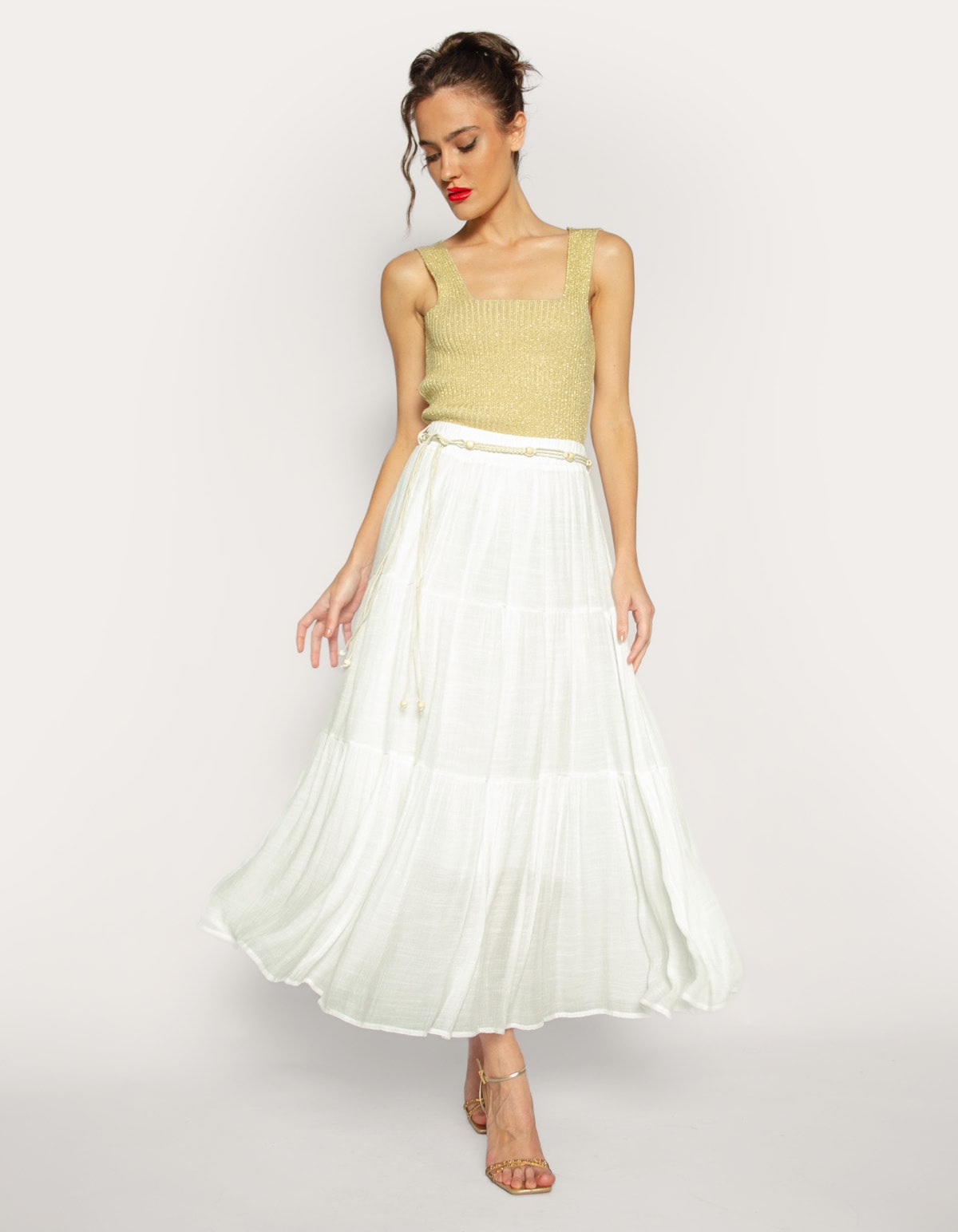 Saia longa camadas que confere um visual esvoaçante e de caimento fluido. Acompanha um cinto com detalhes de miçanga. Sugere um estilo casual, boemio ou praiano, ideal para dias quentes e com um caimento confortável.