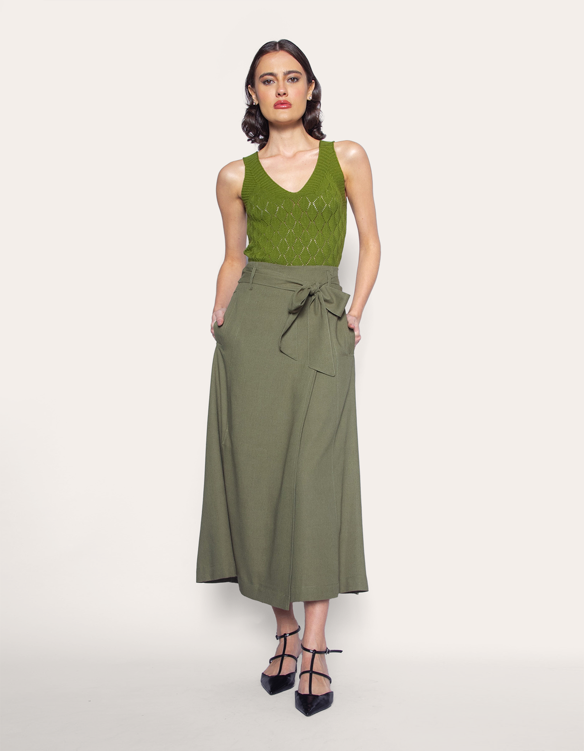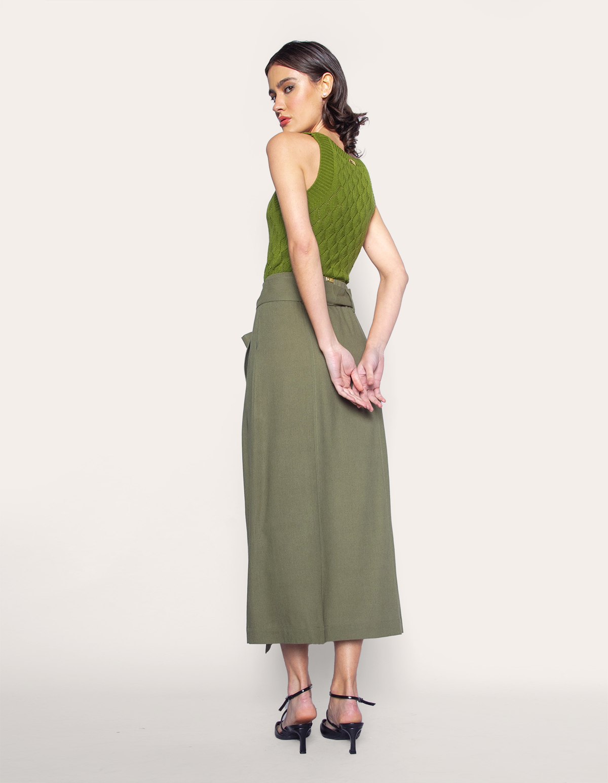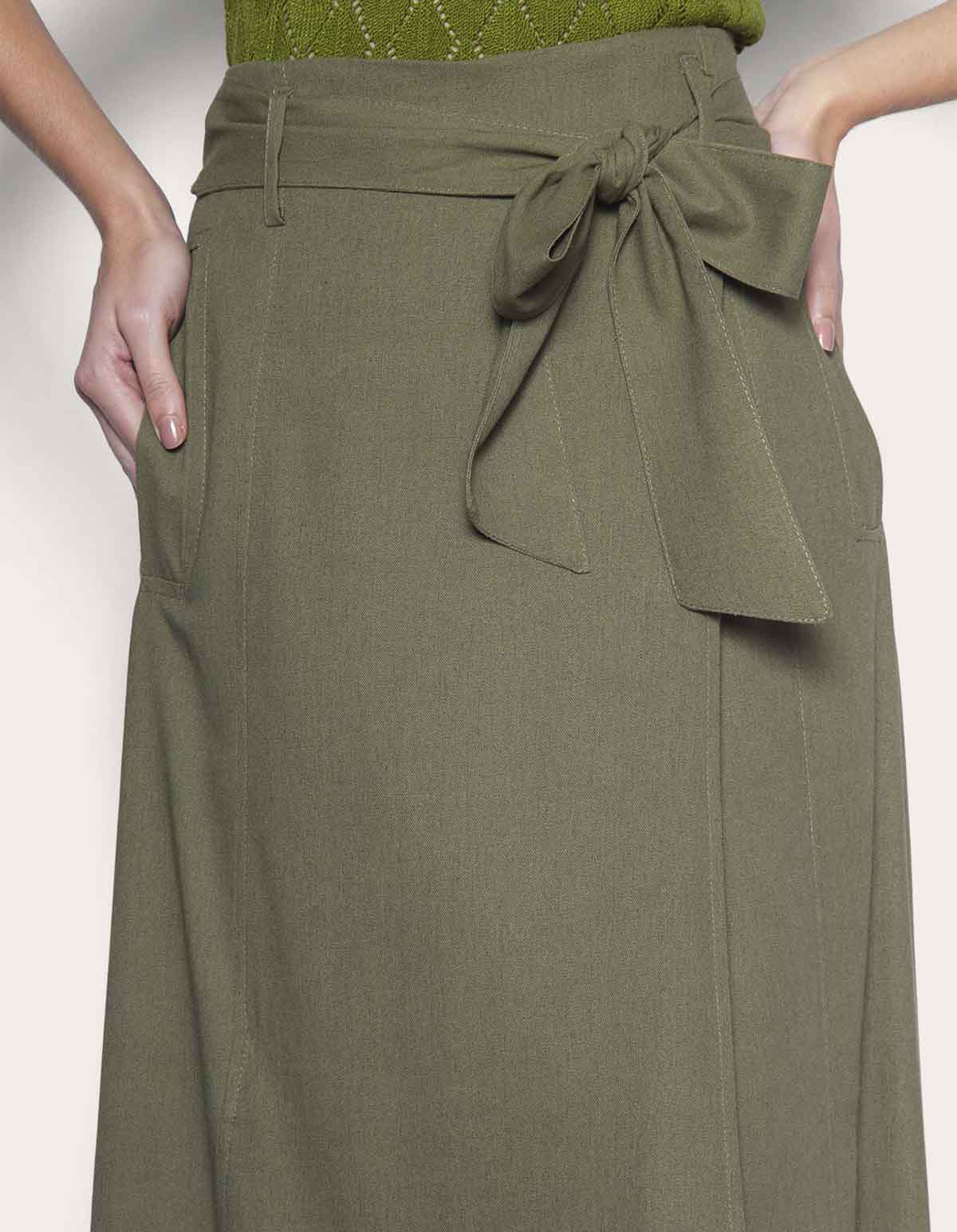 Saia envelope longa de linho, faixa no cós, zíper lateral e cós com elástico atrás. é a peça perfeita para adicionar um toque de elegância ao seu guarda-roupa, combina conforto e estilo de forma única.