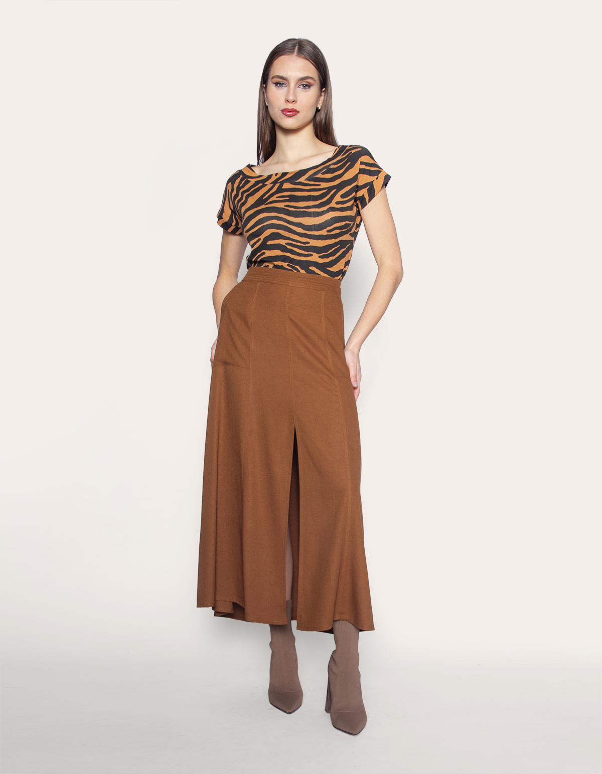 Saia longa com fenda na frente, possui ellástico atrás no cós e fechamento lateral em zíper. uma escolha elegante e sofisticada para diversas ocasiões.