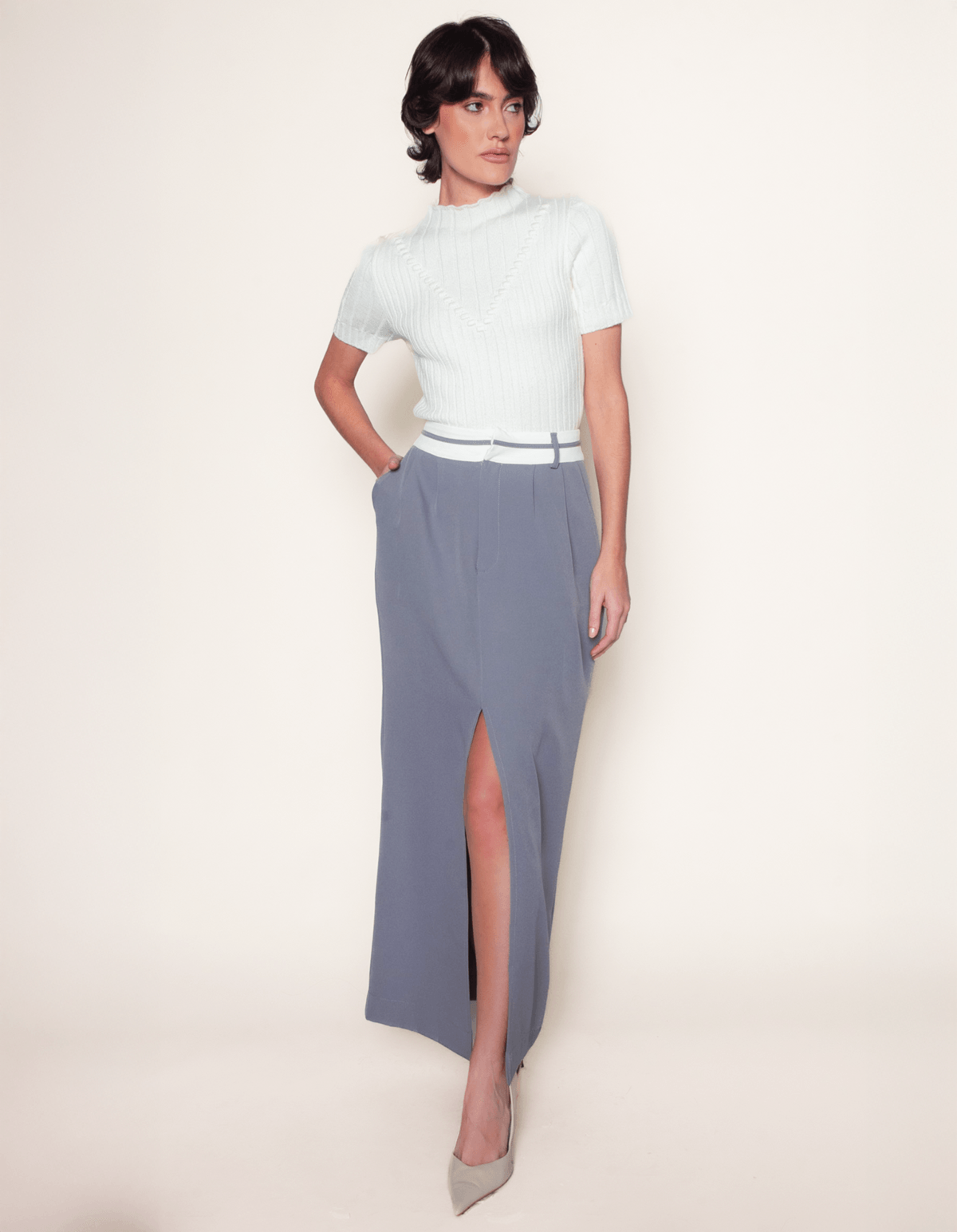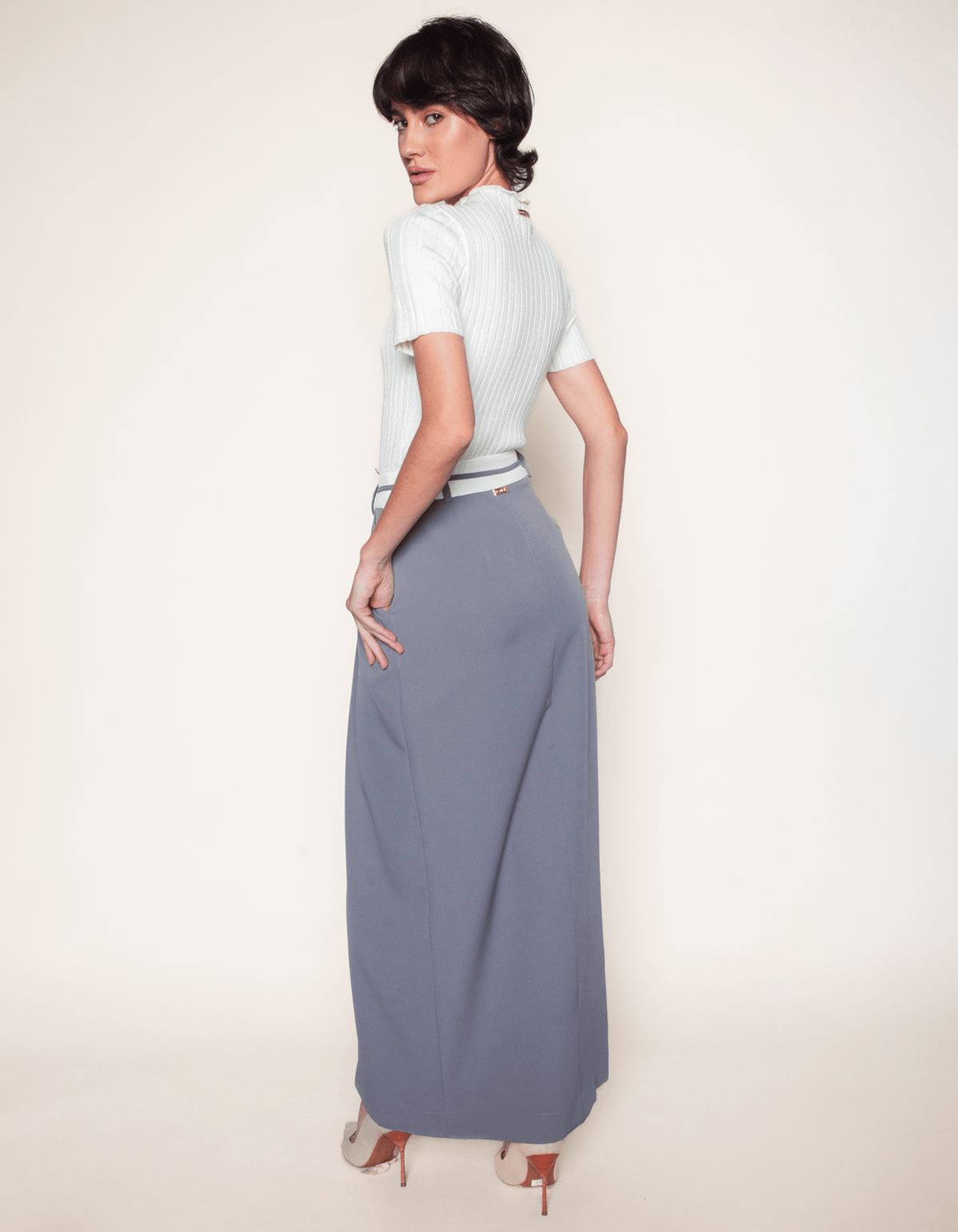 Saia longa alfaiataria com fechamento em zíper e botões embutido no cós. possui bolsos faca na lateral, modelagem reta e fenda frontal perfeita, que mostra a pele, mas de uma maneira super elegante.