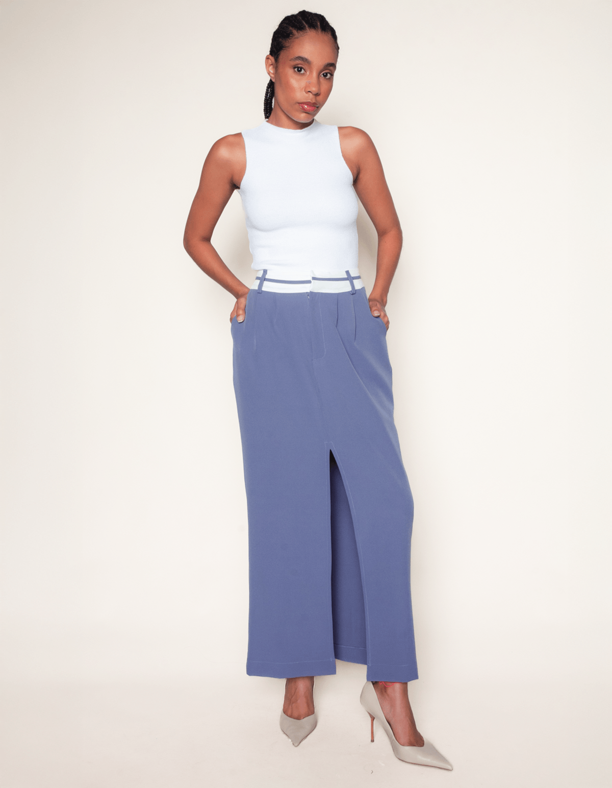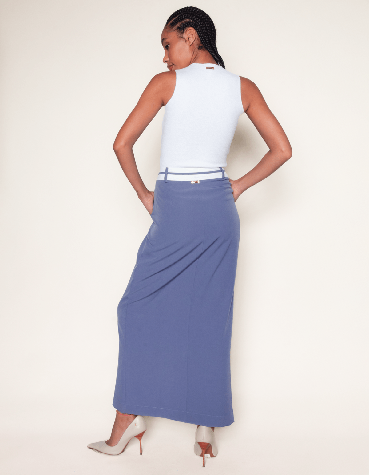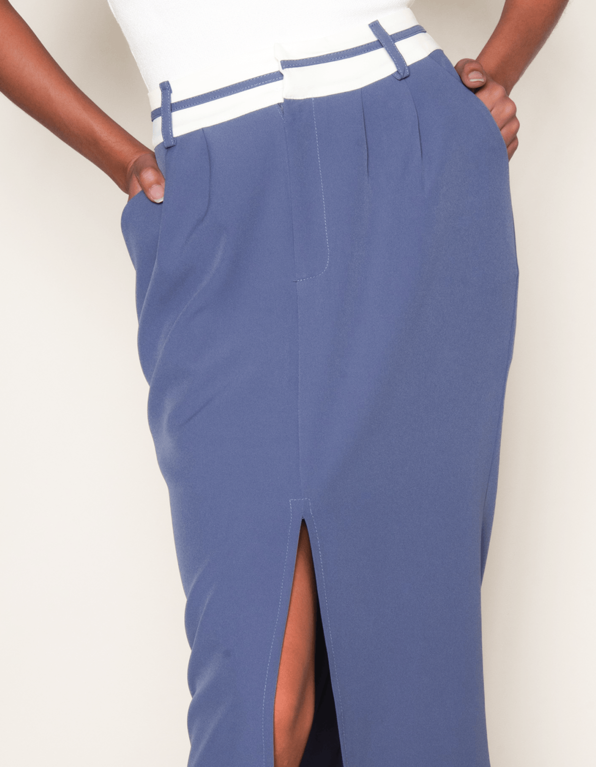 Saia longa alfaiataria com fechamento em zíper e botões embutido no cós. possui bolsos faca na lateral, modelagem reta e fenda frontal perfeita, que mostra a pele, mas de uma maneira super elegante.