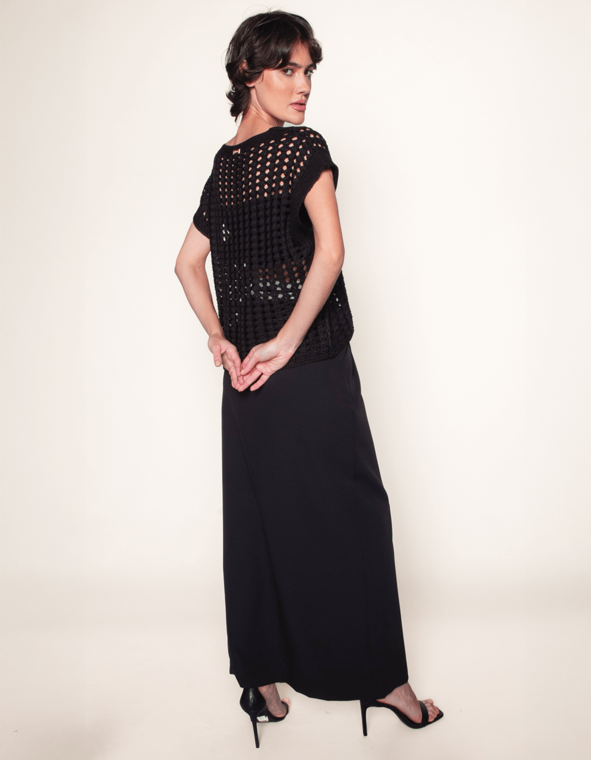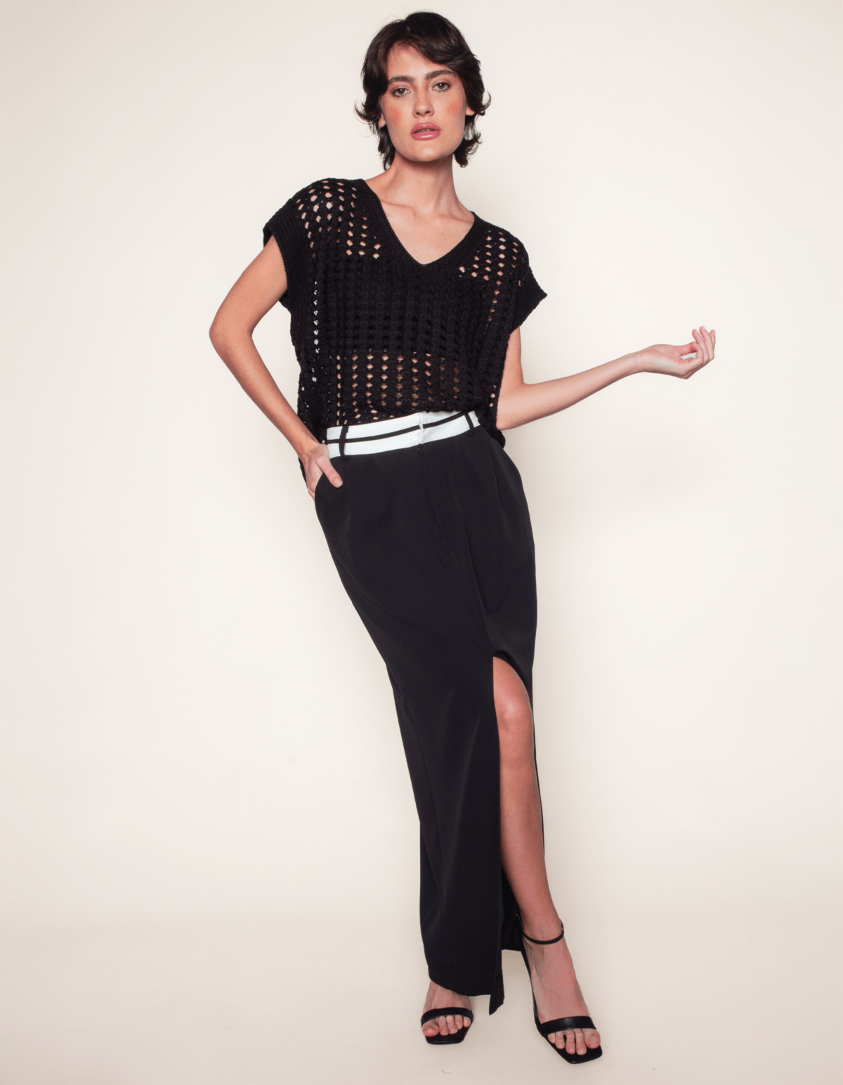 Saia longa alfaiataria com fechamento em zíper e botões embutido no cós. possui bolsos faca na lateral, modelagem reta e fenda frontal perfeita, que mostra a pele, mas de uma maneira super elegante.