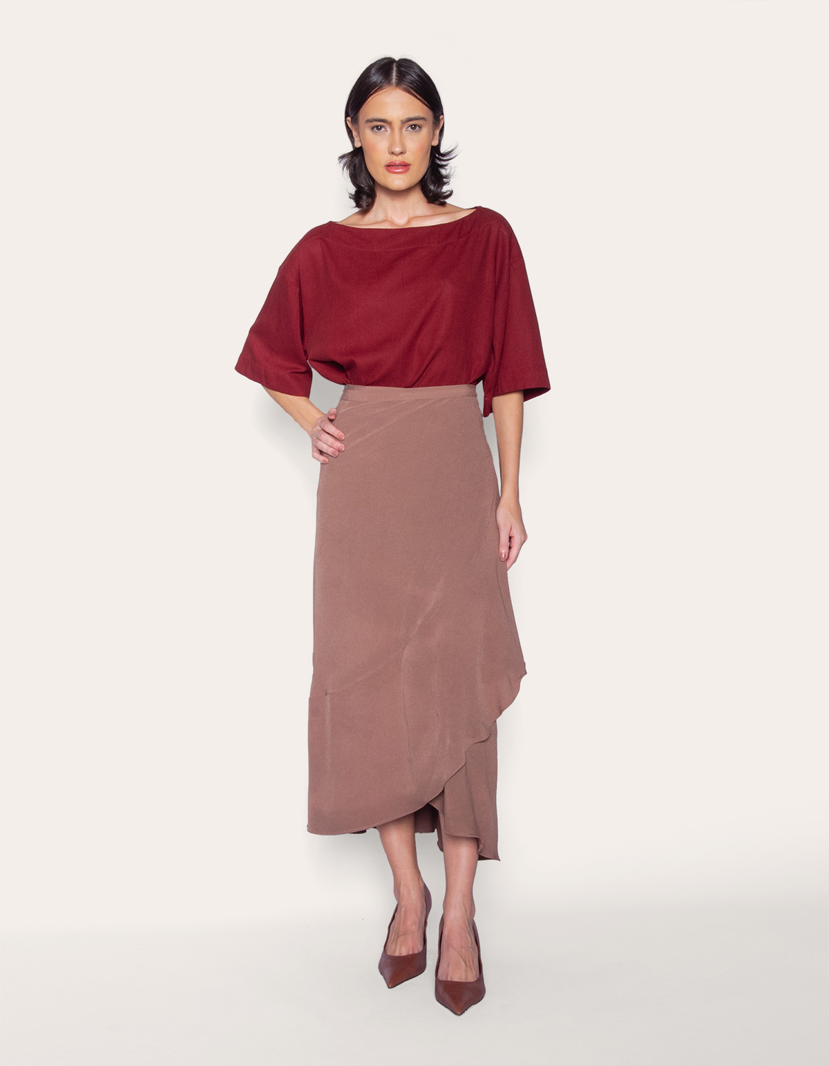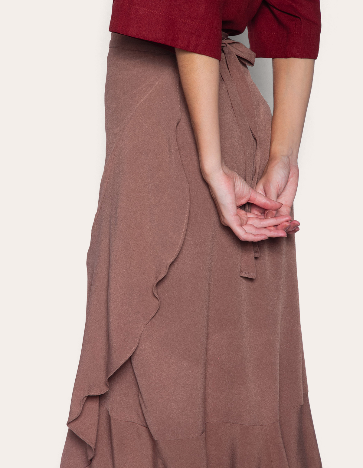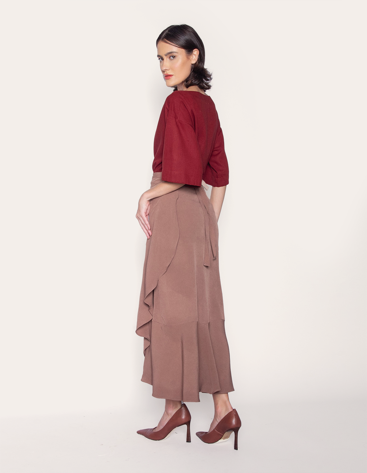A saia longa transpassada com babado é uma peça cheia de movimento e estilo. o design transpassado proporciona um ajuste flexível e confortável, enquanto o babado adiciona um toque de feminilidade e leveza, criando uma silhueta fluida.