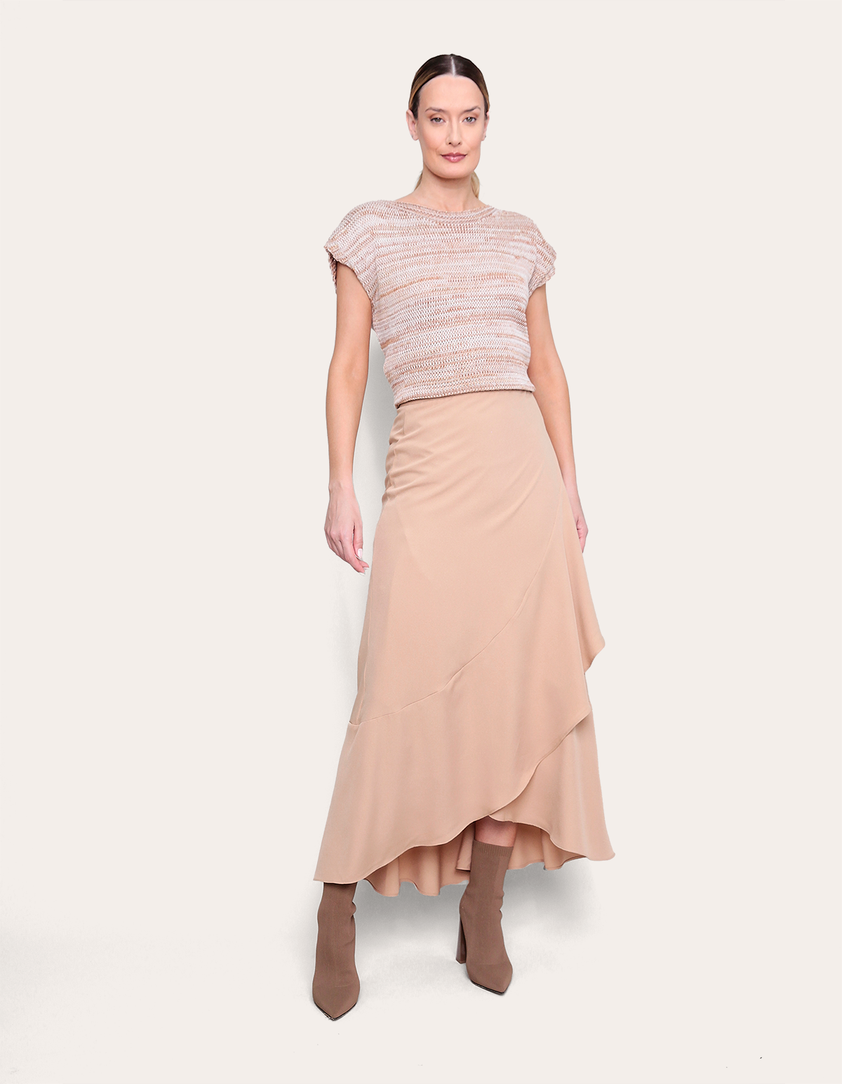 A saia longa transpassada com babado é uma peça cheia de movimento e estilo. o design transpassado proporciona um ajuste flexível e confortável, enquanto o babado adiciona um toque de feminilidade e leveza, criando uma silhueta fluida.