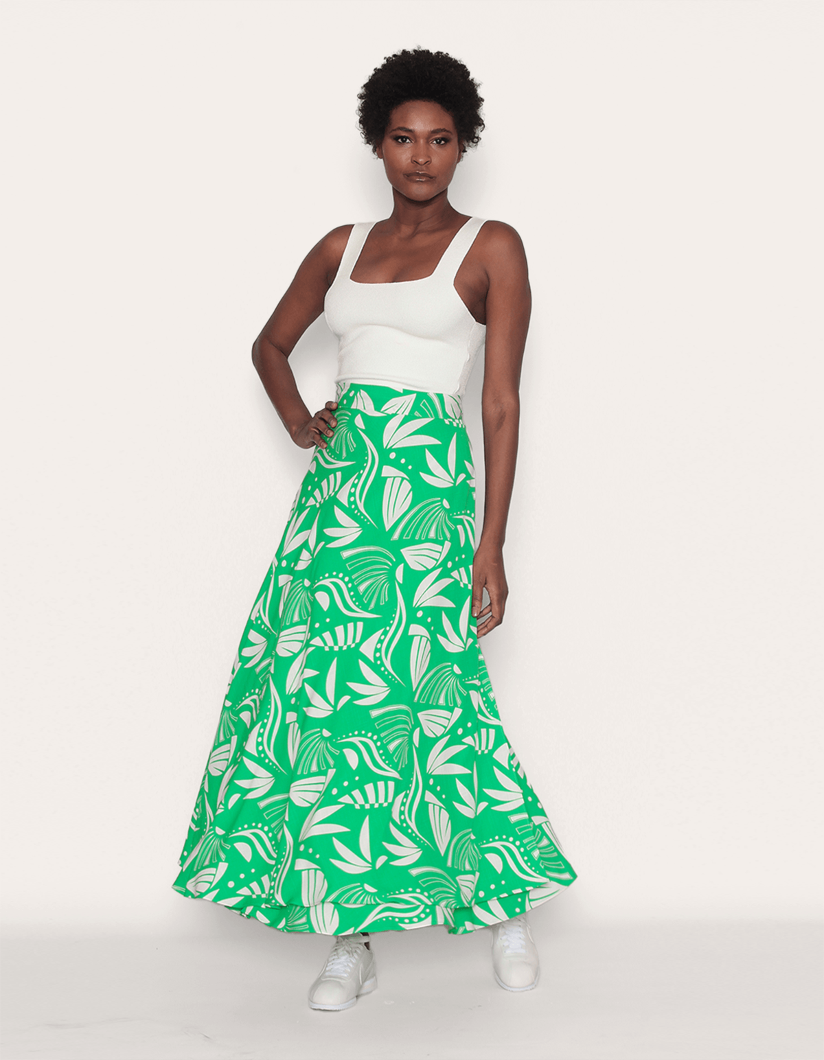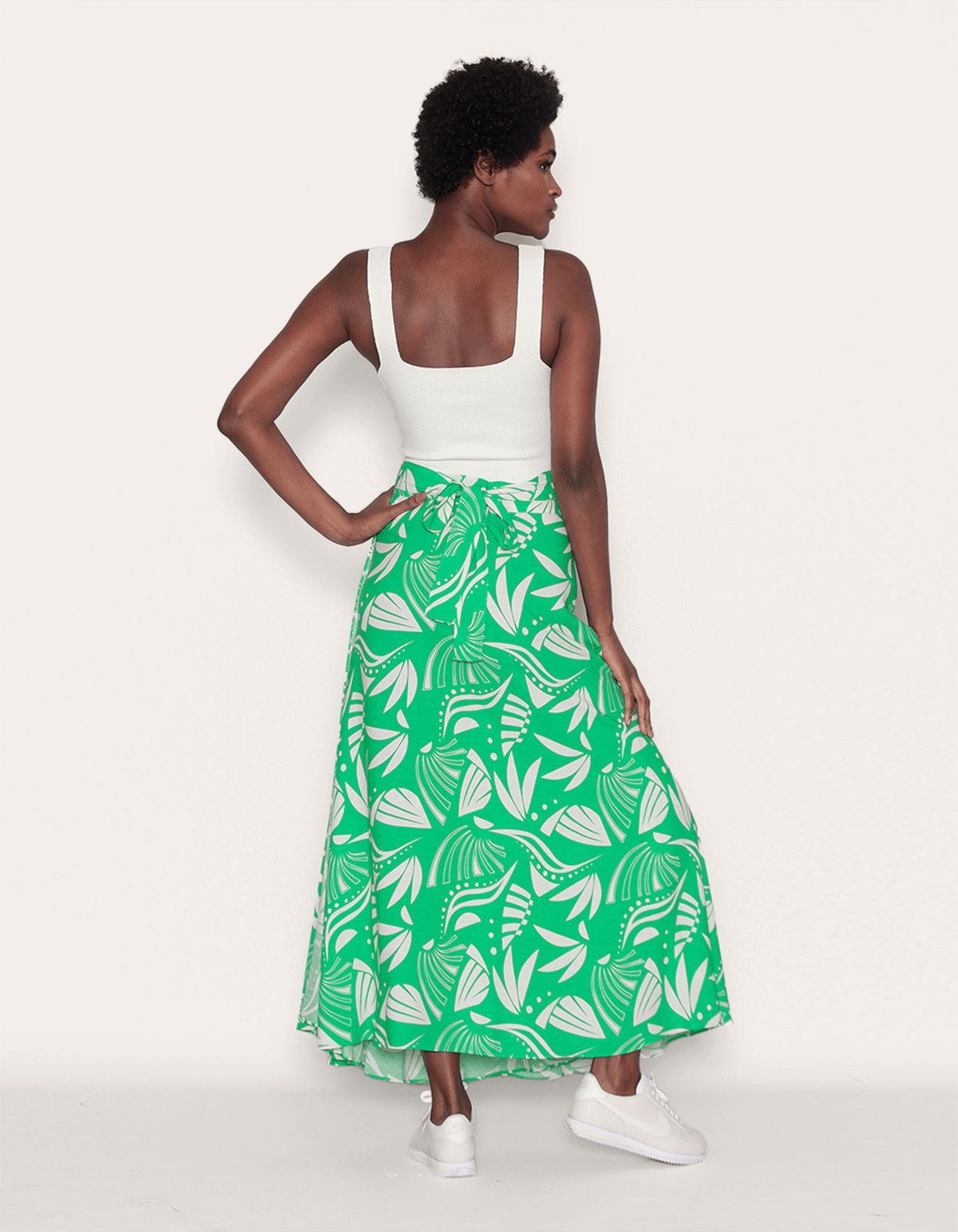 Saia longa transpassada estampada com faixa de amarrar na cintura. esse modelo vai dar vida para qualquer visual leve e descontraído.