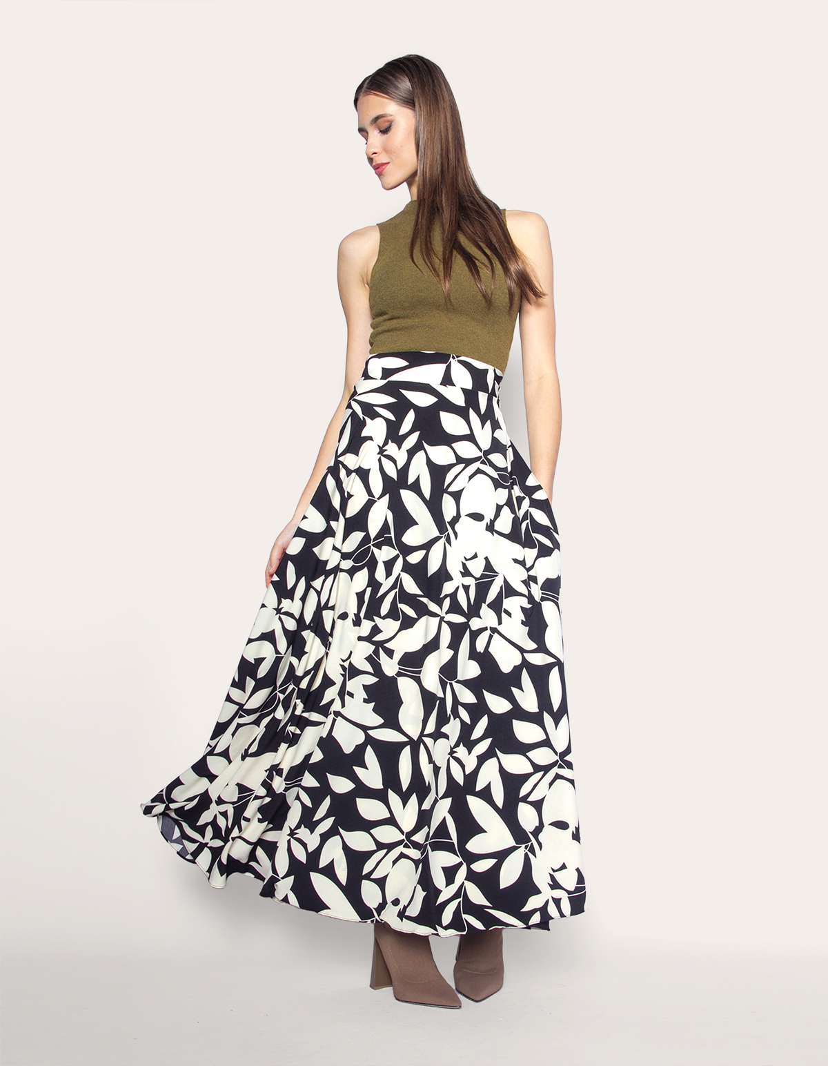 Saia longa, transpassada envelope. essa característica cria um efeito de elegância e estilo único na peça.
