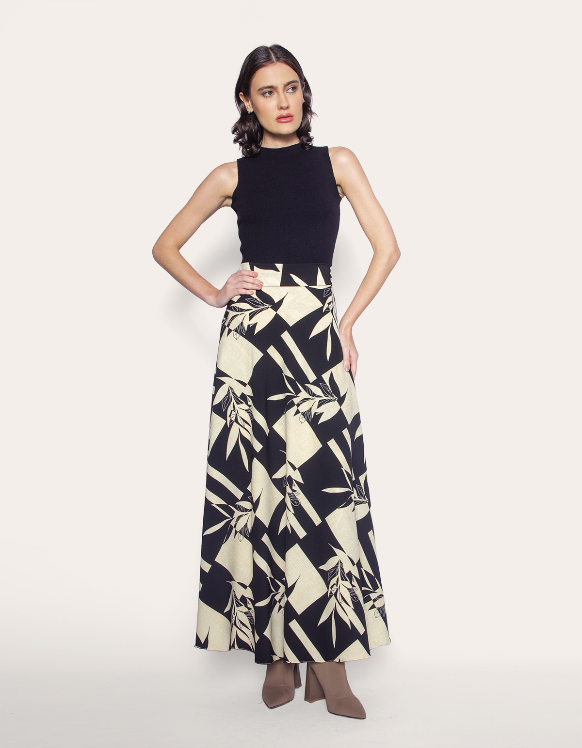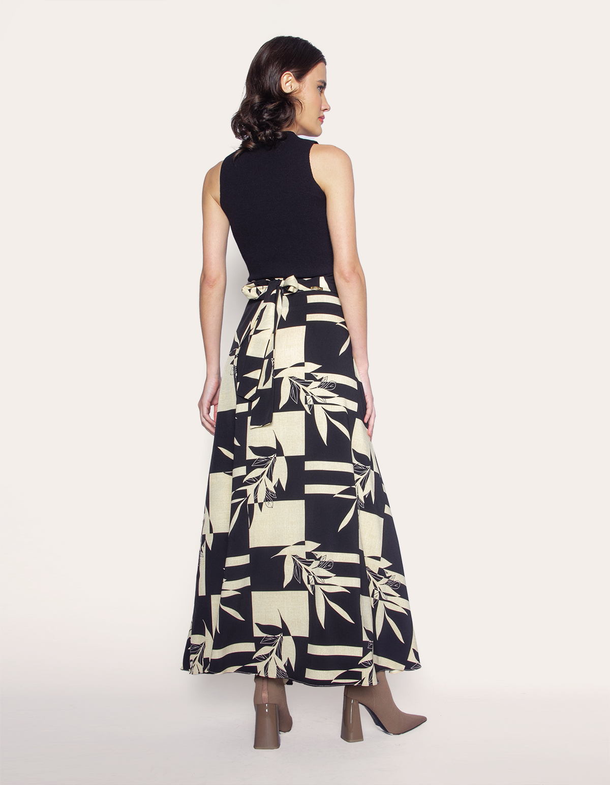 Saia longa, transpassada envelope. essa característica cria um efeito de elegância e estilo único na peça.