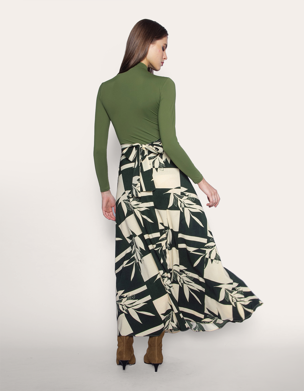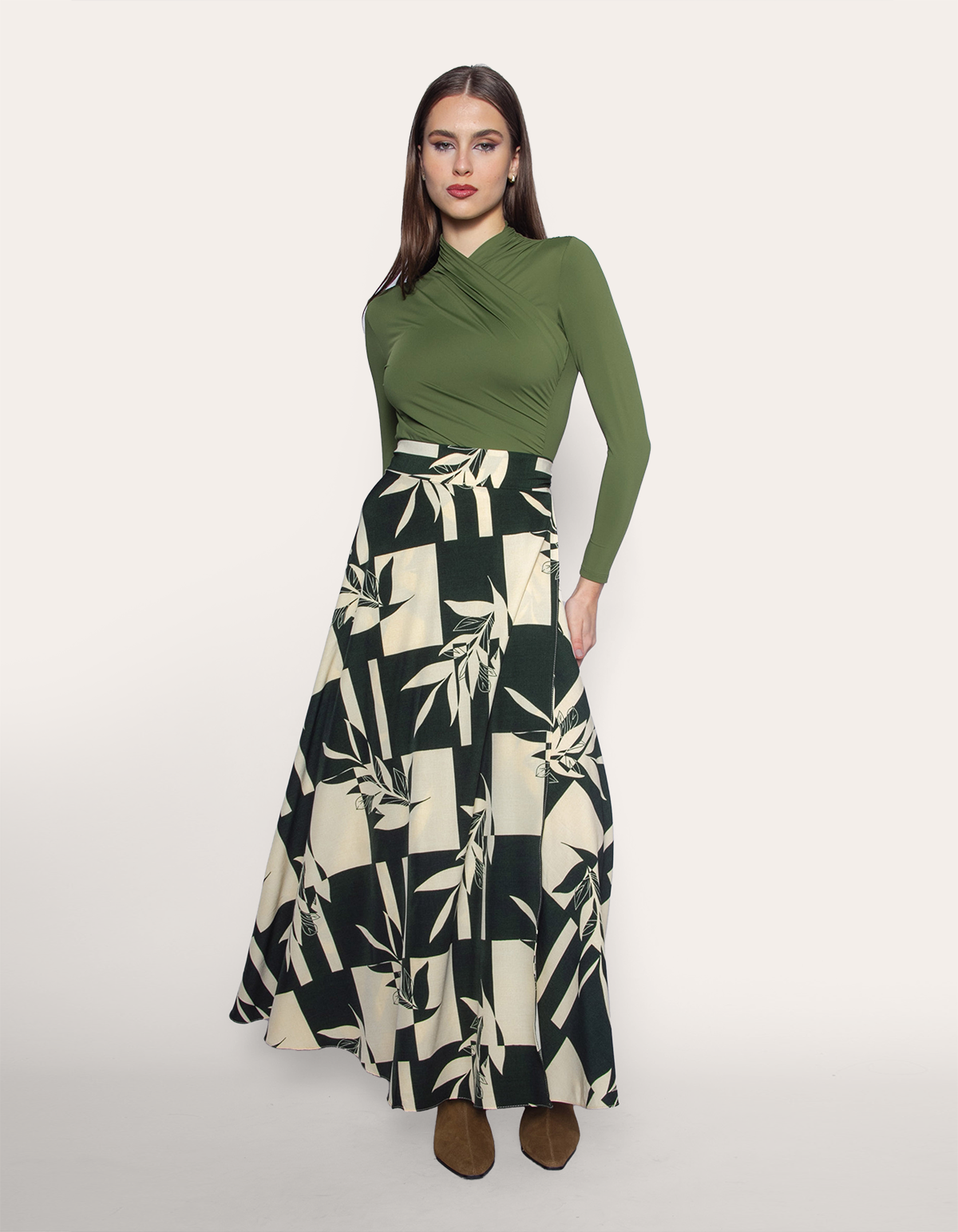 Saia longa, transpassada envelope. essa característica cria um efeito de elegância e estilo único na peça.