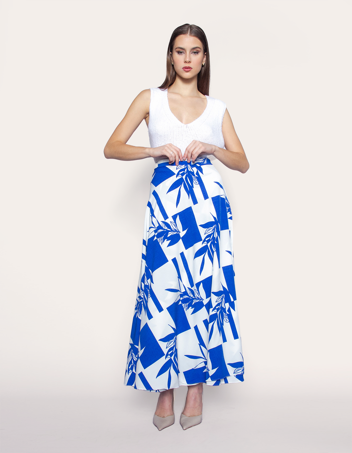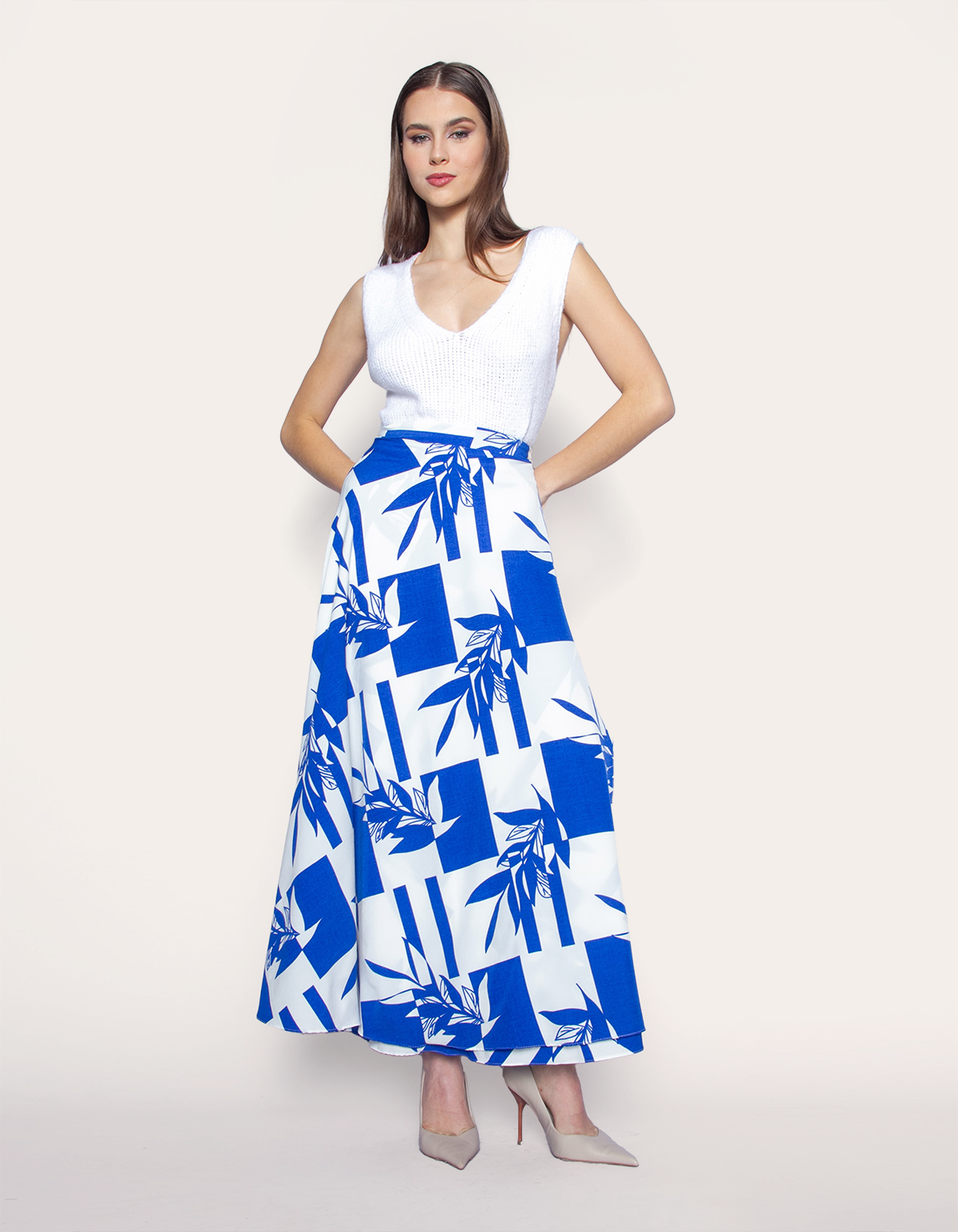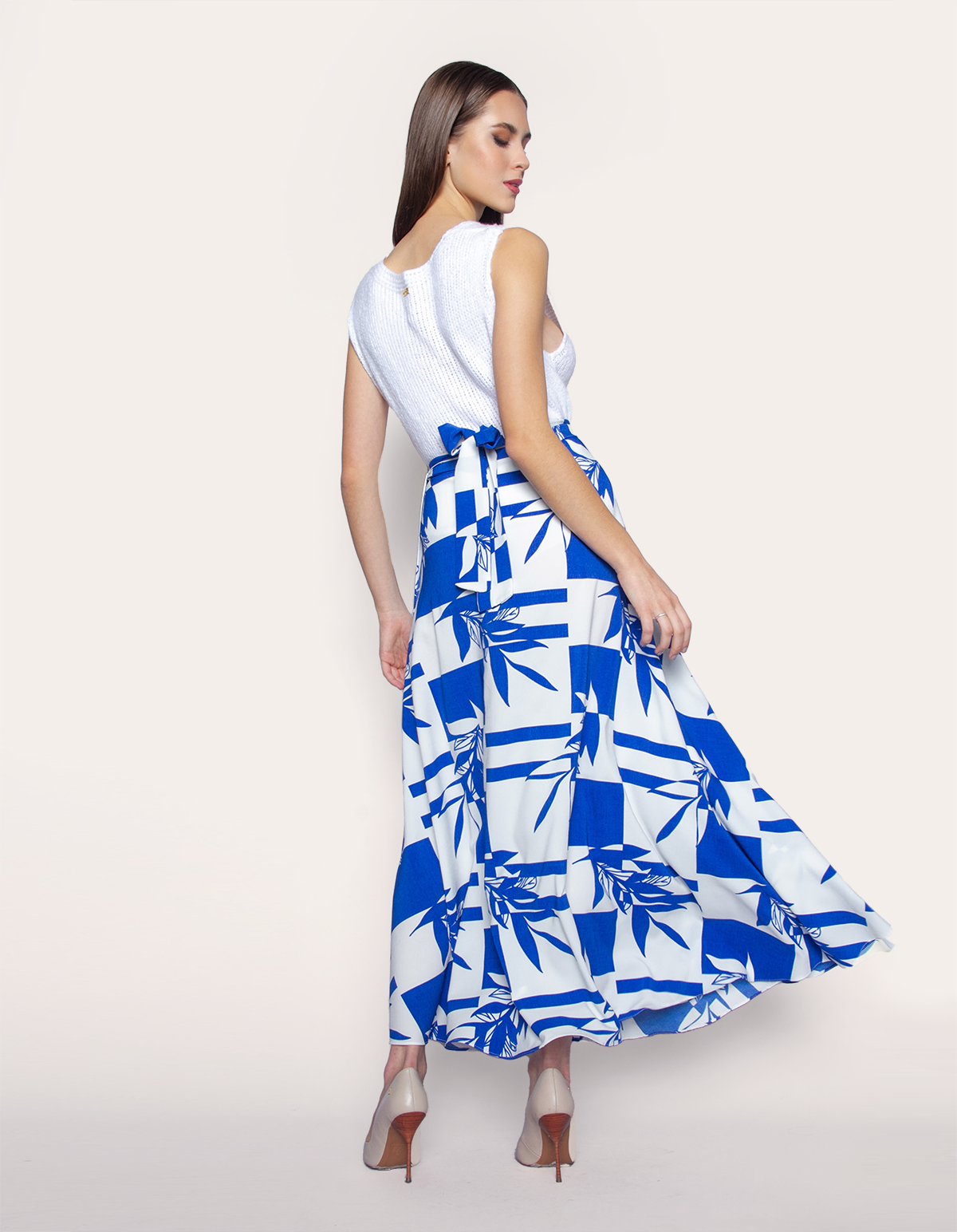 Saia longa, transpassada envelope. essa característica cria um efeito de elegância e estilo único na peça.