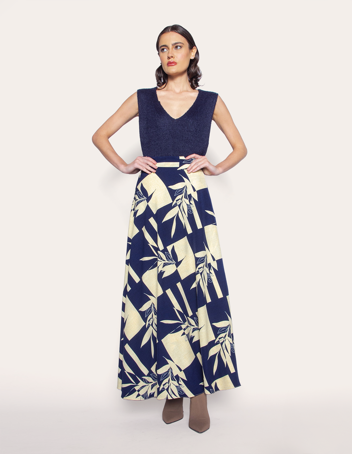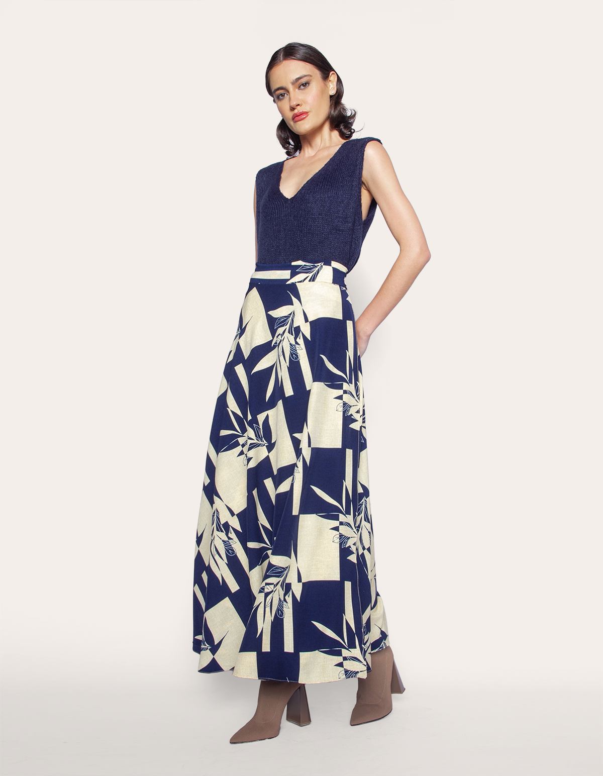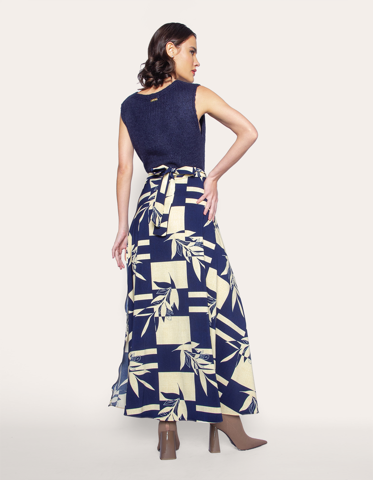 Saia longa, transpassada envelope. essa característica cria um efeito de elegância e estilo único na peça.