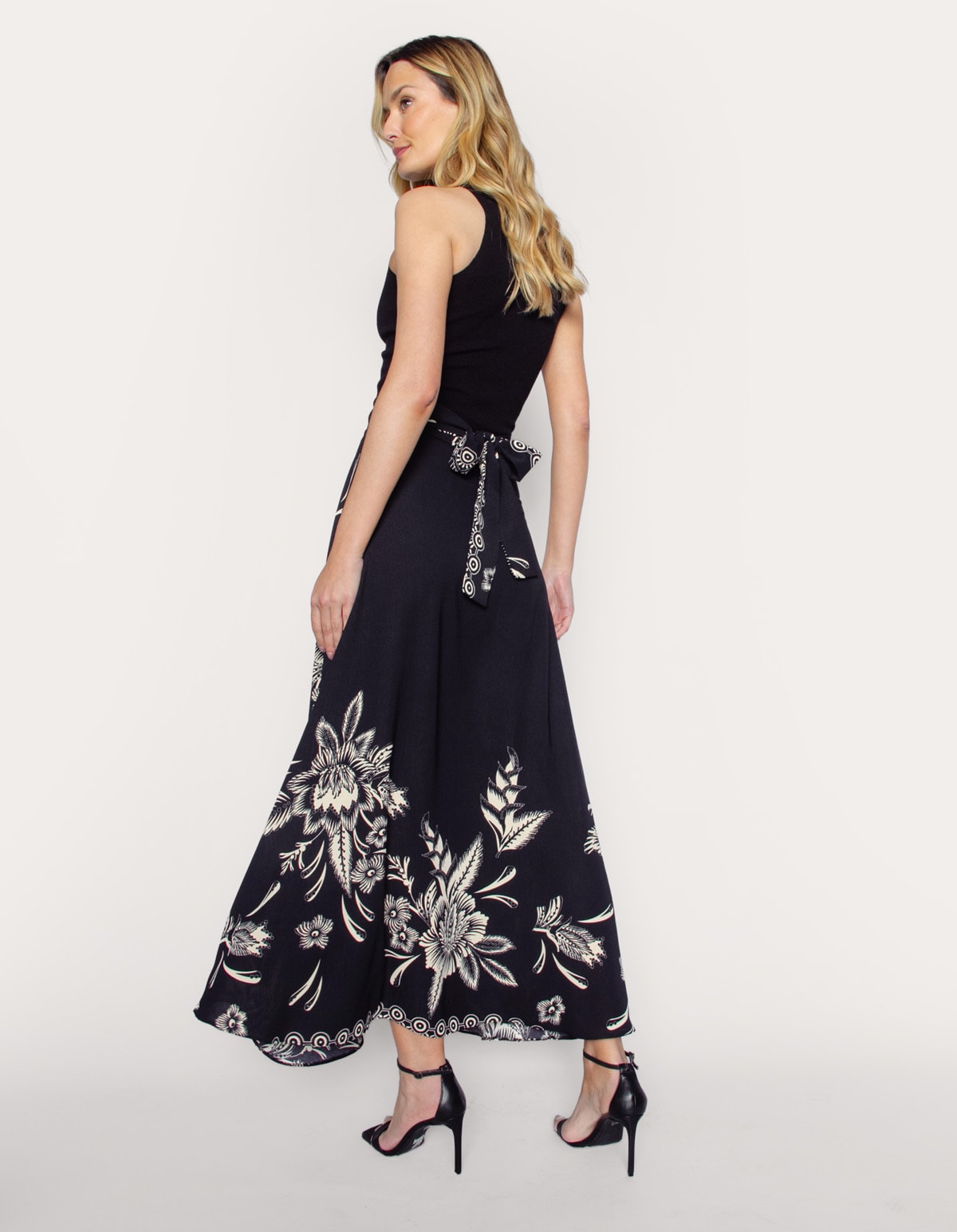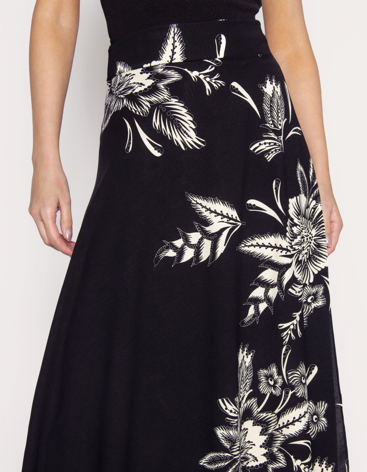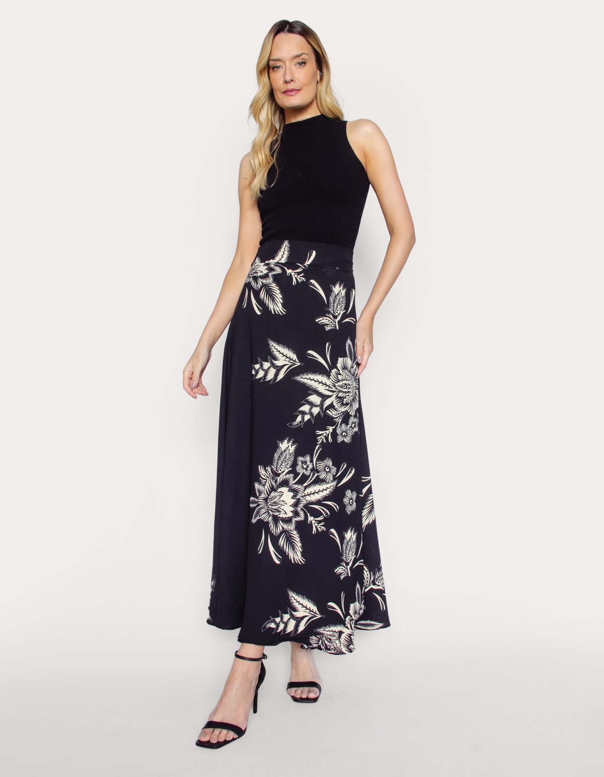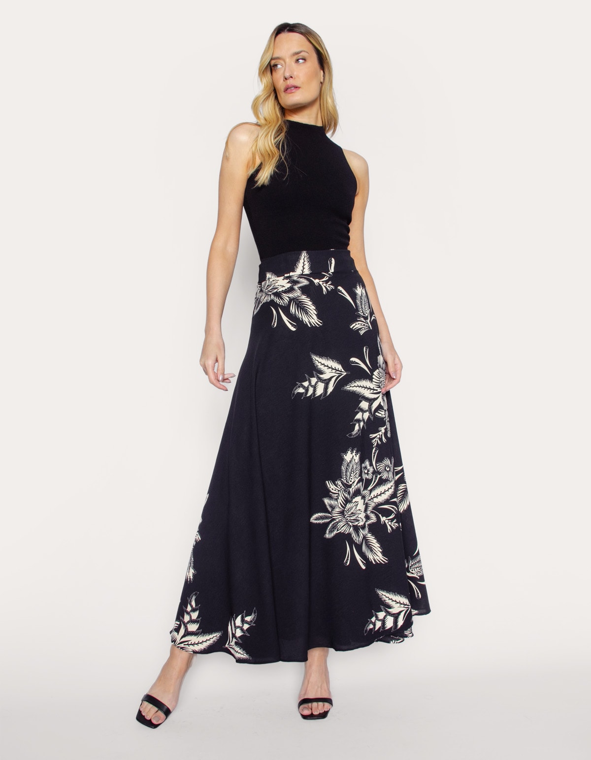 Saia longa, transpassada envelope. essa característica cria um efeito de elegância e estilo único na peça.