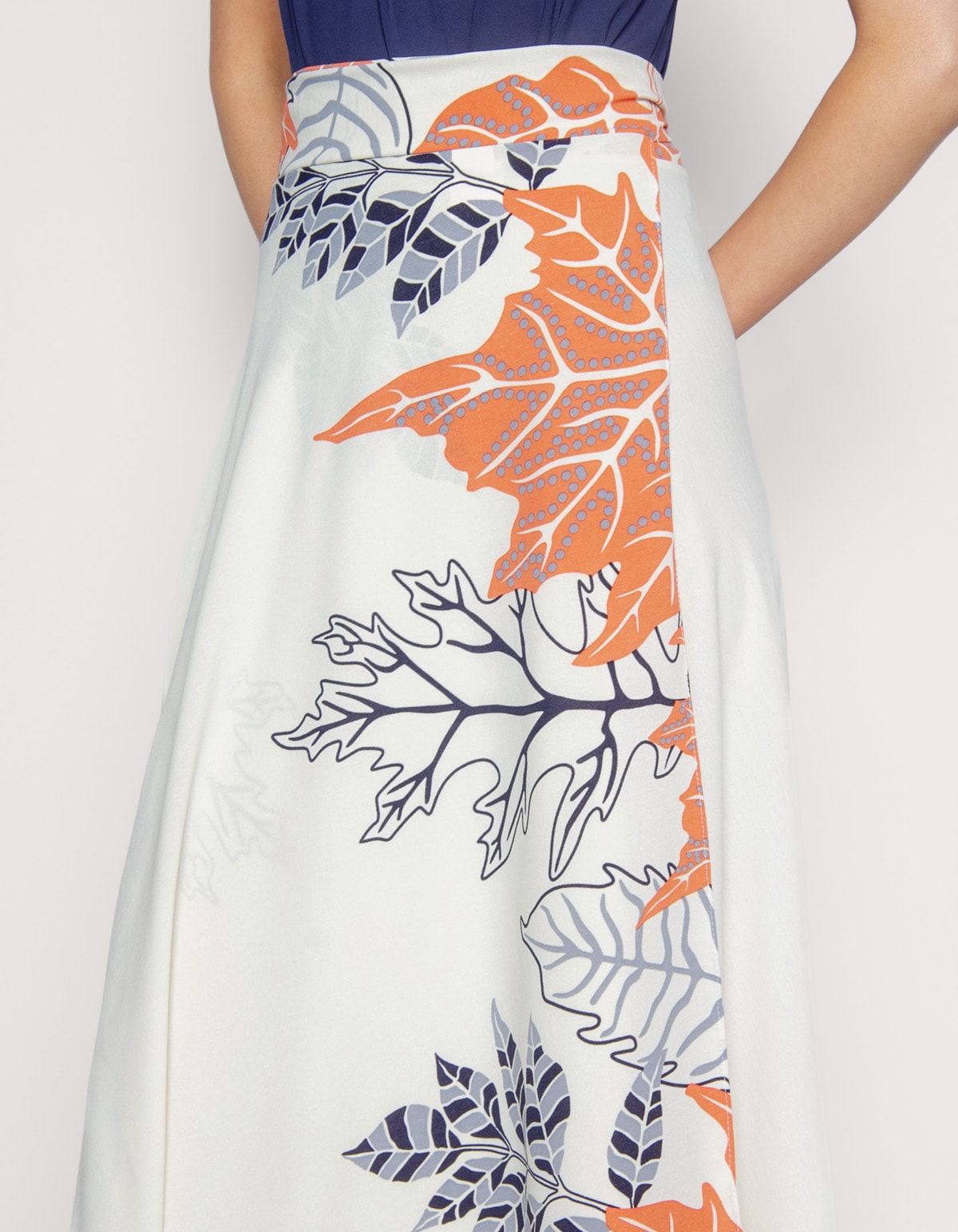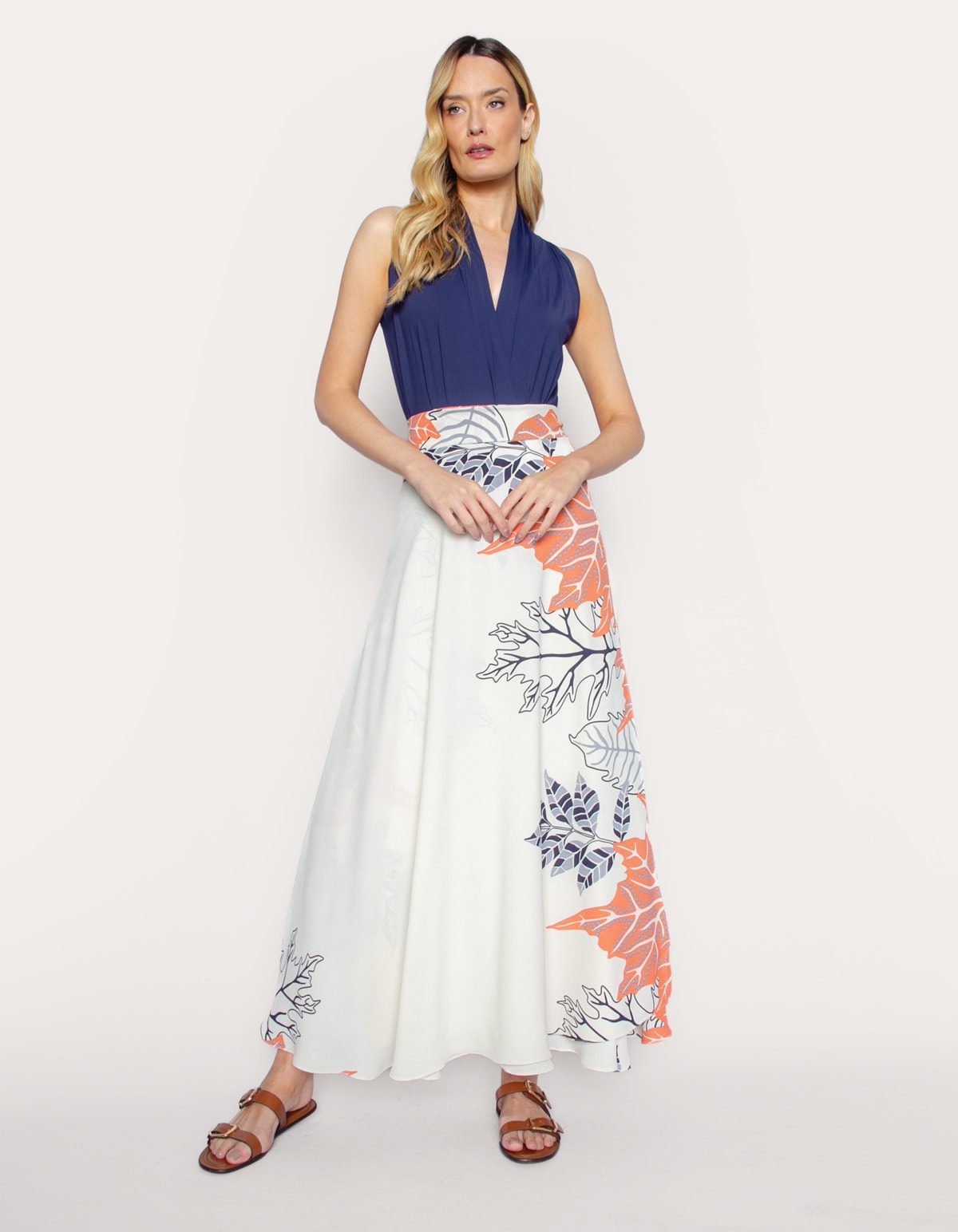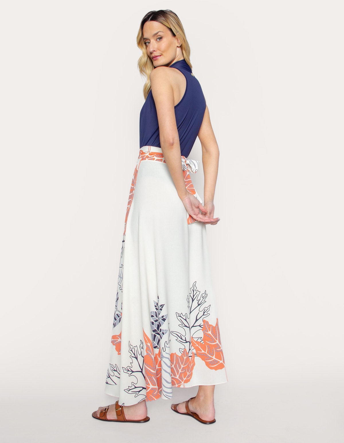 Saia longa, transpassada envelope. essa característica cria um efeito de elegância e estilo único na peça.