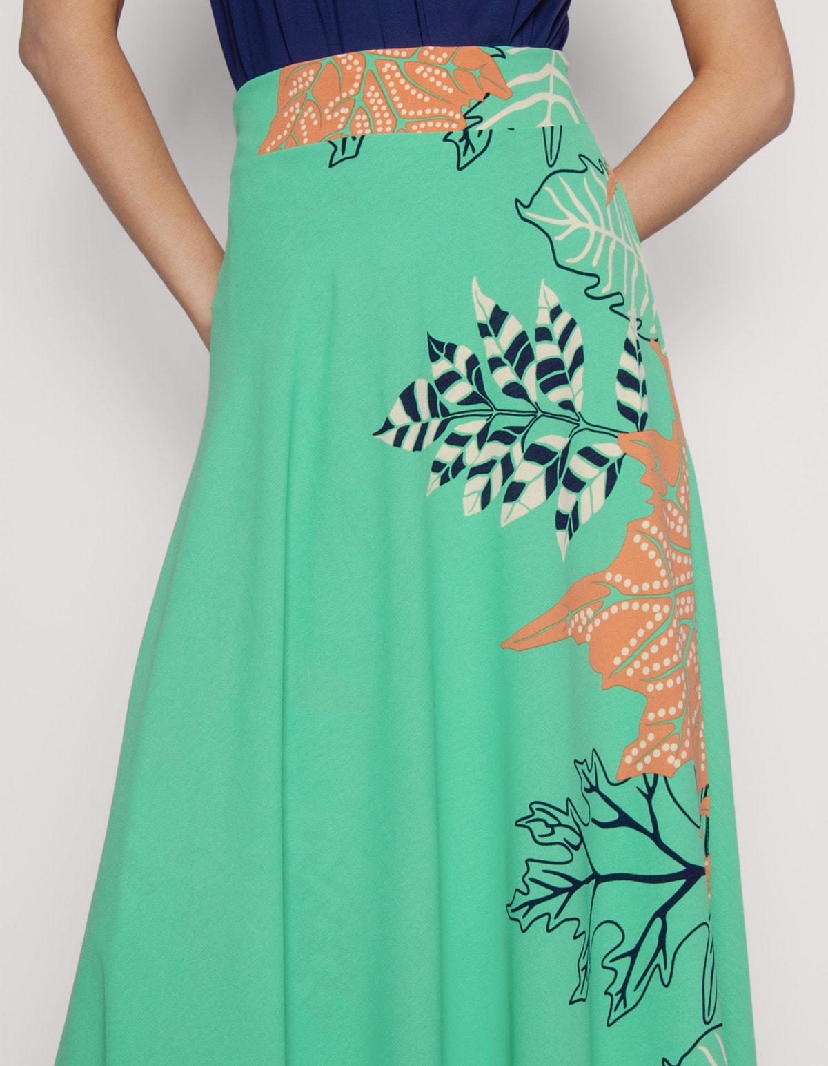 Saia longa, transpassada envelope. essa característica cria um efeito de elegância e estilo único na peça.