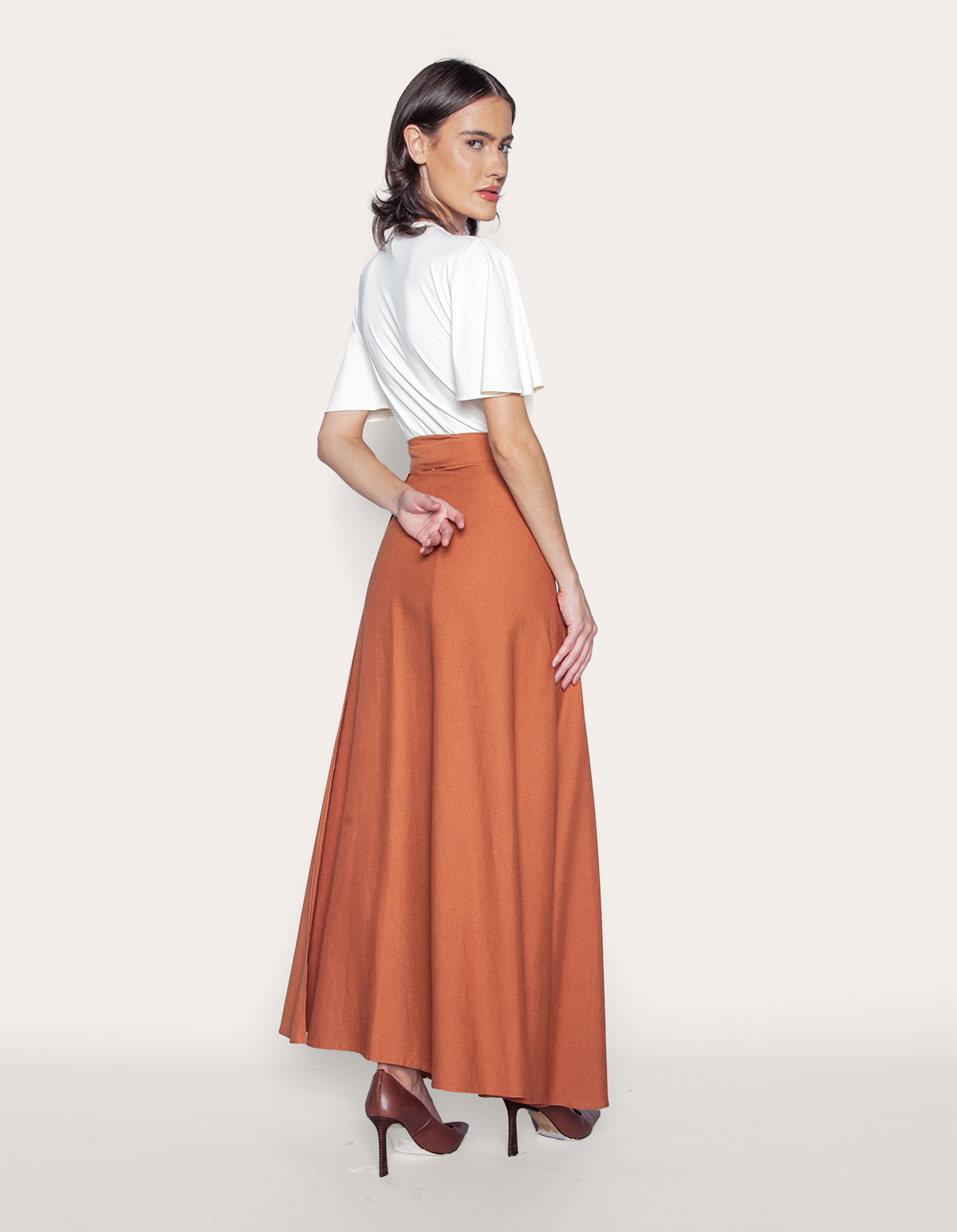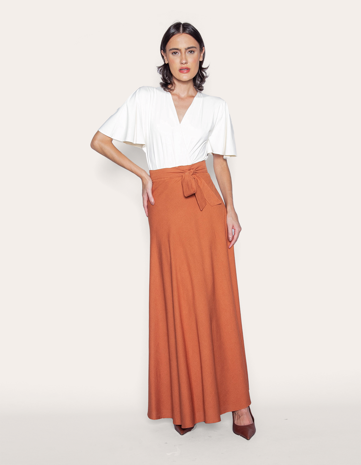 Saia longa transpassada linho. É a escolha perfeita para mulheres que buscam uma peça versátil, sofisticada e atemporal.
