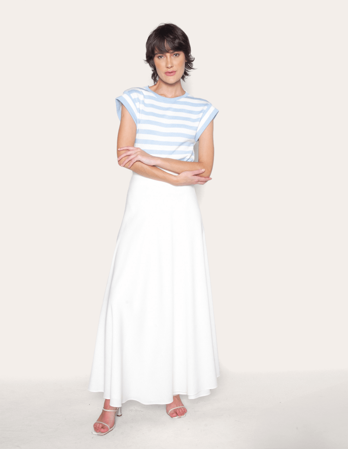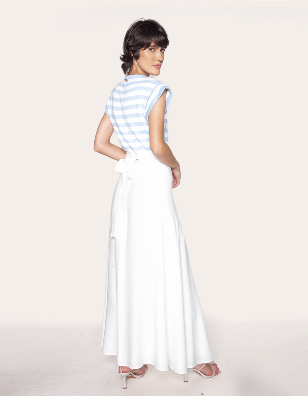 Saia longa transpassada linho. É a escolha perfeita para mulheres que buscam uma peça versátil, sofisticada e atemporal.