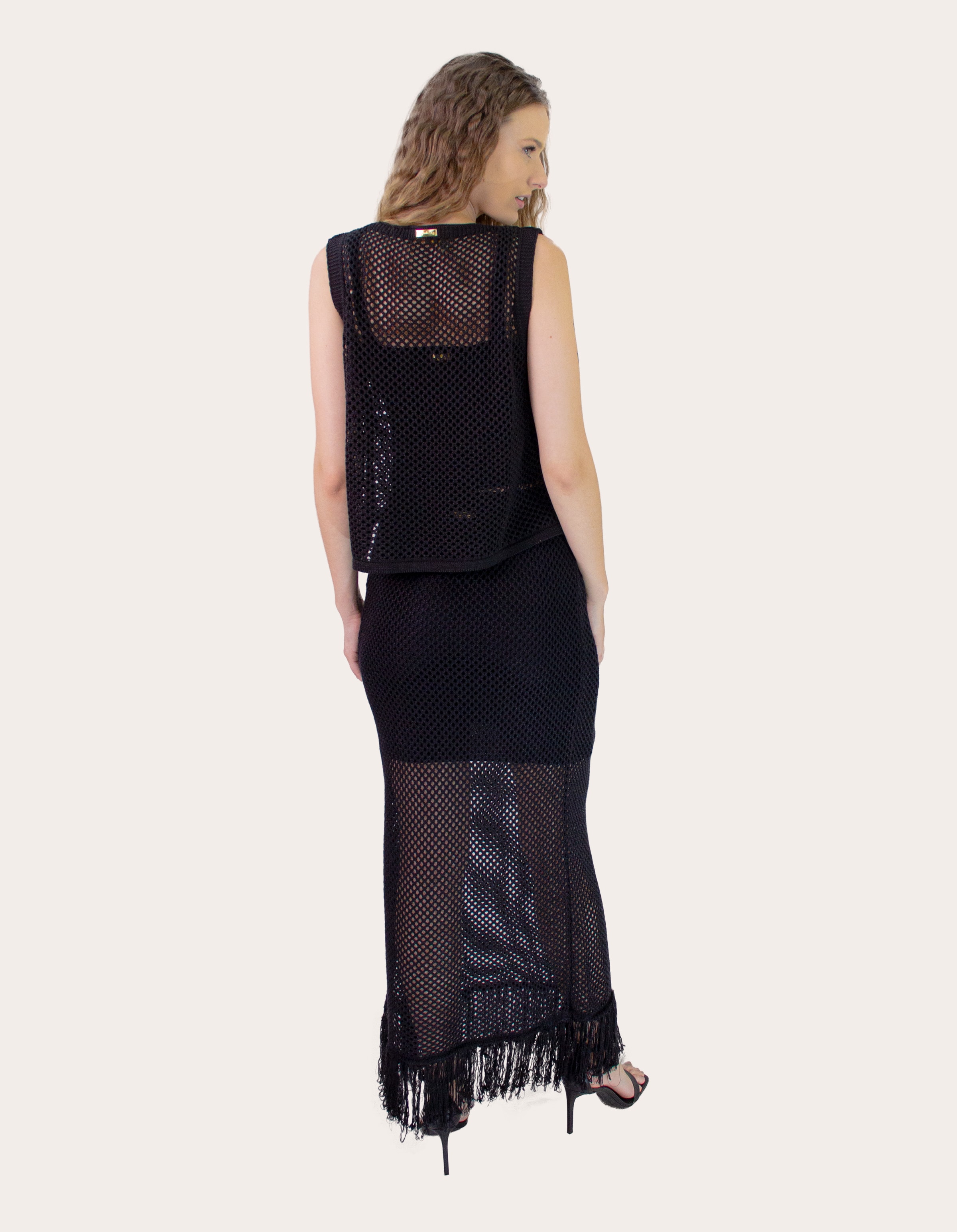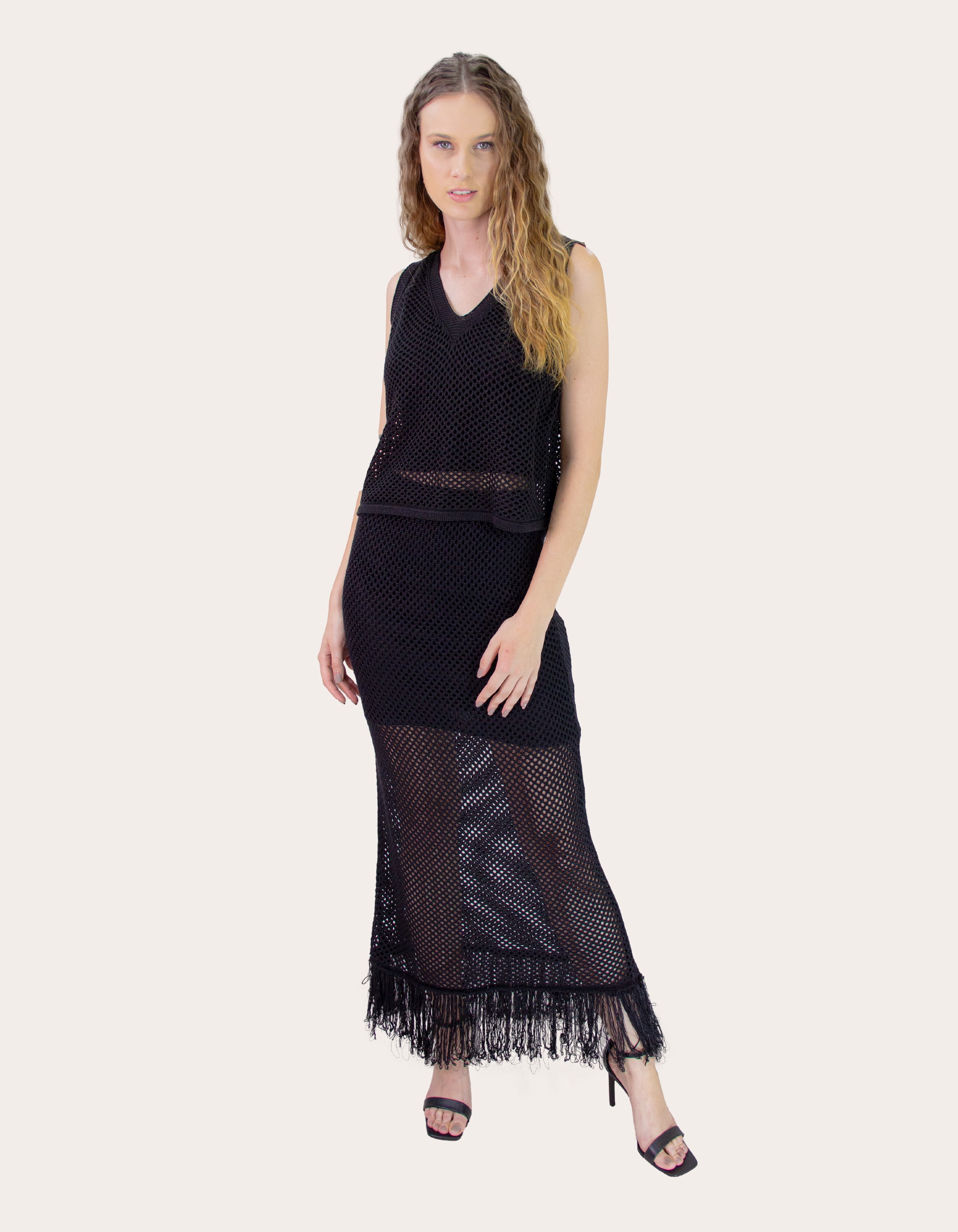 Saia longa tricot com cós de elástico largo. o modelo possui modelagem reta e acabamento de franjinhas finalizando o barrado. combine com uma blusa de tom neutro para um visual harmônico ou ouse com blusa estampada para um conceito vibrante.