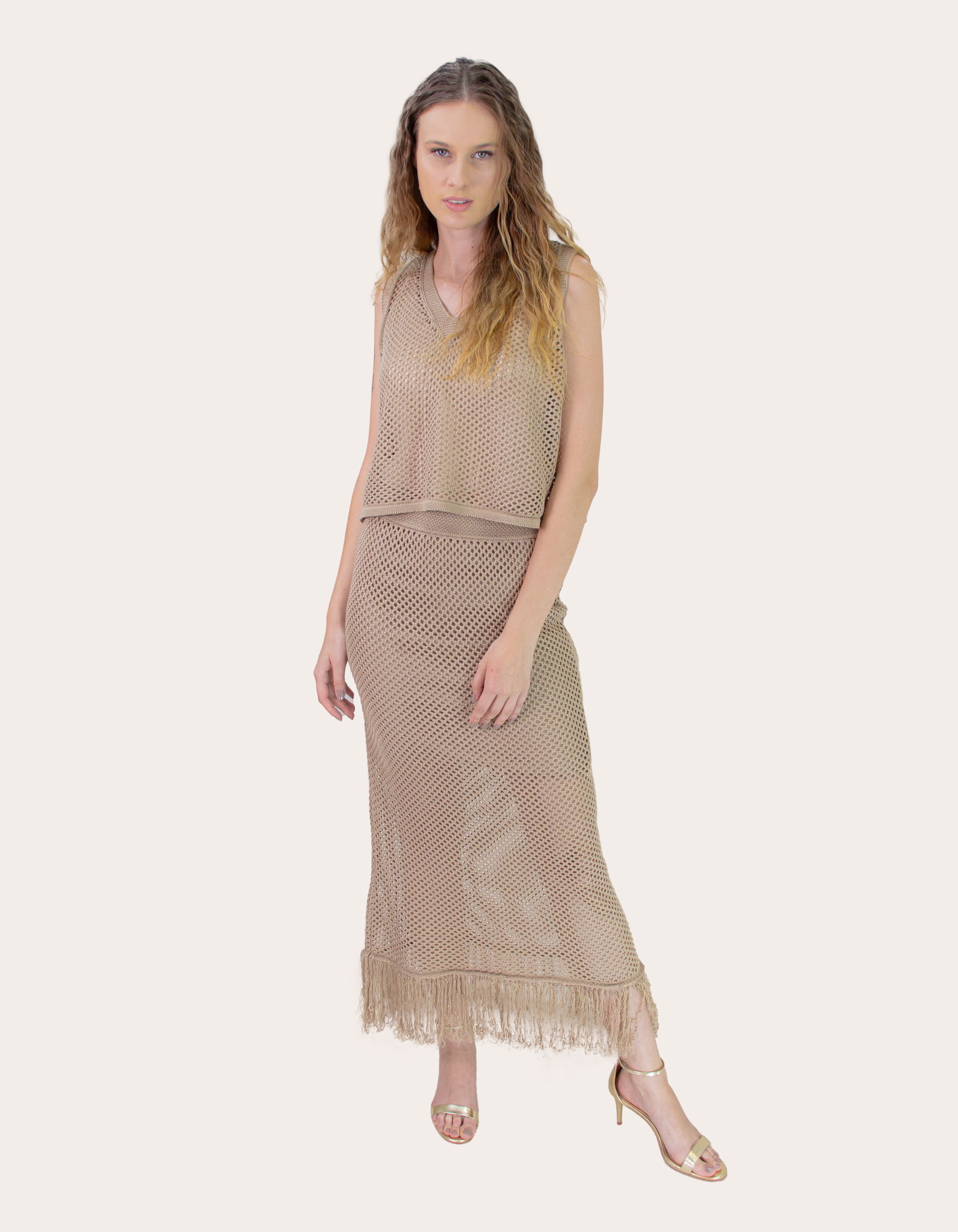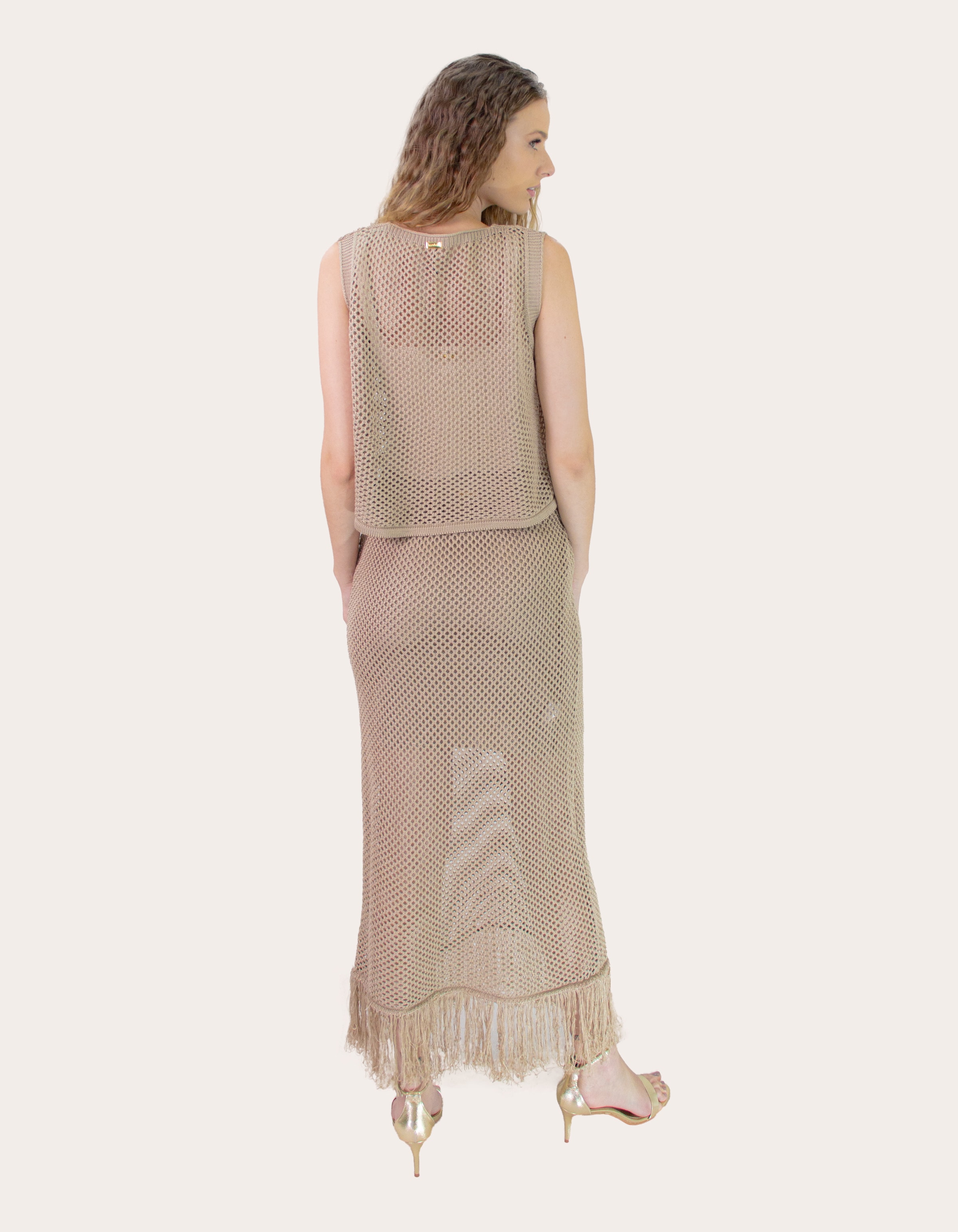 Saia longa tricot com cós de elástico largo. o modelo possui modelagem reta e acabamento de franjinhas finalizando o barrado. combine com uma blusa de tom neutro para um visual harmônico ou ouse com blusa estampada para um conceito vibrante.
